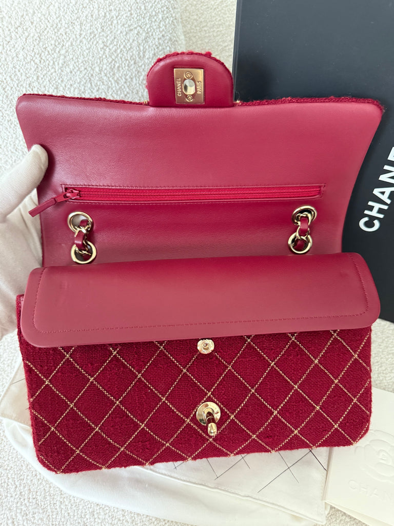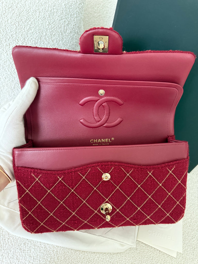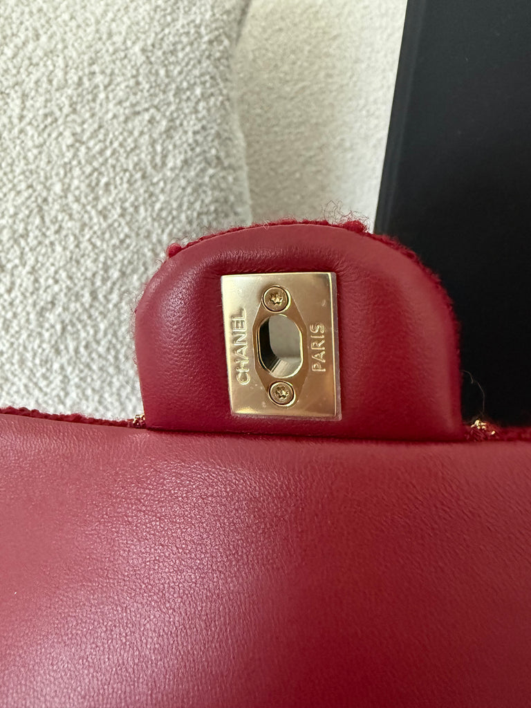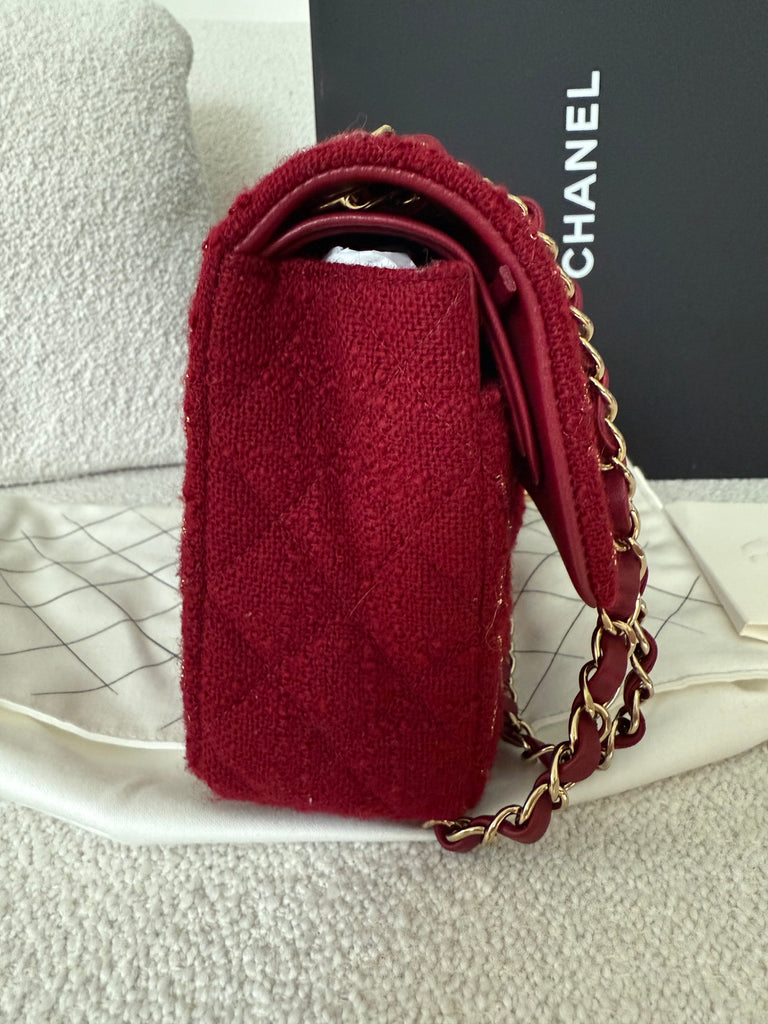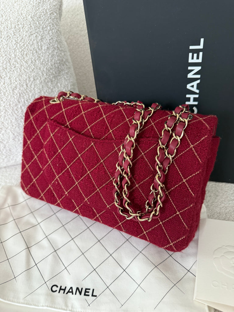 Borsa a spalla Chanel modello iconico Timeless misura Media 25 cm in tweed rosso con lavorazione micro catena frontale e metalleria champagne. Anno 2024