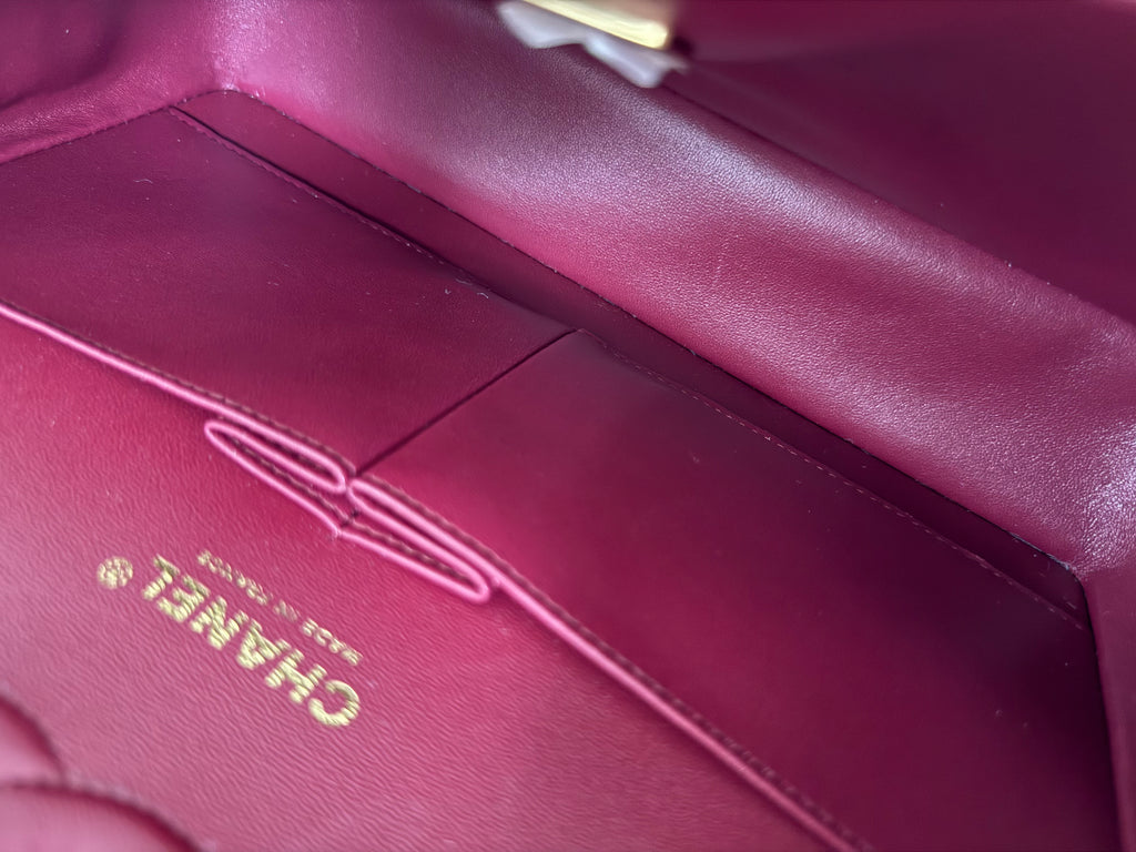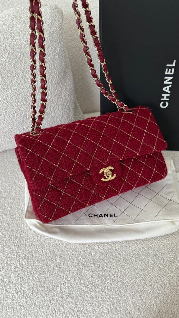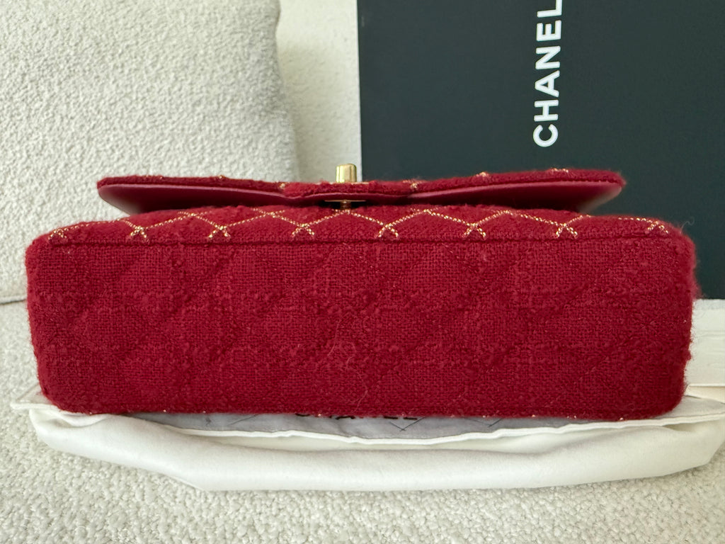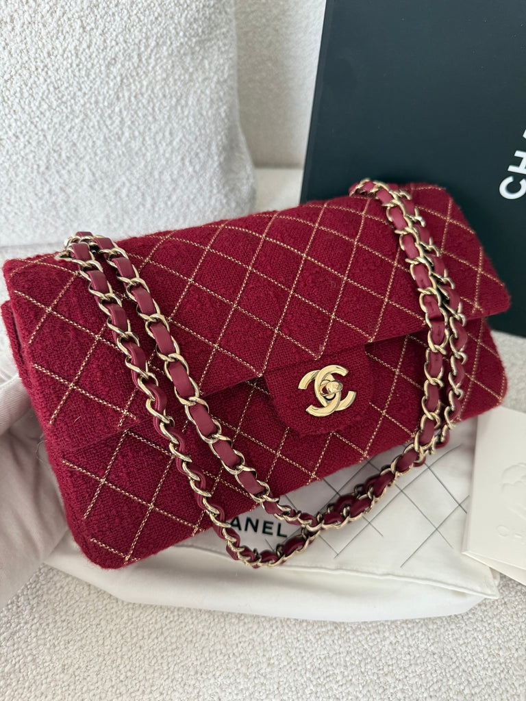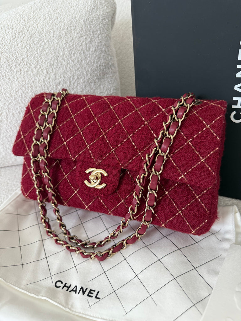 Borsa a spalla Chanel modello iconico Timeless misura Media 25 cm in tweed rosso con lavorazione micro catena frontale e metalleria champagne. Anno 2024