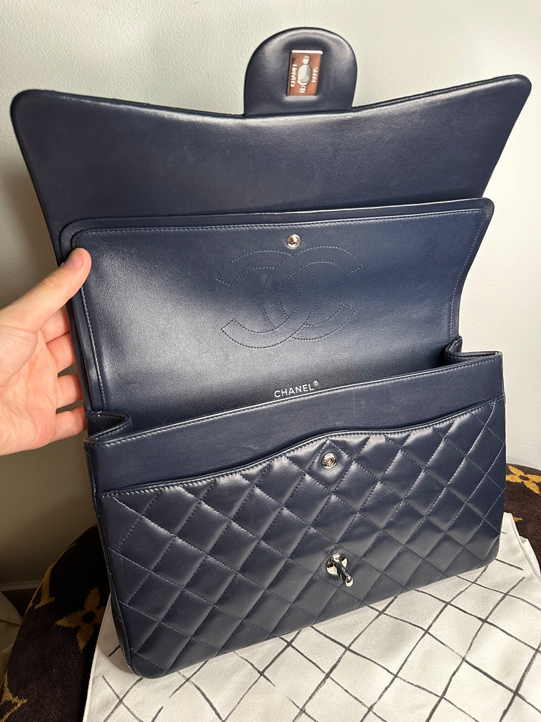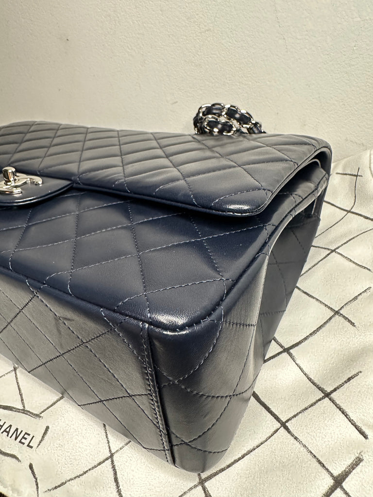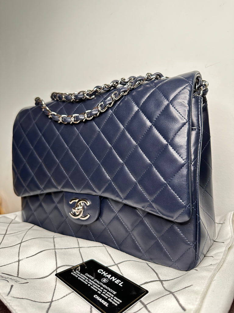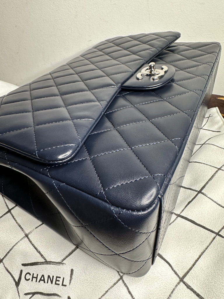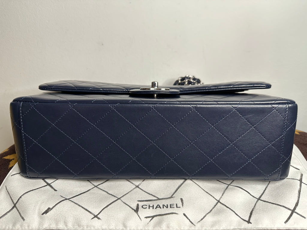 Borsa classica a spalla Chanel modello Maxi Jumbo in pelle d'agnello blu notte e metalleria palladio.