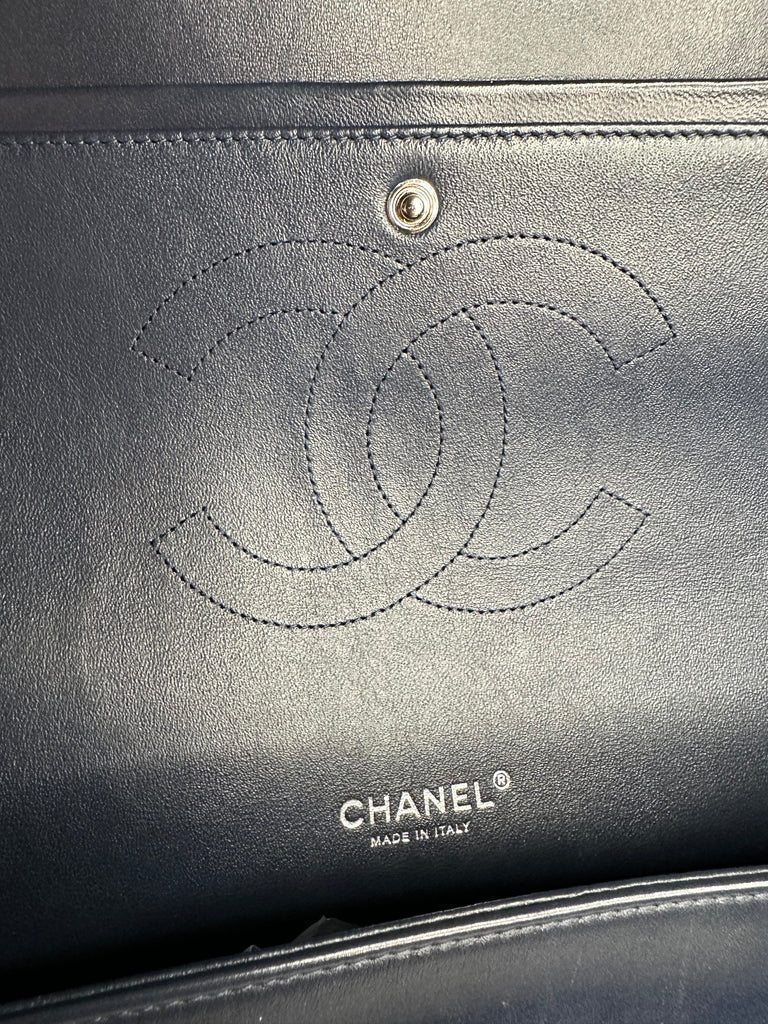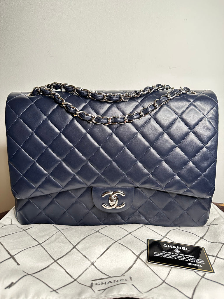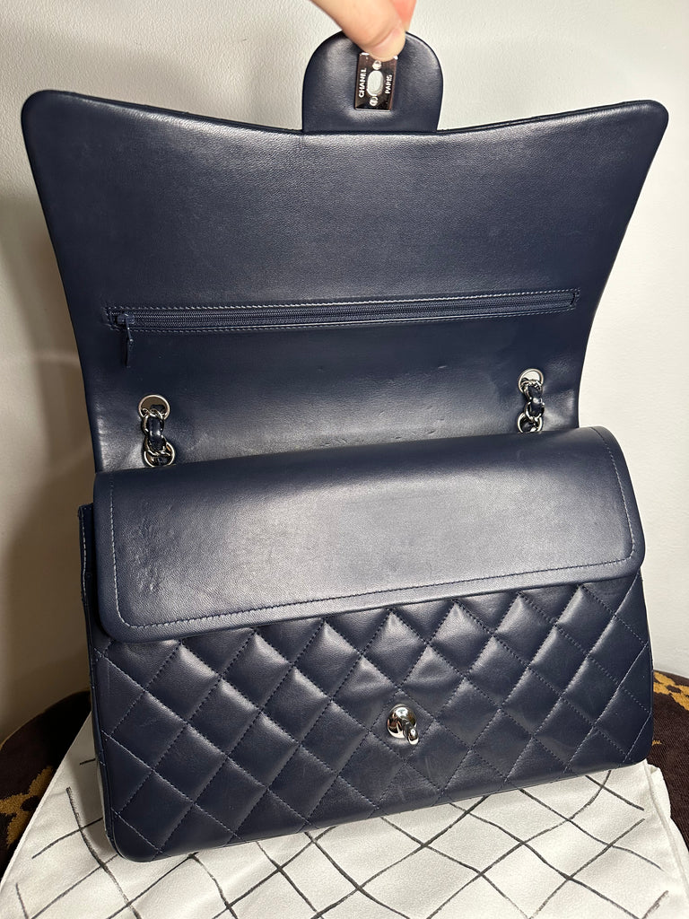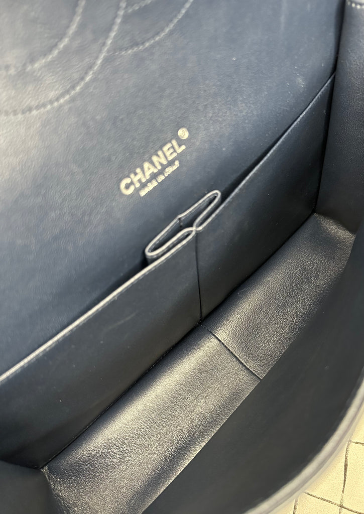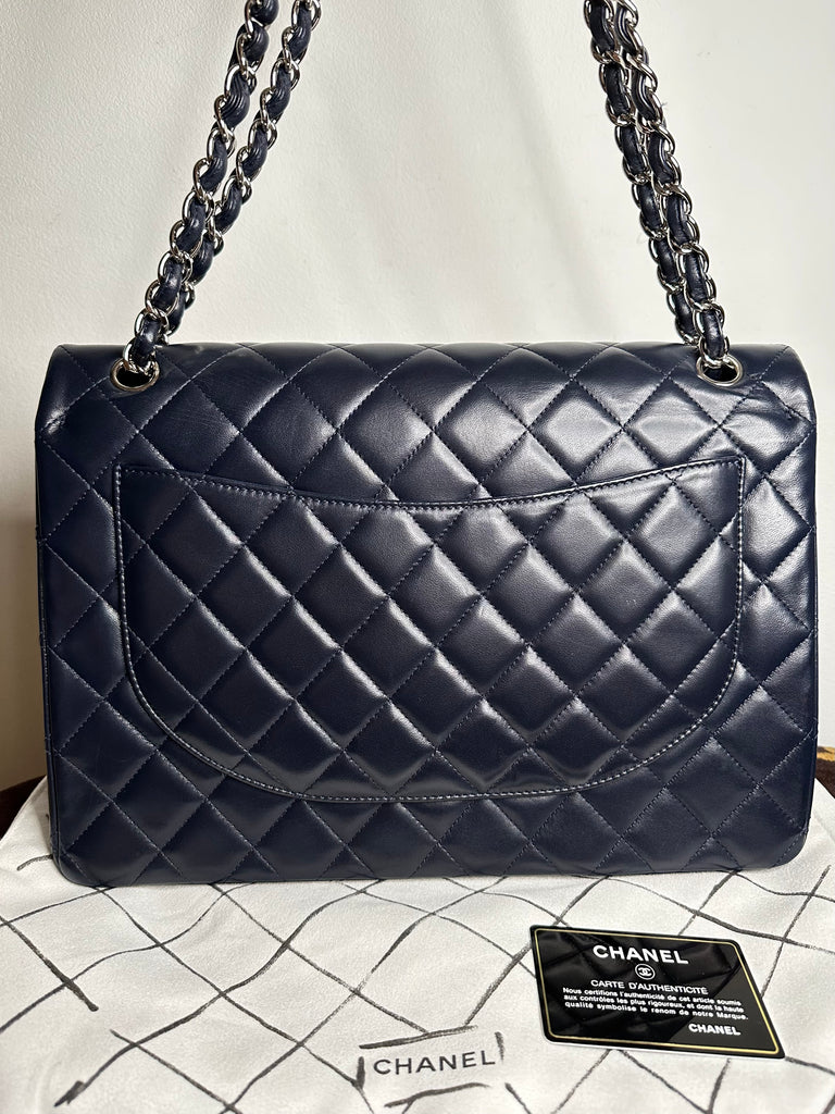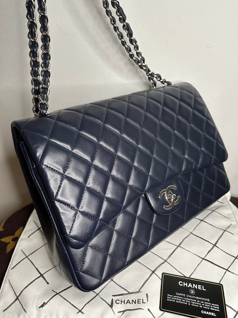 Borsa classica a spalla Chanel modello Maxi Jumbo in pelle d'agnello blu notte e metalleria palladio.