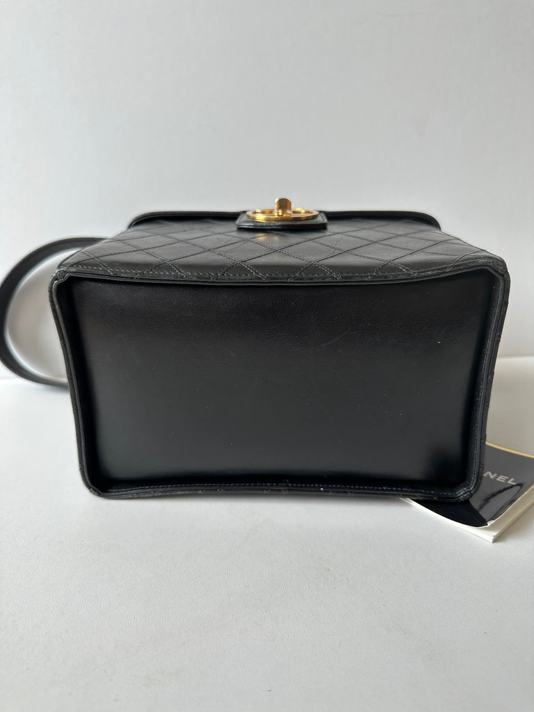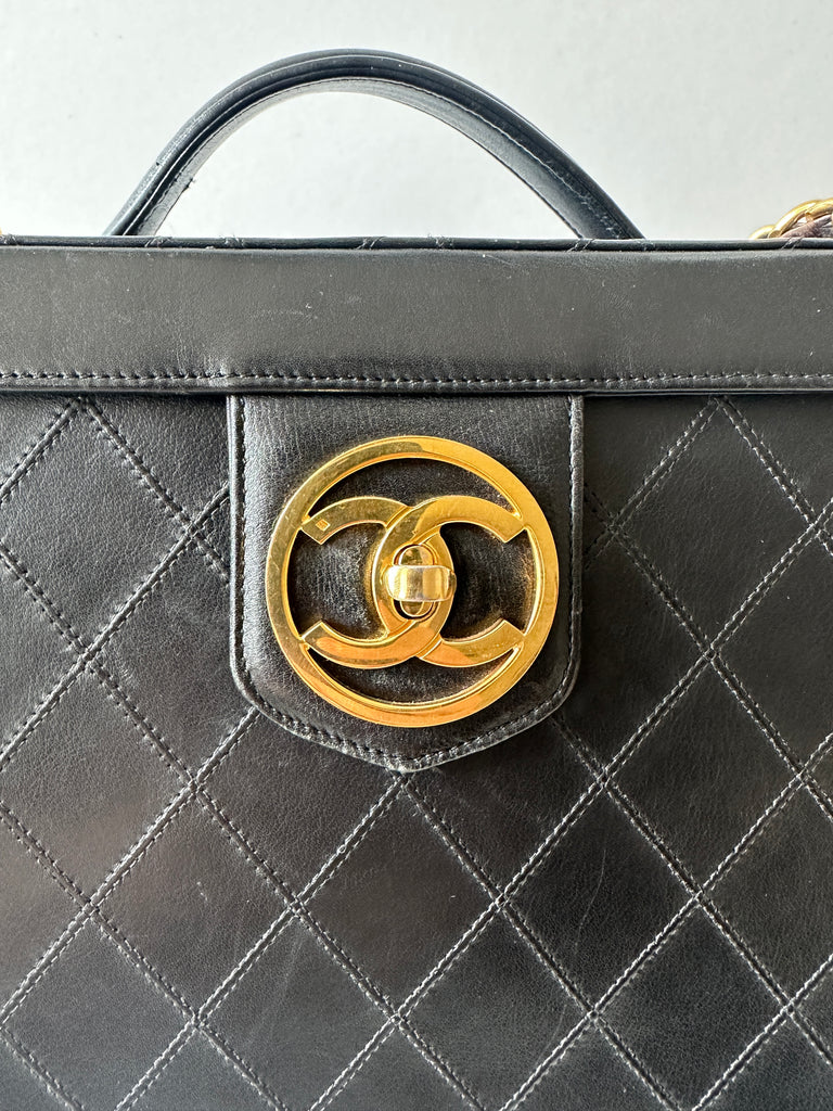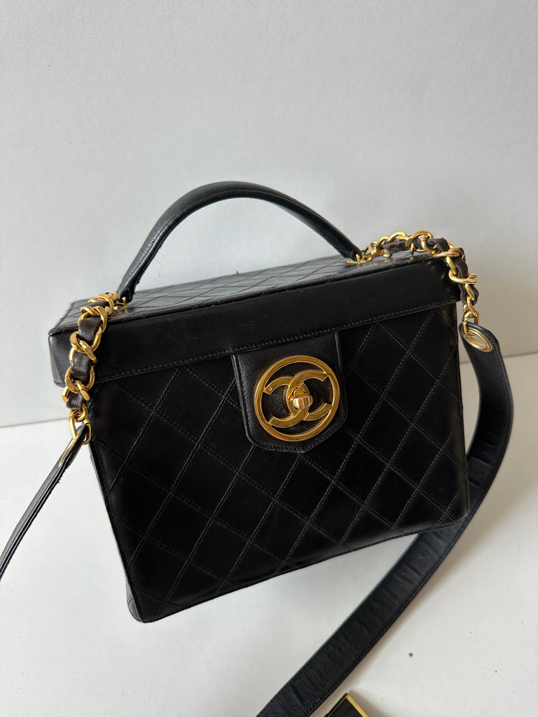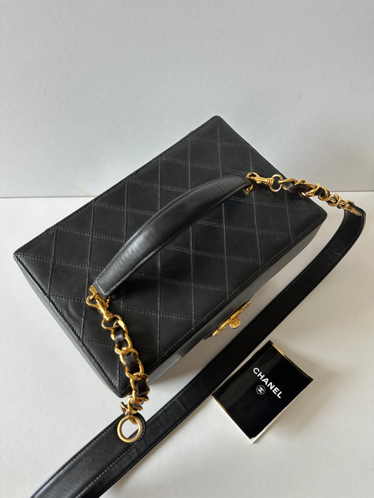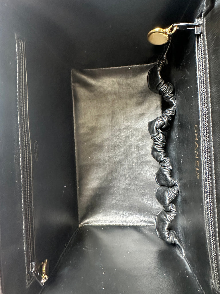 Borsa Chanel con manico e tracolla amovibile modello Trousse Vintage in pelle di agnello nero e dettagli metallici dorati. Anni 90
