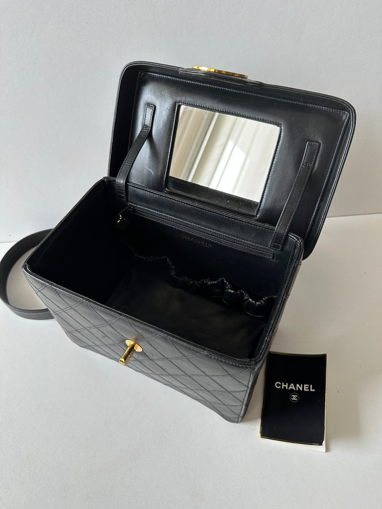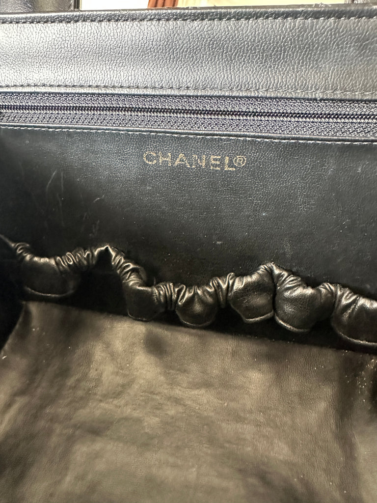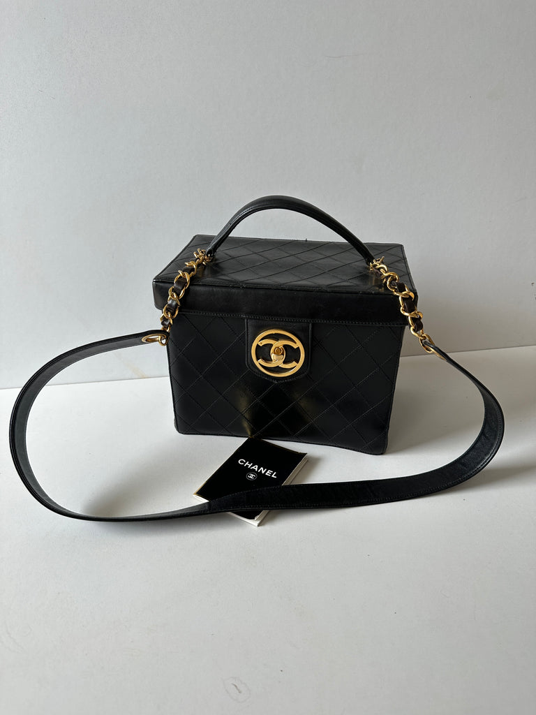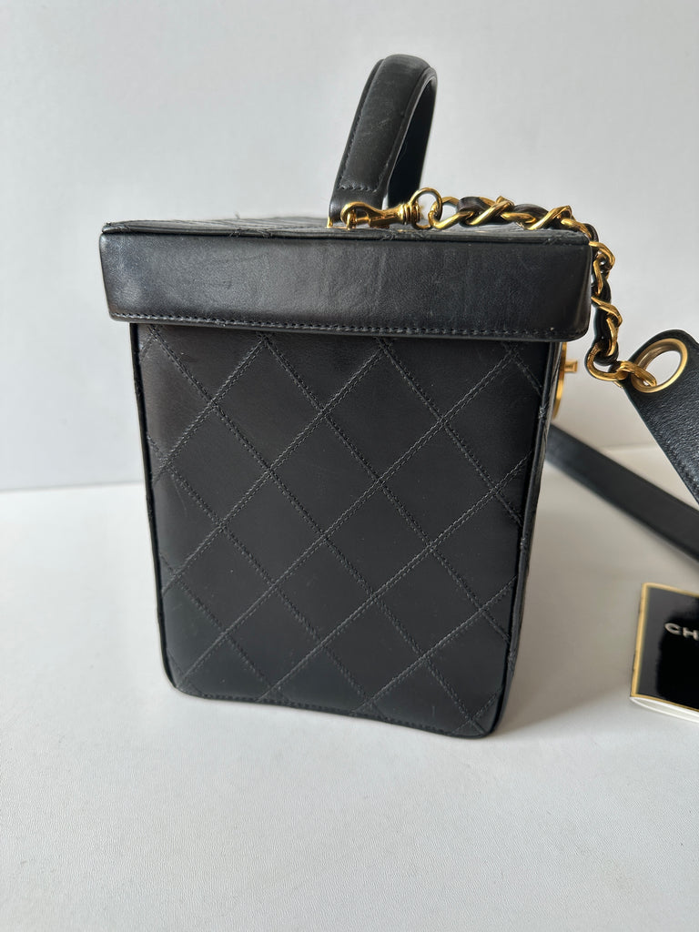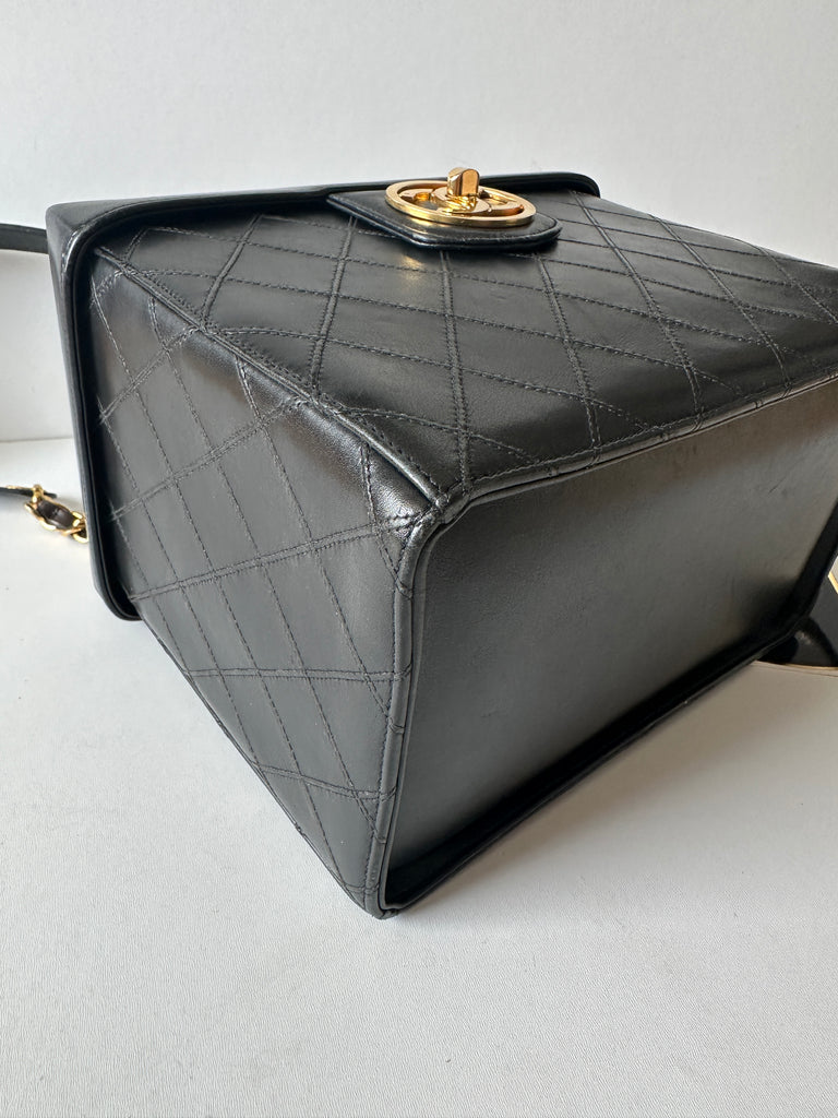 Borsa Chanel con manico e tracolla amovibile modello Trousse Vintage in pelle di agnello nero e dettagli metallici dorati. Anni 90