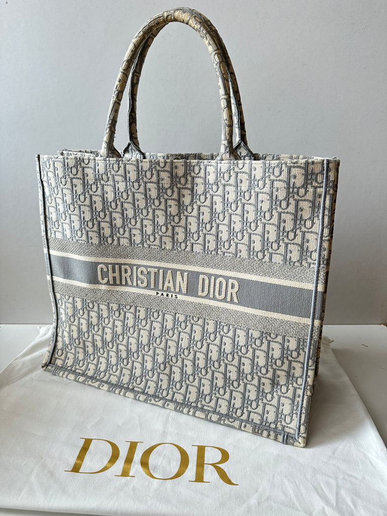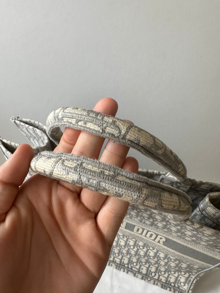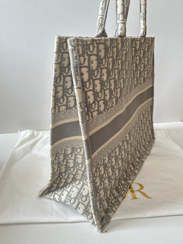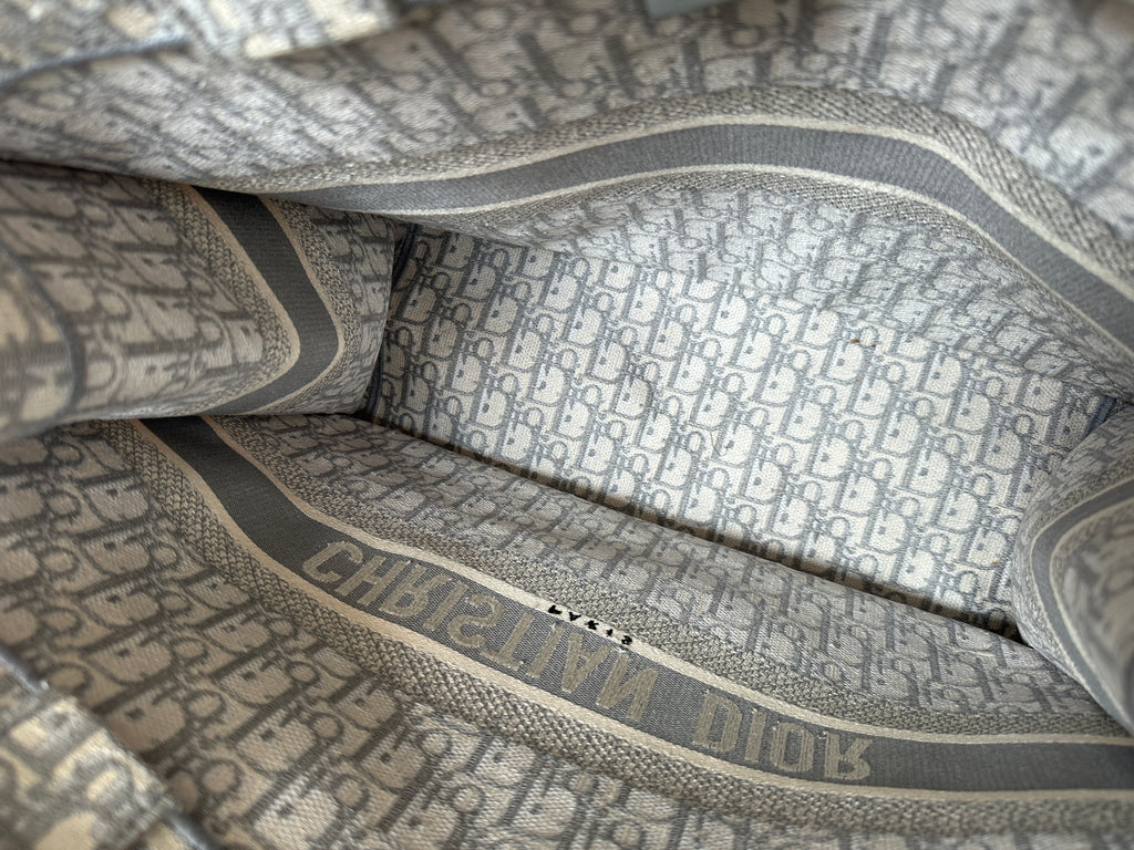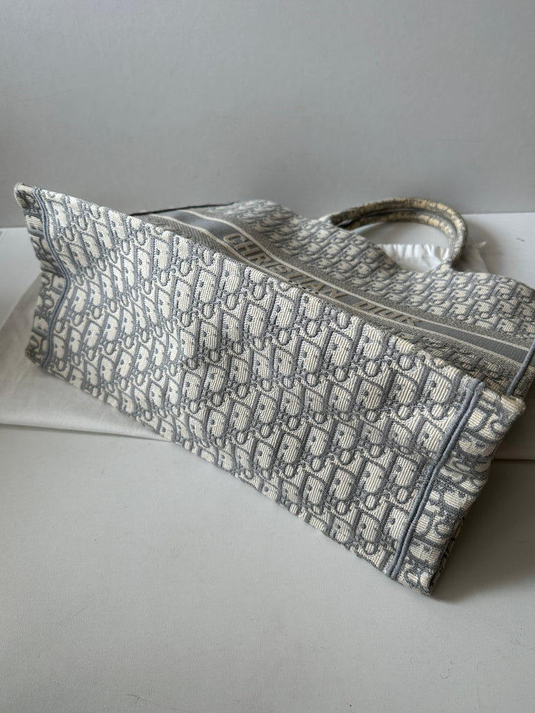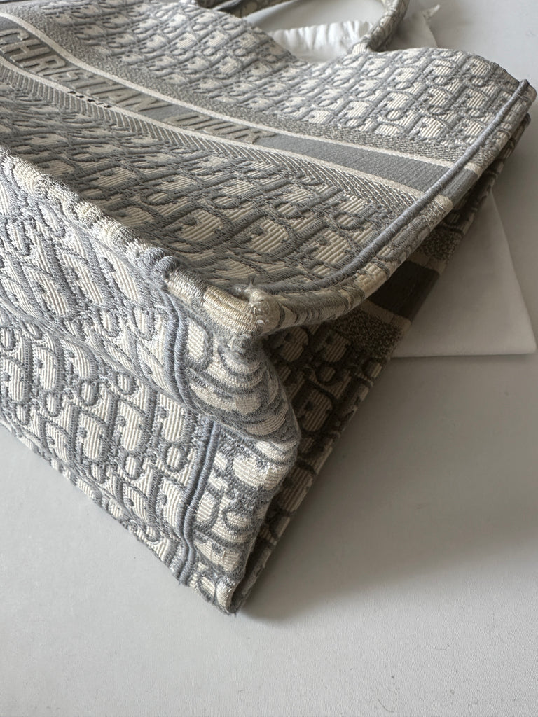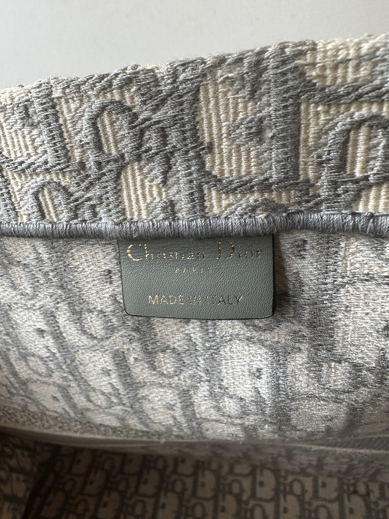 Borsa a mano Dior modello iconico Book Tote grande in tessuto ricamato Dior Oblique grigio.