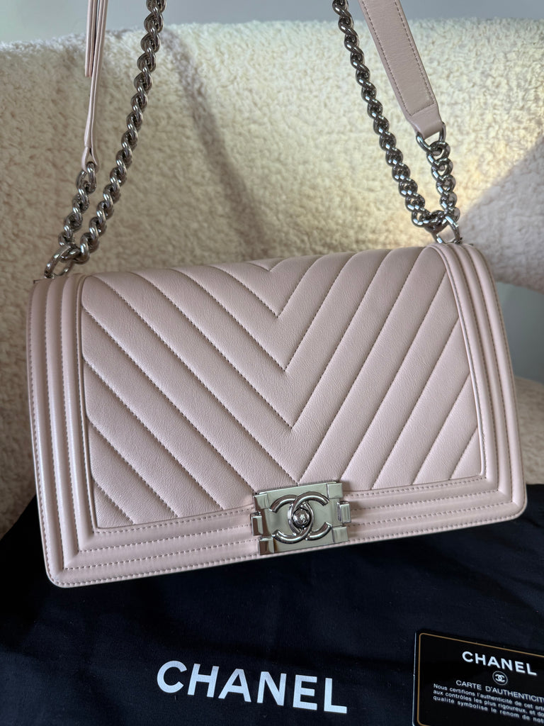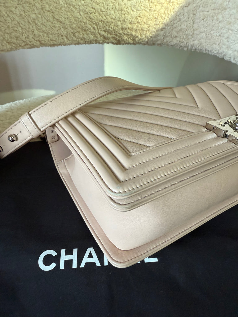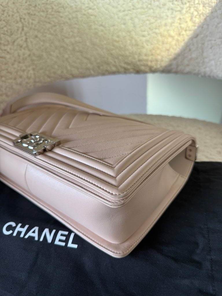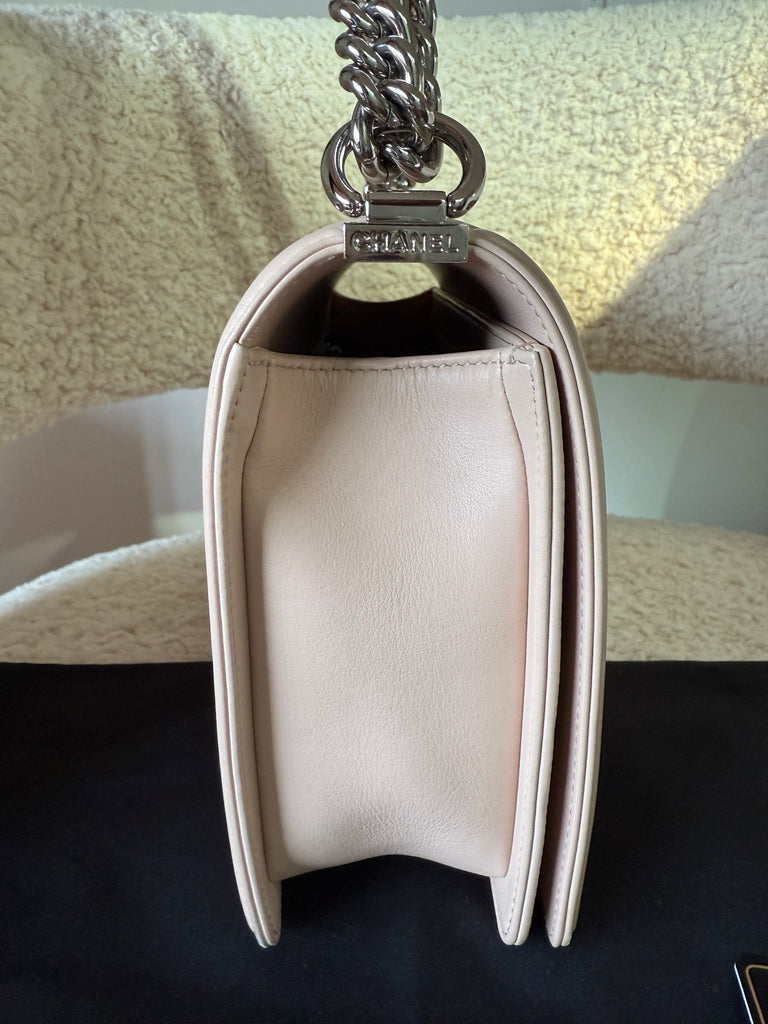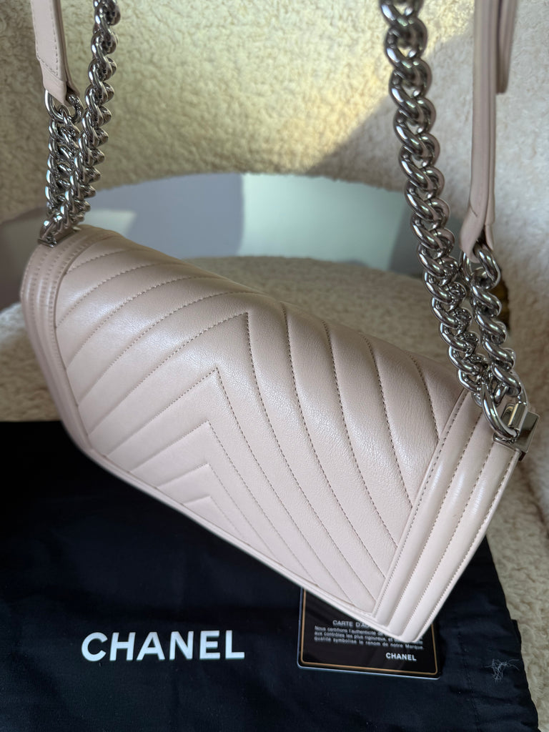 Borsa a spalla Chanel modello Boy Chevron New Medium in pelle d'agnello light pink e metalleria argento.