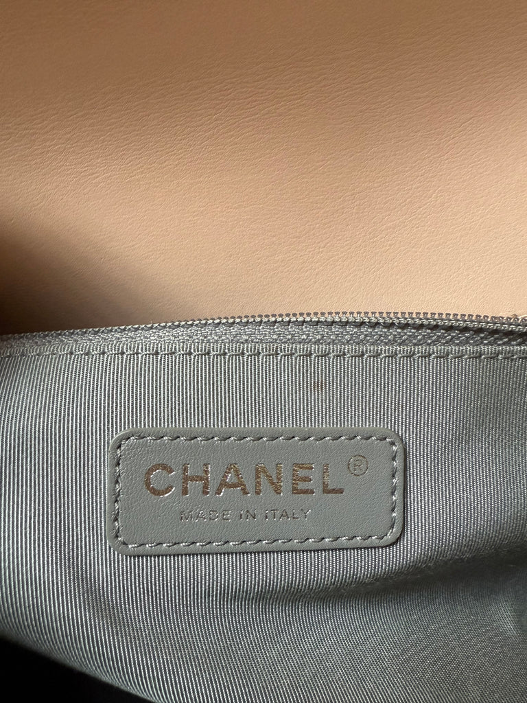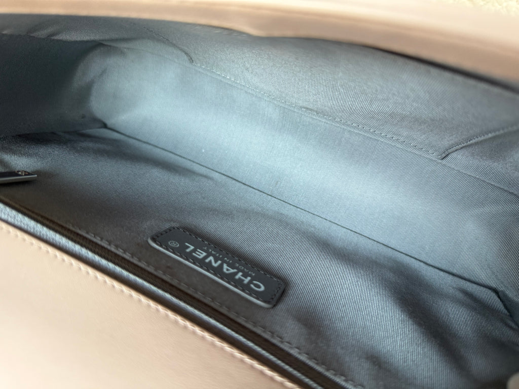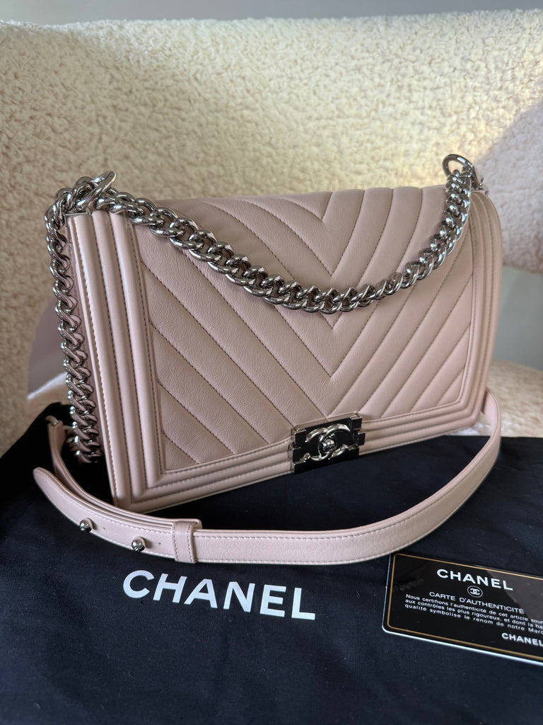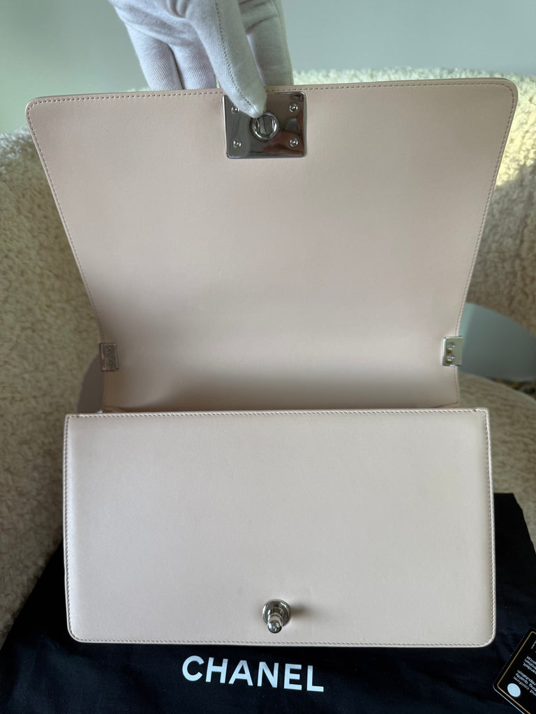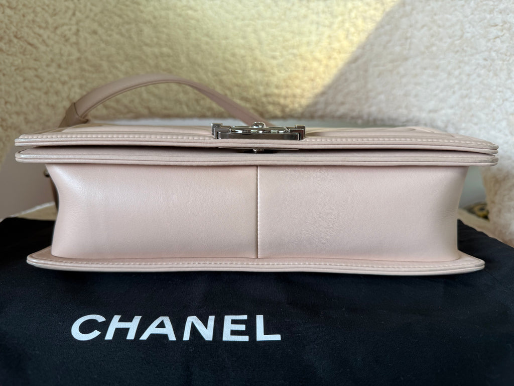 Borsa a spalla Chanel modello Boy Chevron New Medium in pelle d'agnello light pink e metalleria argento.