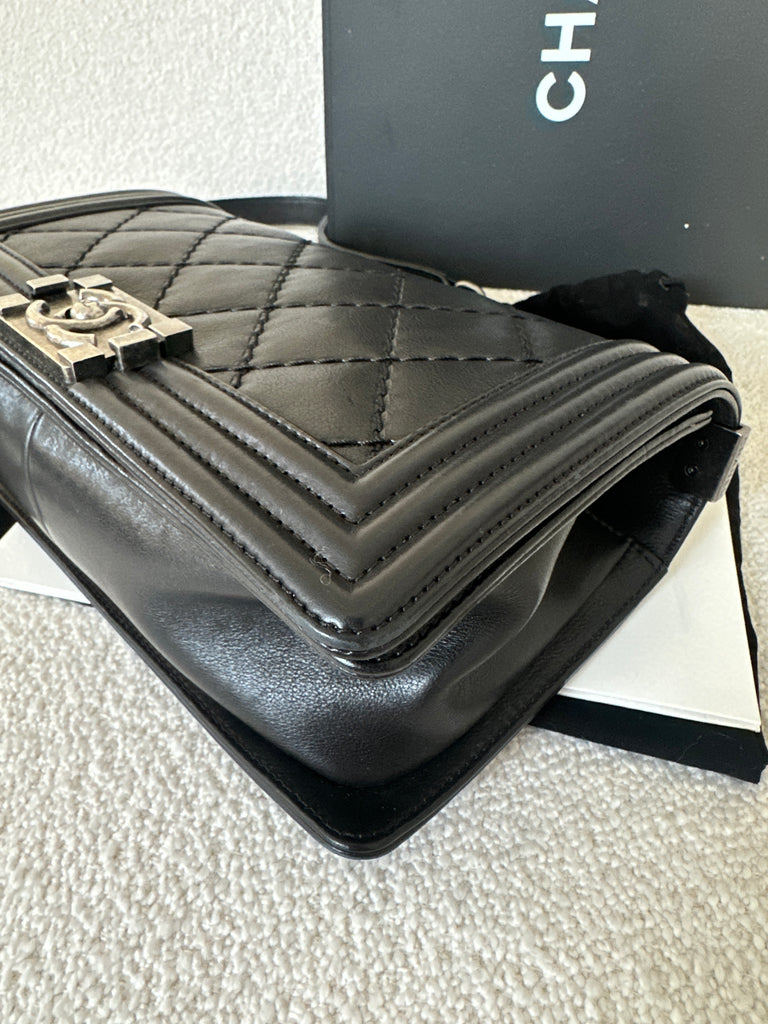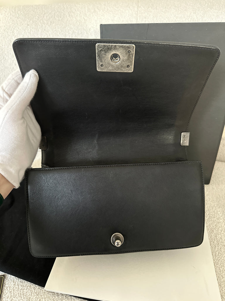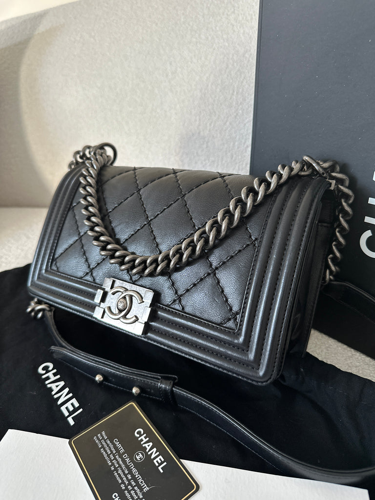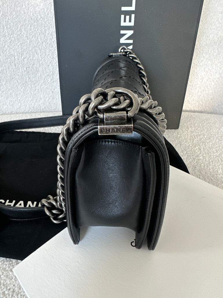 Borsa a spalla e a tracolla Chanel modello Boy Old Medium in pelle di agnello nera metalleria rutenio.