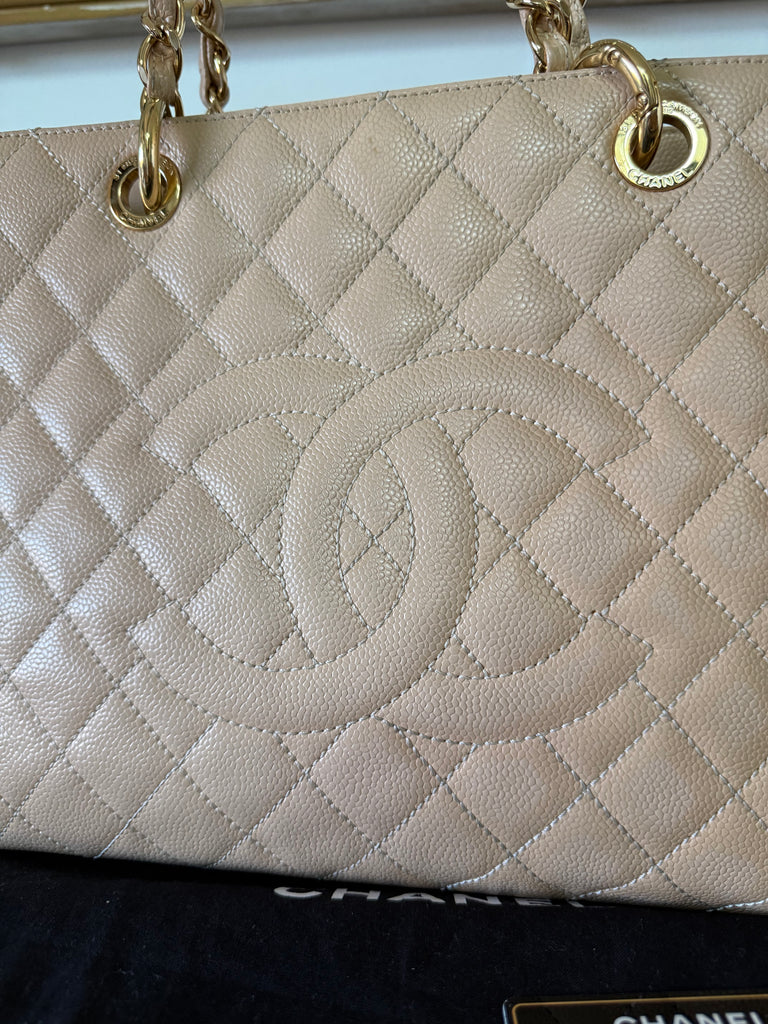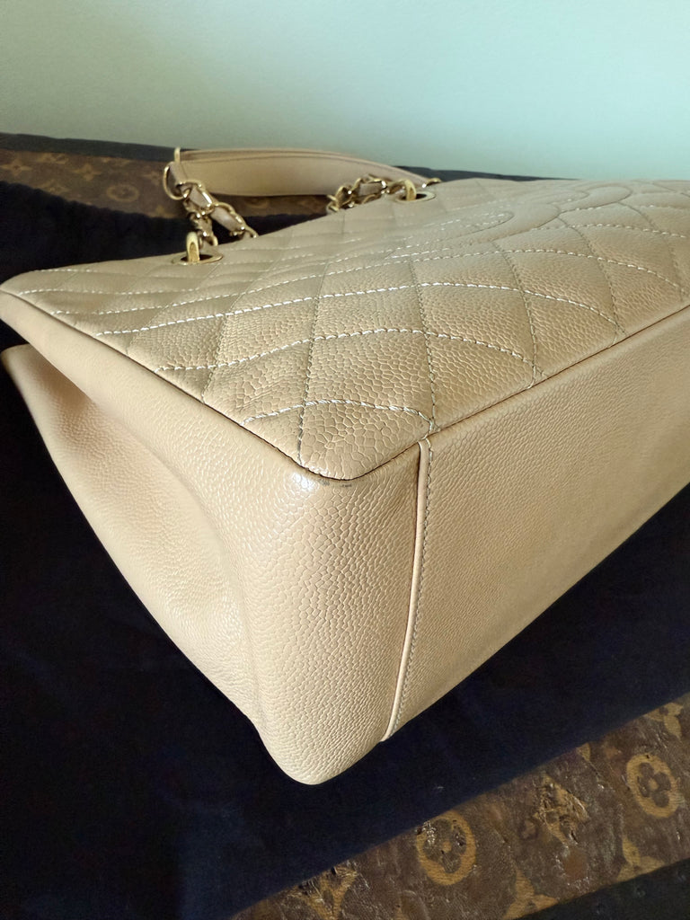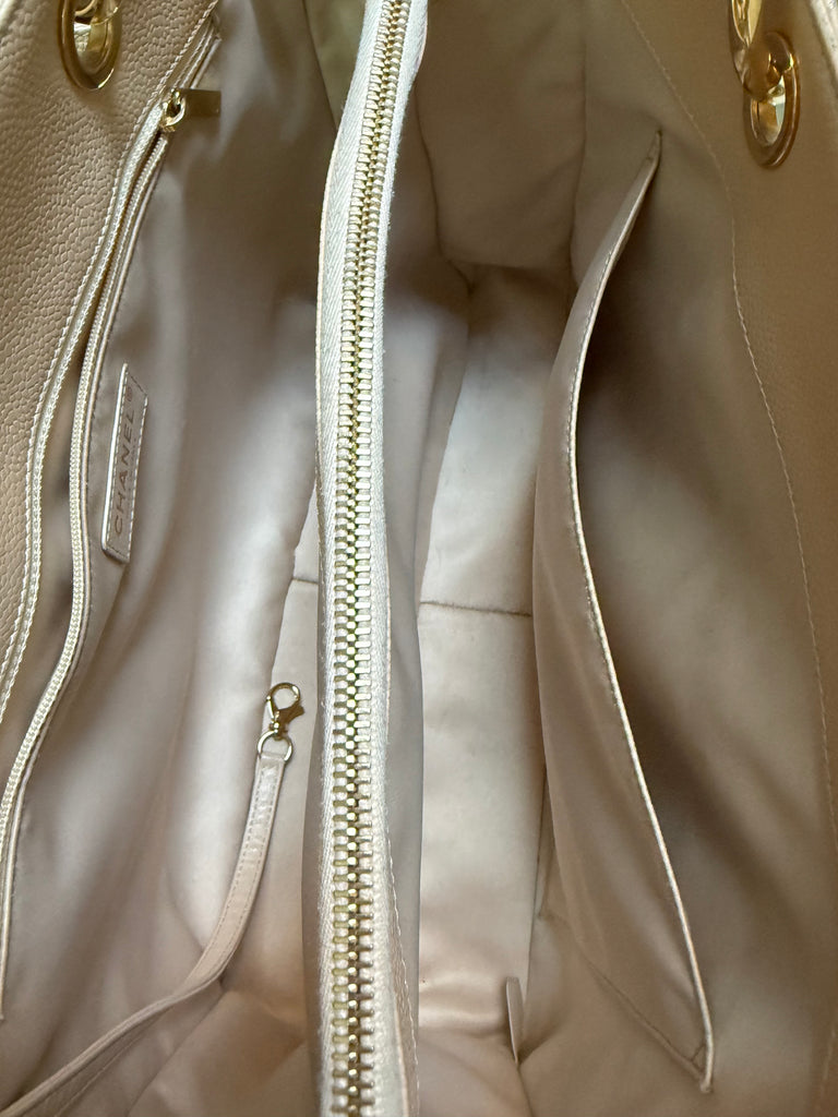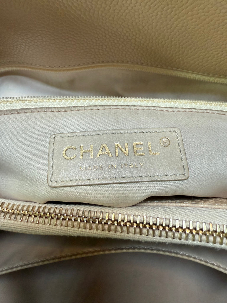 Borsa a spalla Chanel modello GST in pelle martellata beige e metalleria dorata.