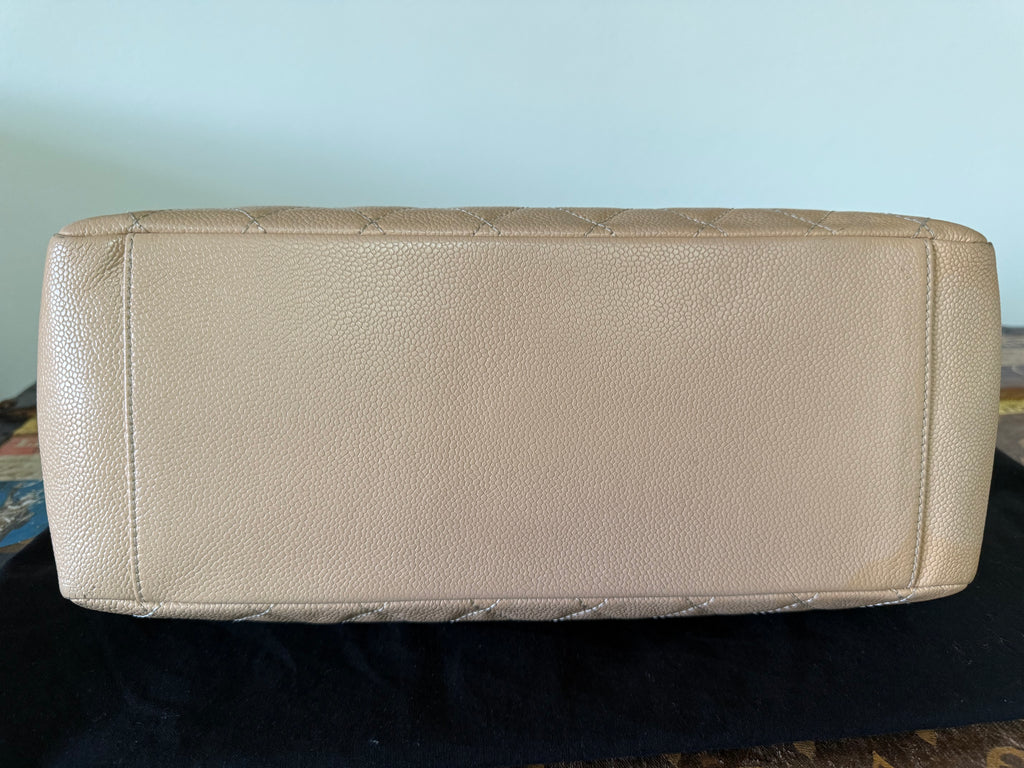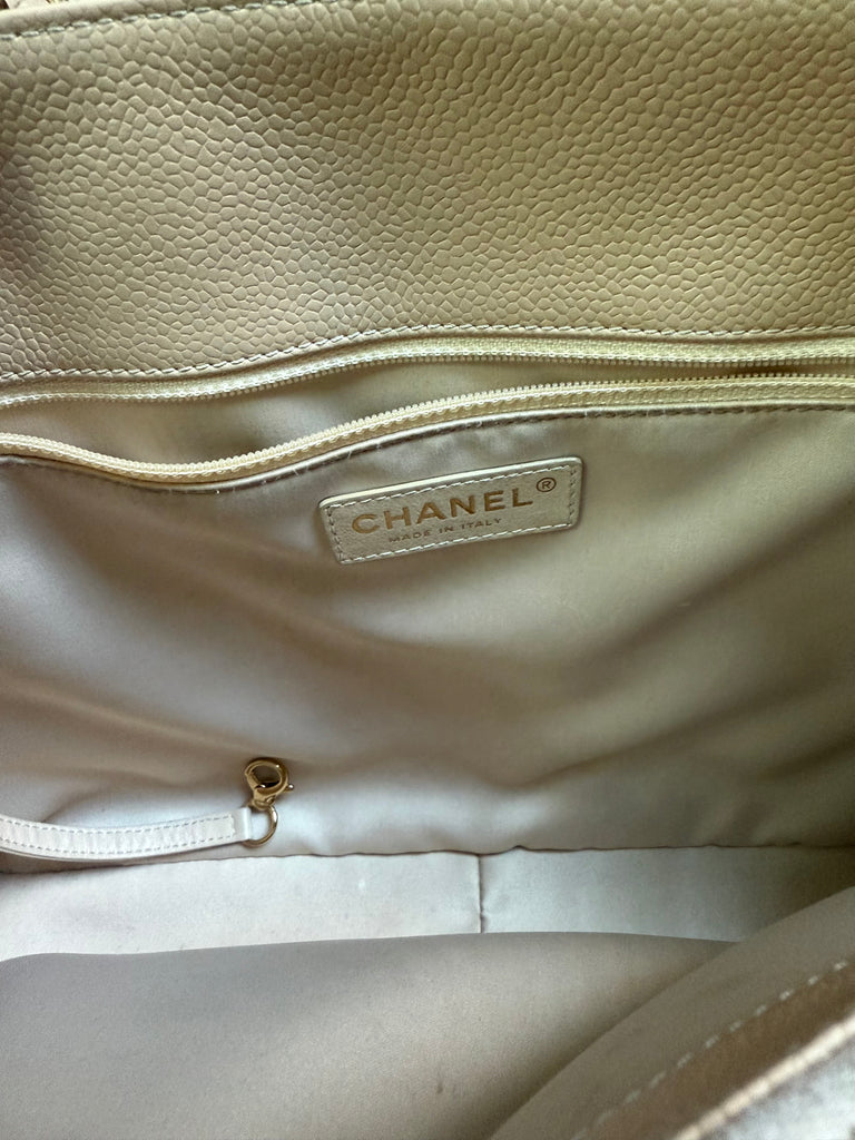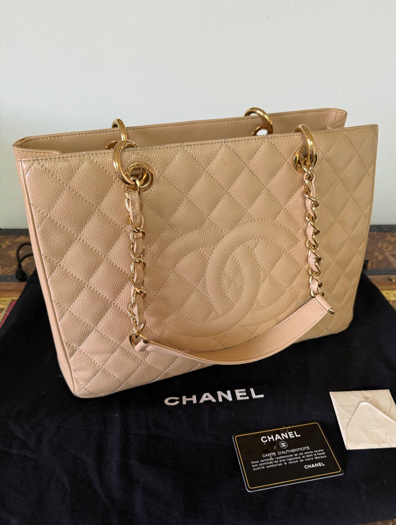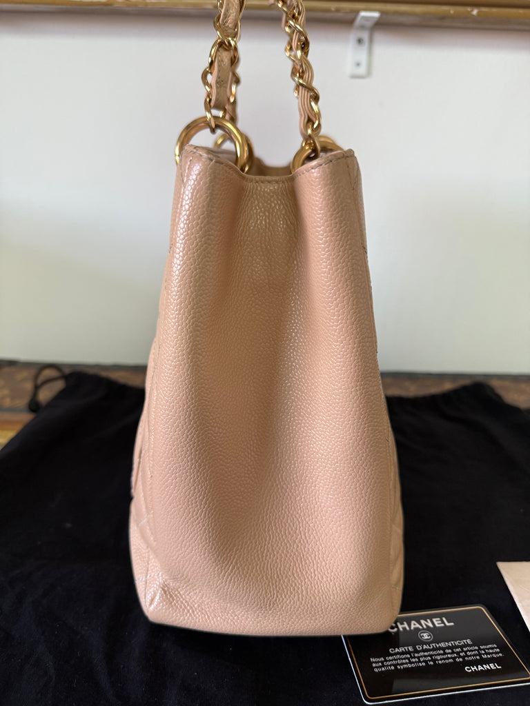 Borsa a spalla Chanel modello GST in pelle martellata beige e metalleria dorata.