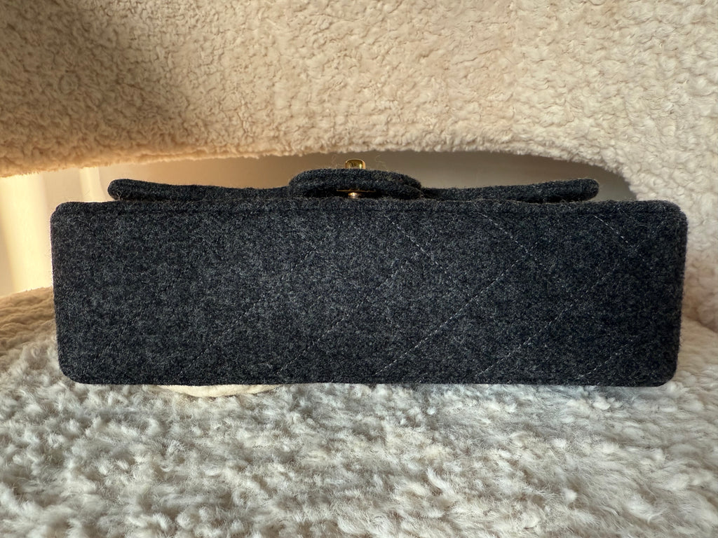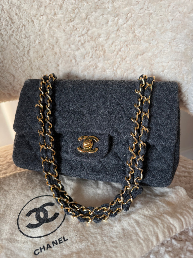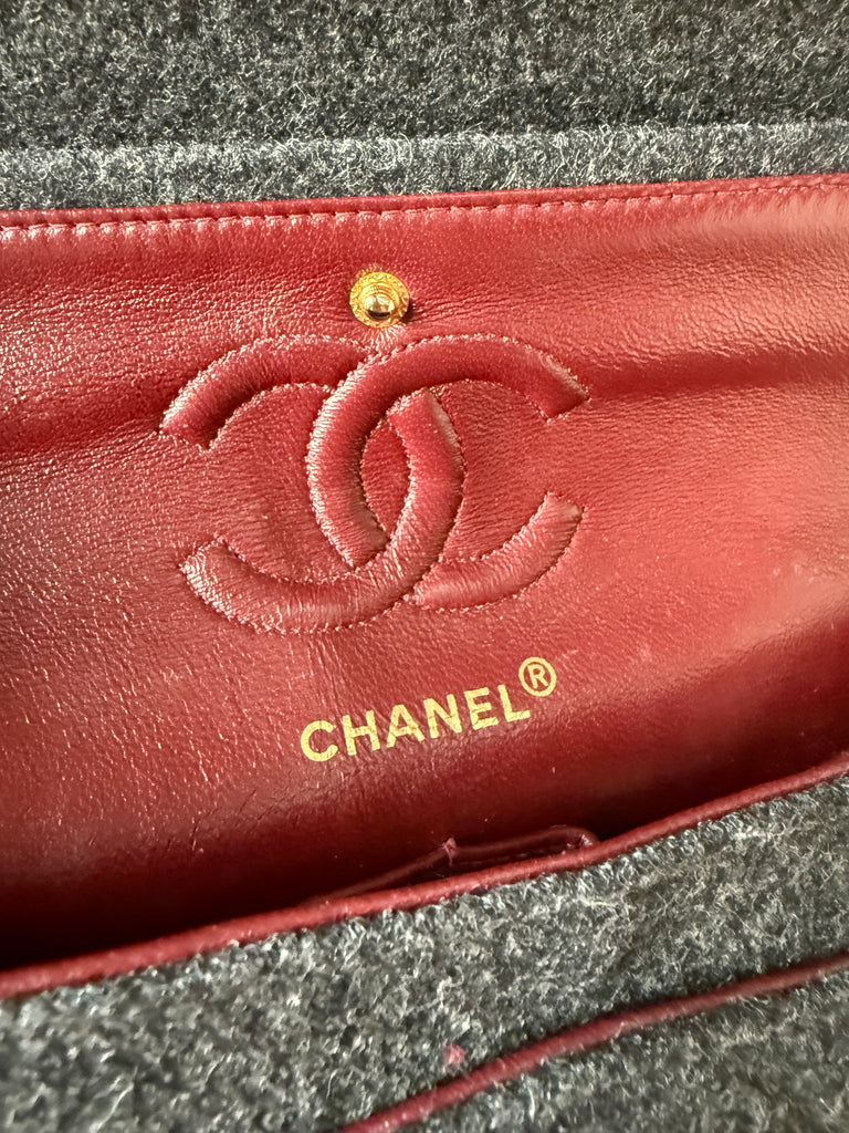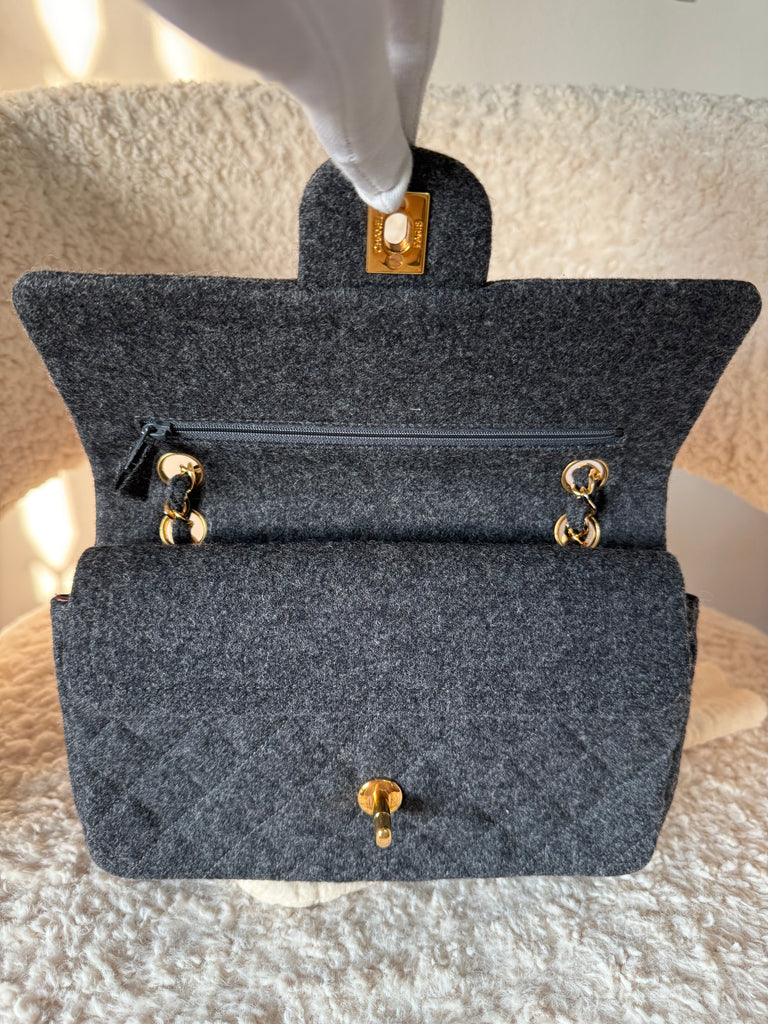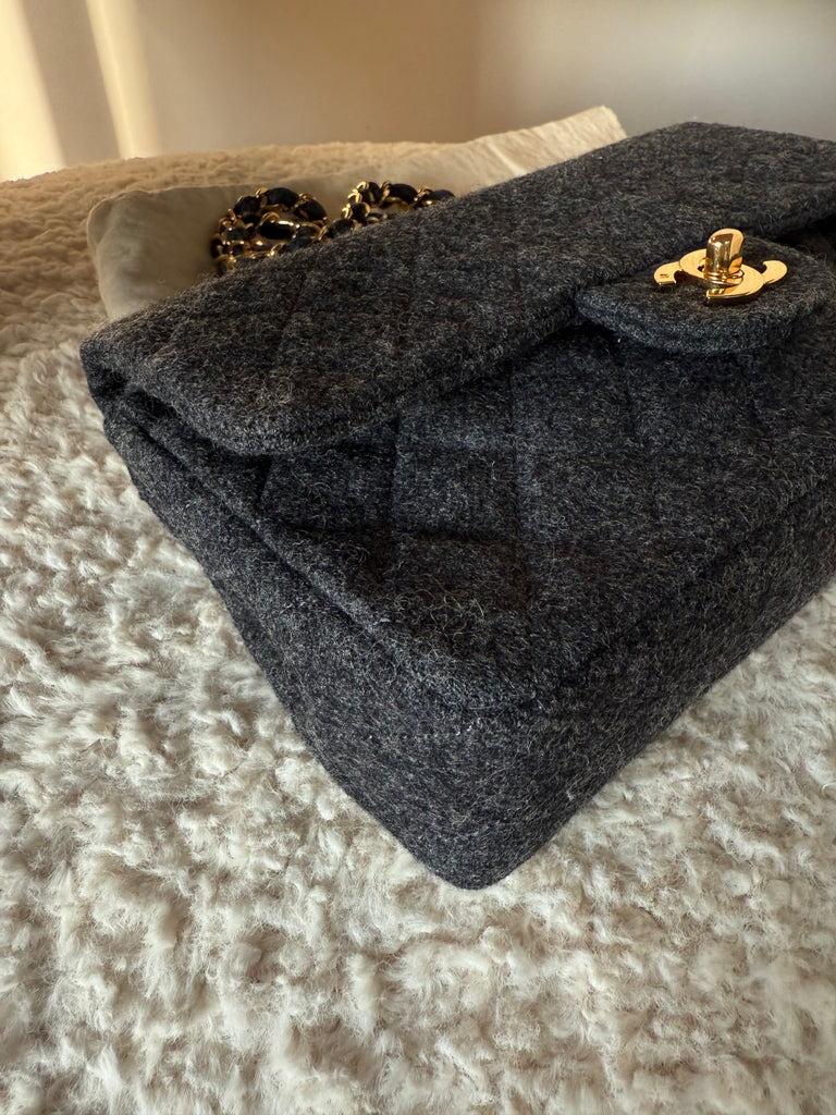 Borsa a spalla con catena Chanel modello Timeless misura small 23cm in lana grigia e finiture dorate. Anni 90'