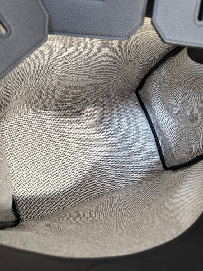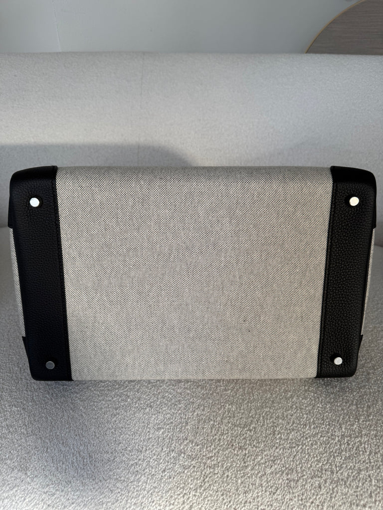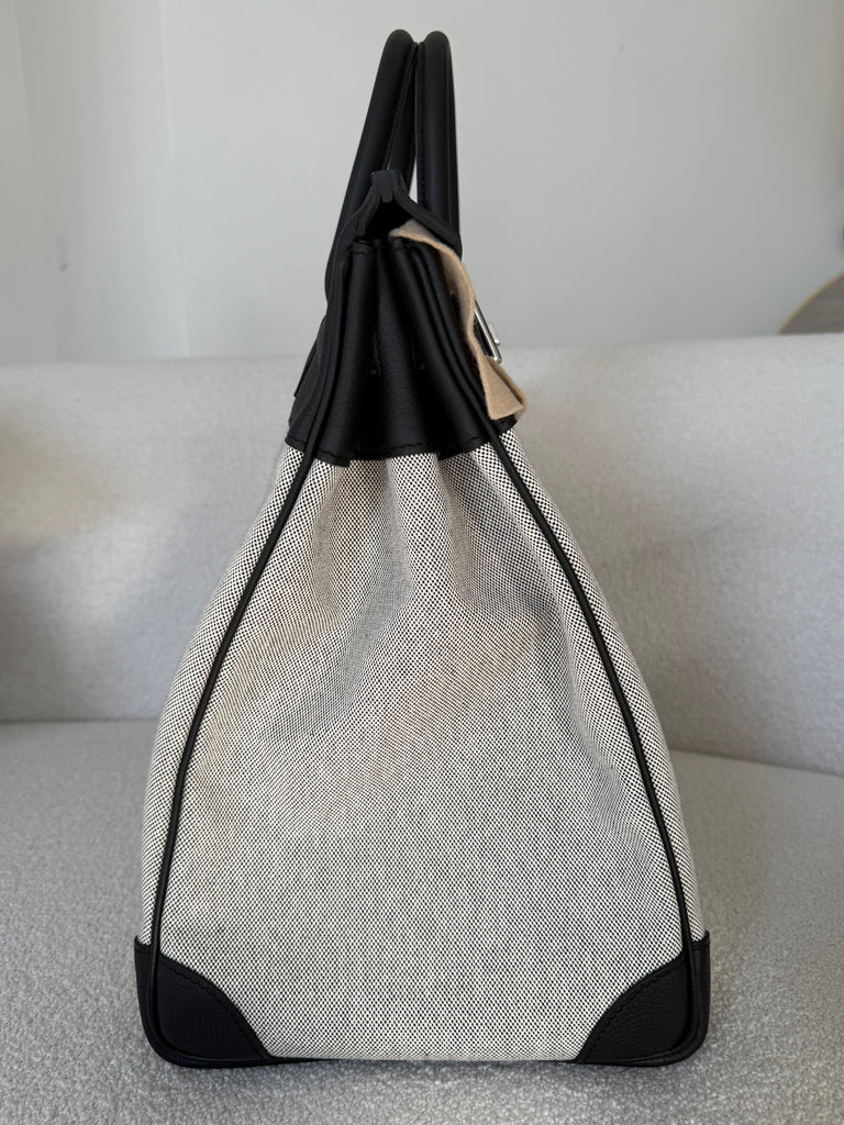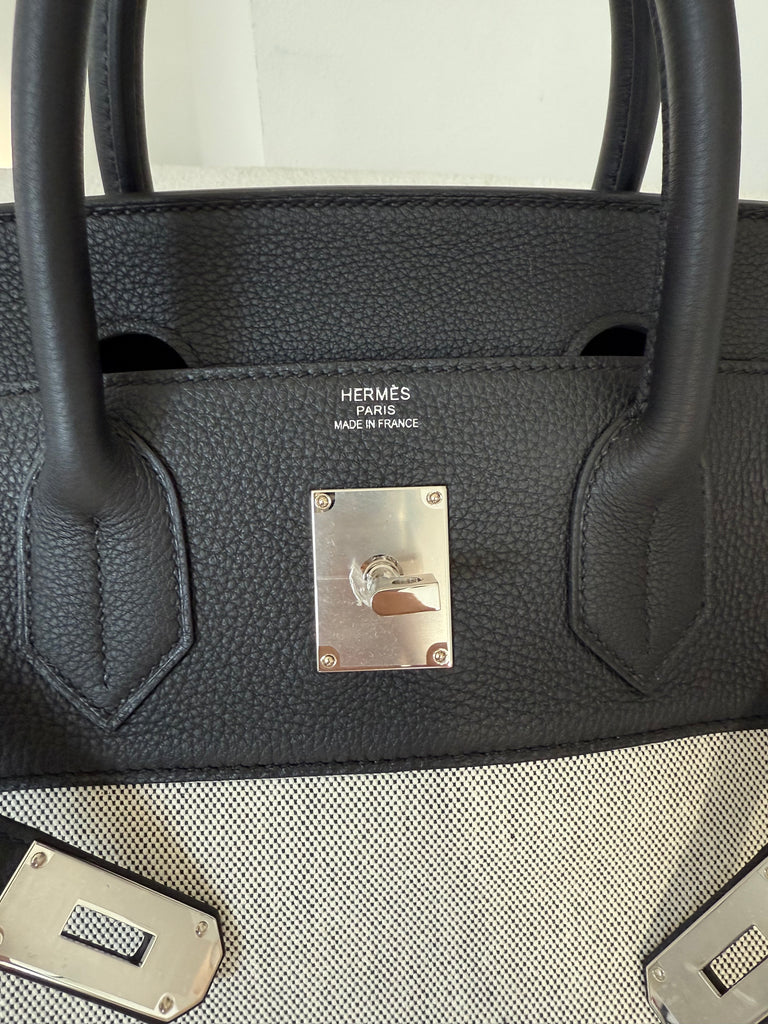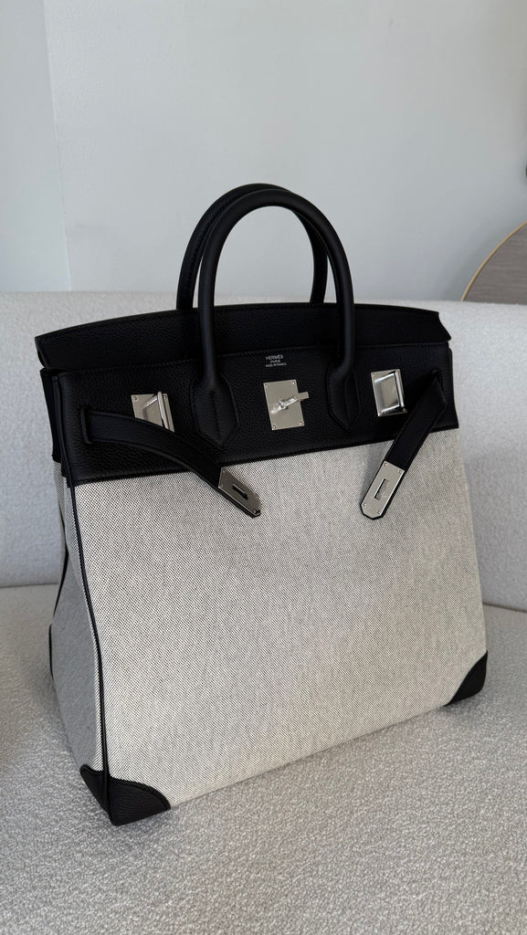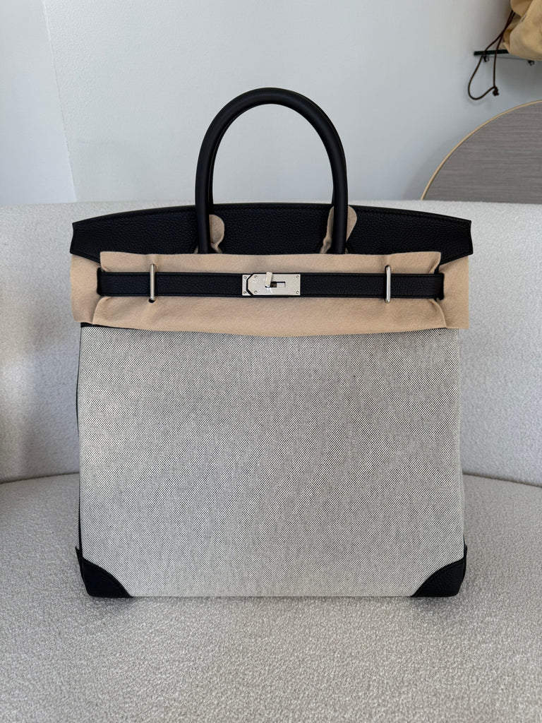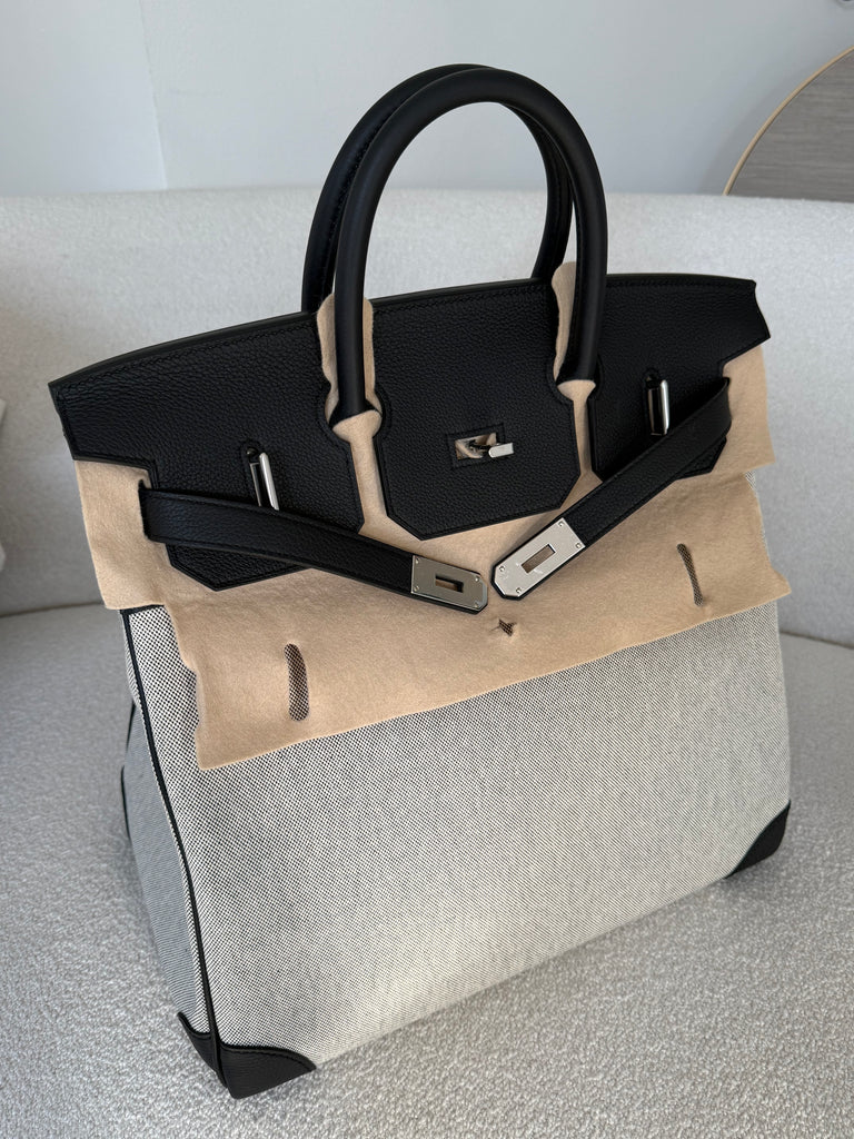 Borsa a mano Hermès modello Hac 40 in pellame togo color nero e tessuto toile ecru/nero metalleria palladio. Anno 2025