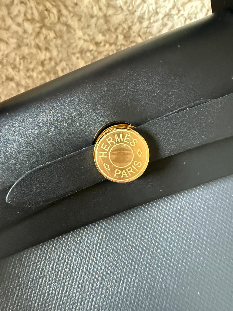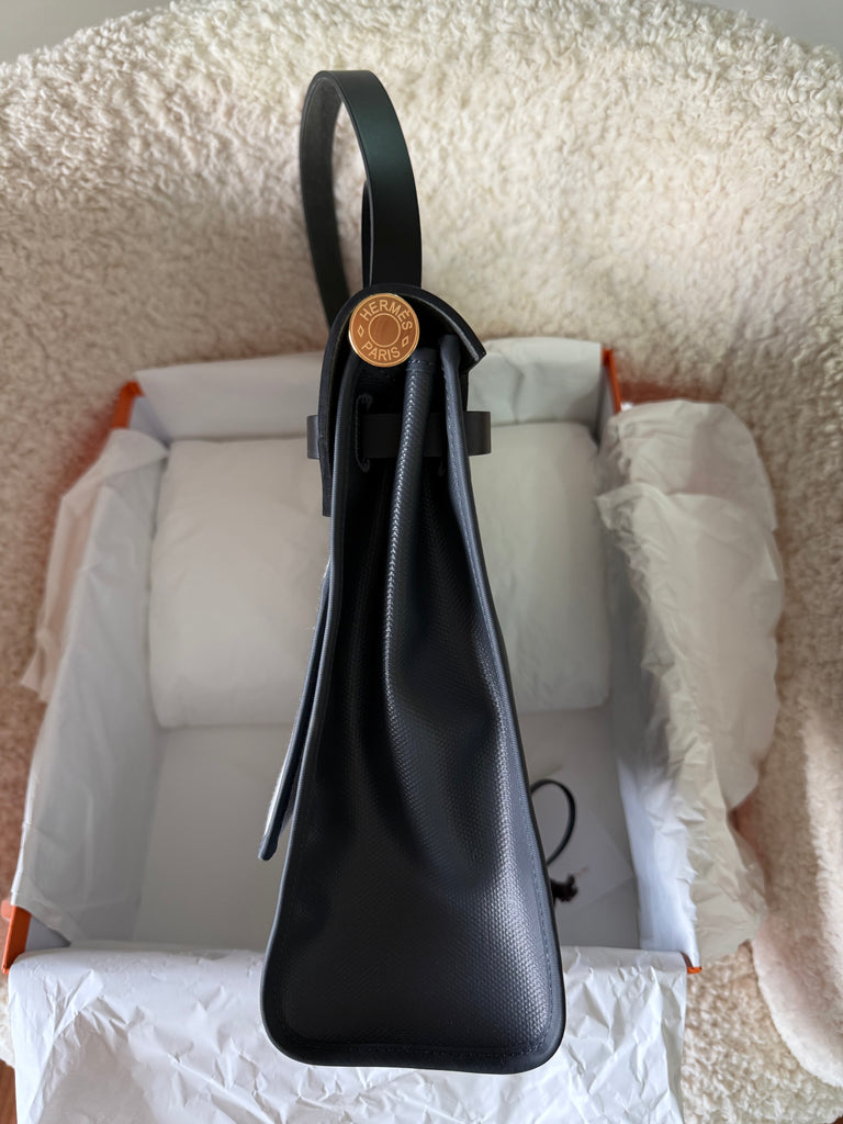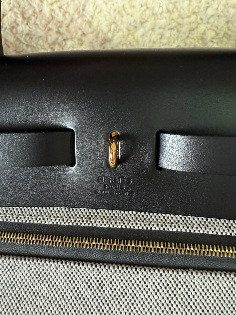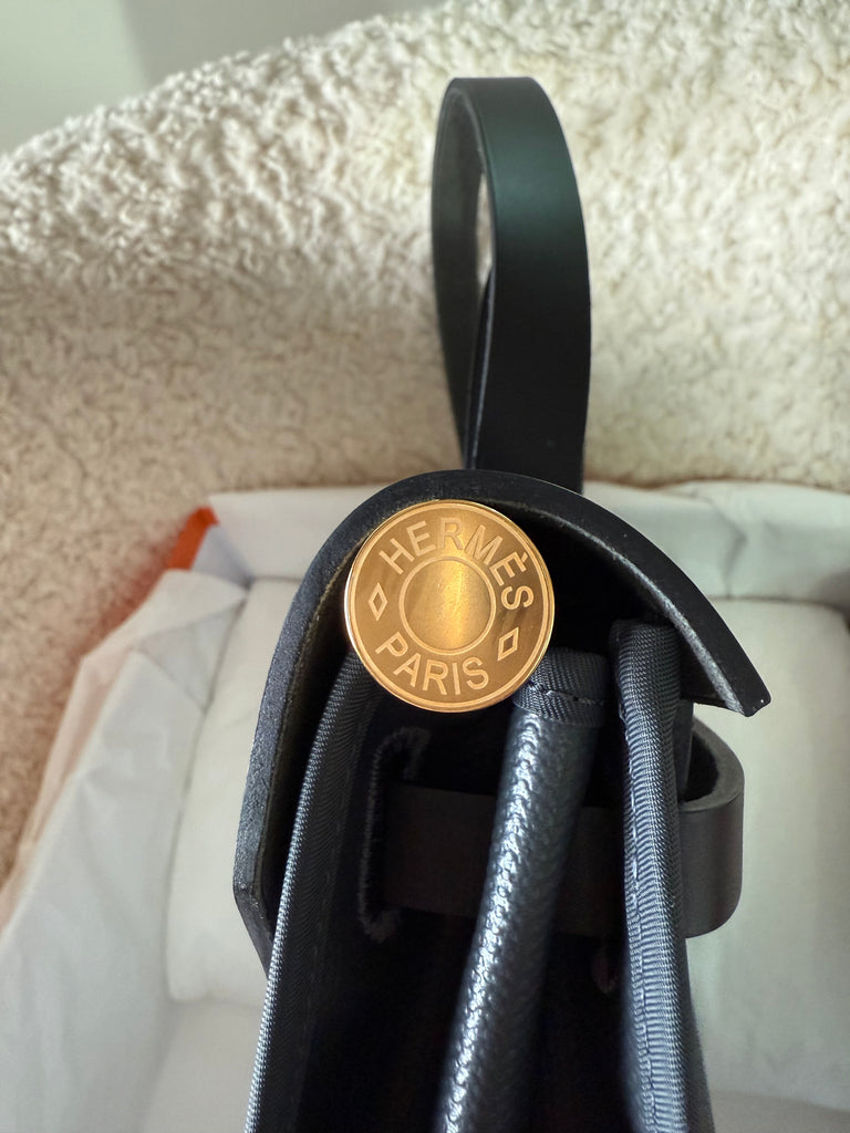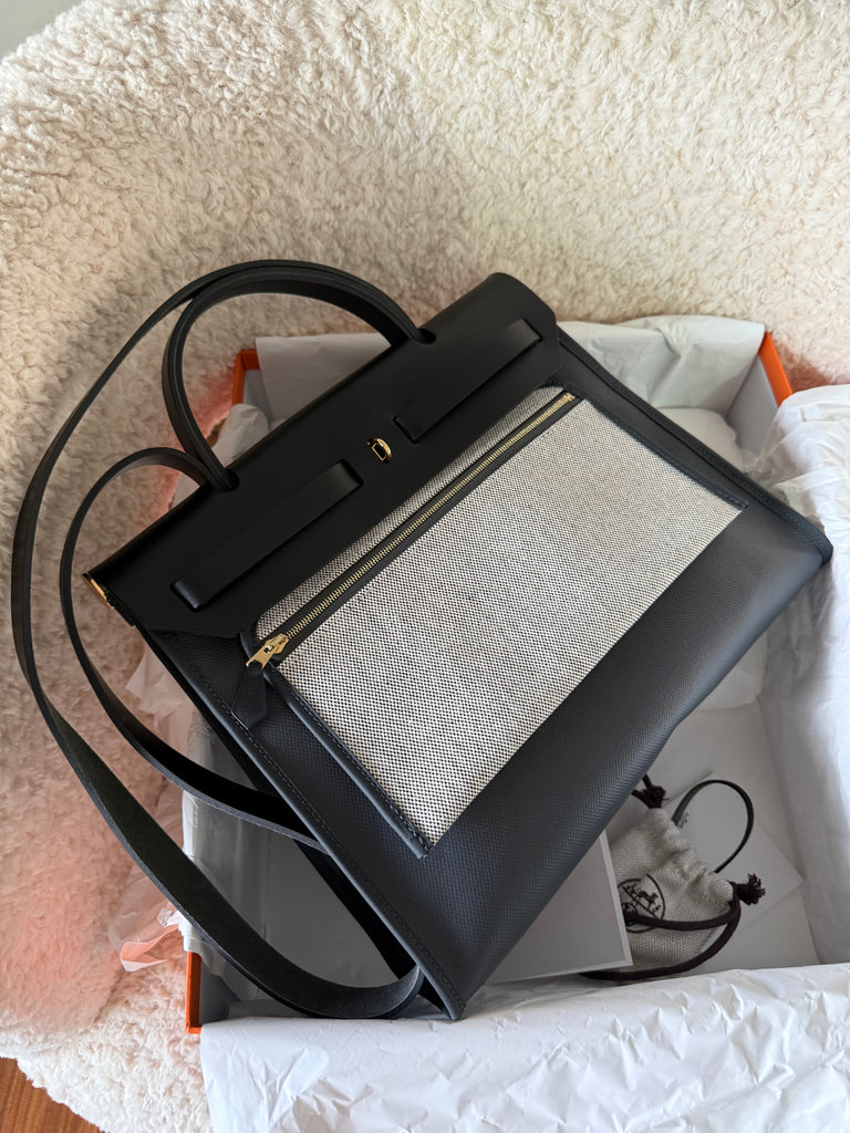 Borsa a mano e a spalla Hermès modello Herbag 31 realizzata in canvas cerato color grigio, dettagli in pelle color Nero e parti metalliche dorate. Anno 2025