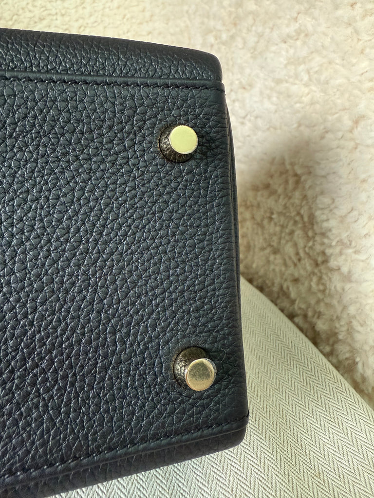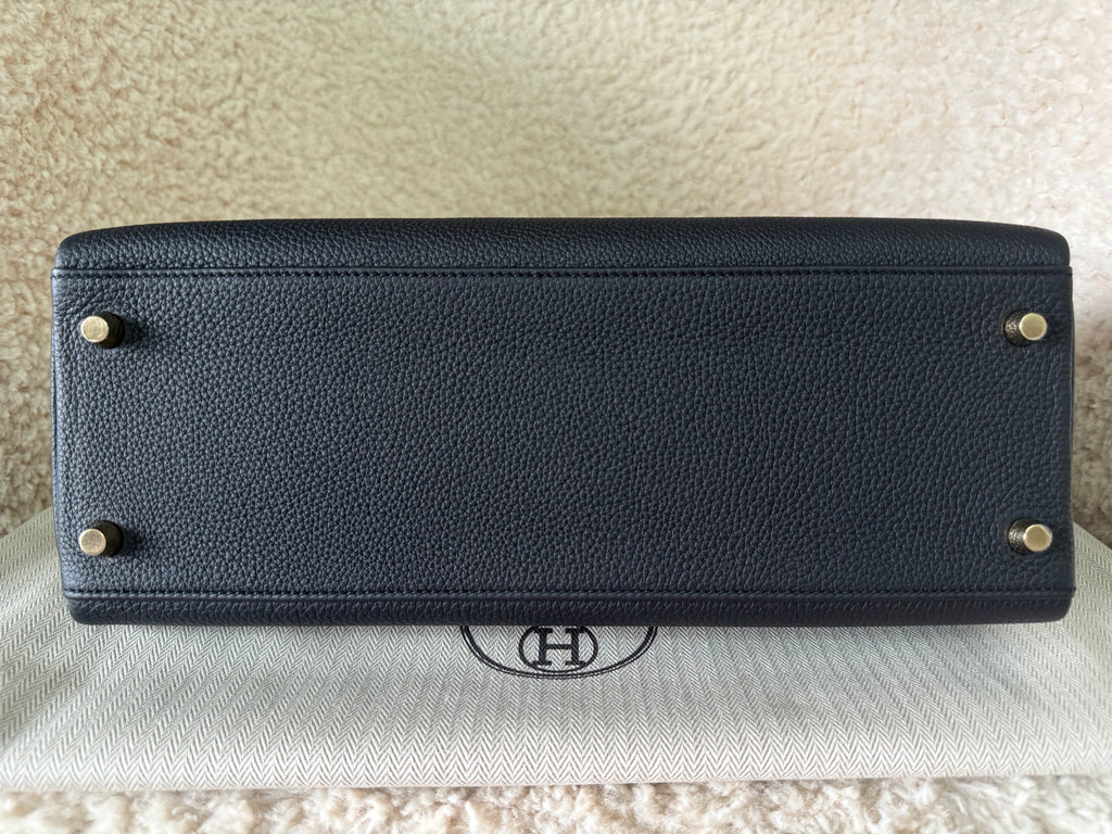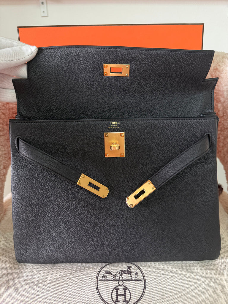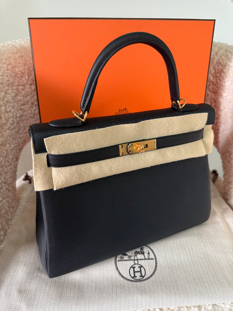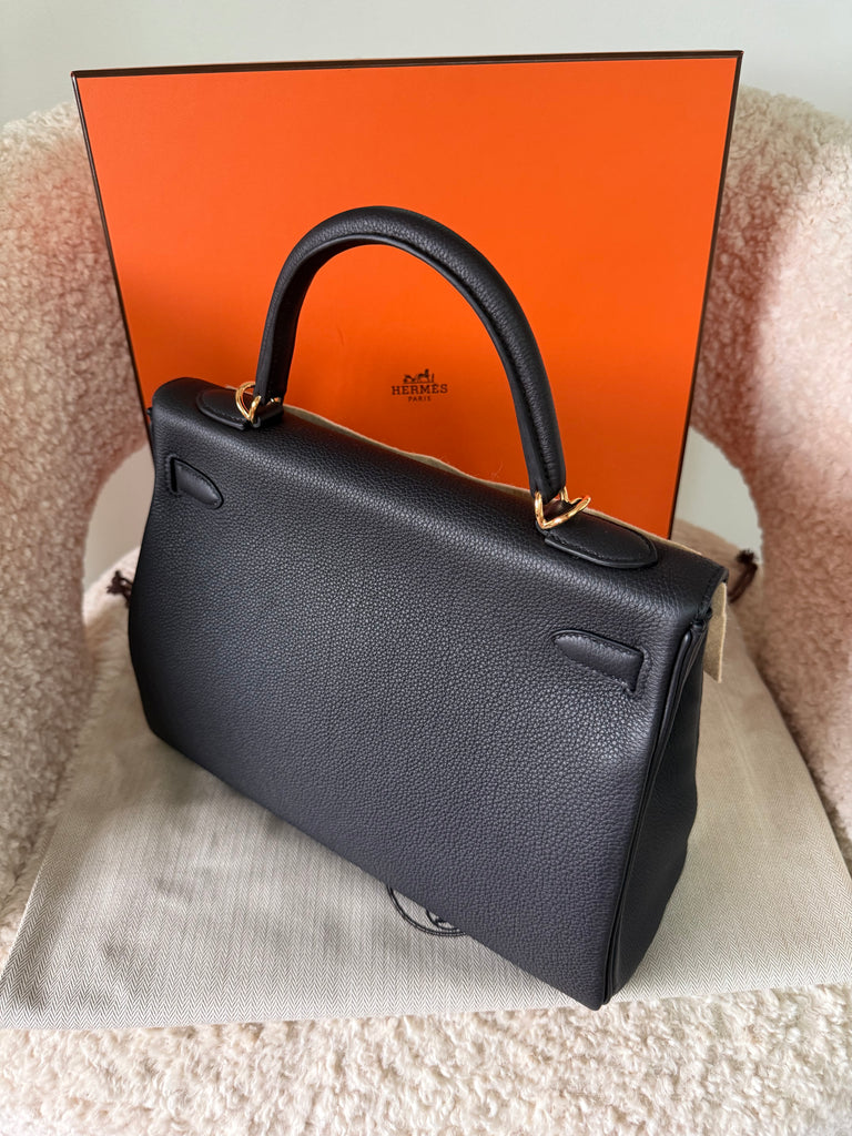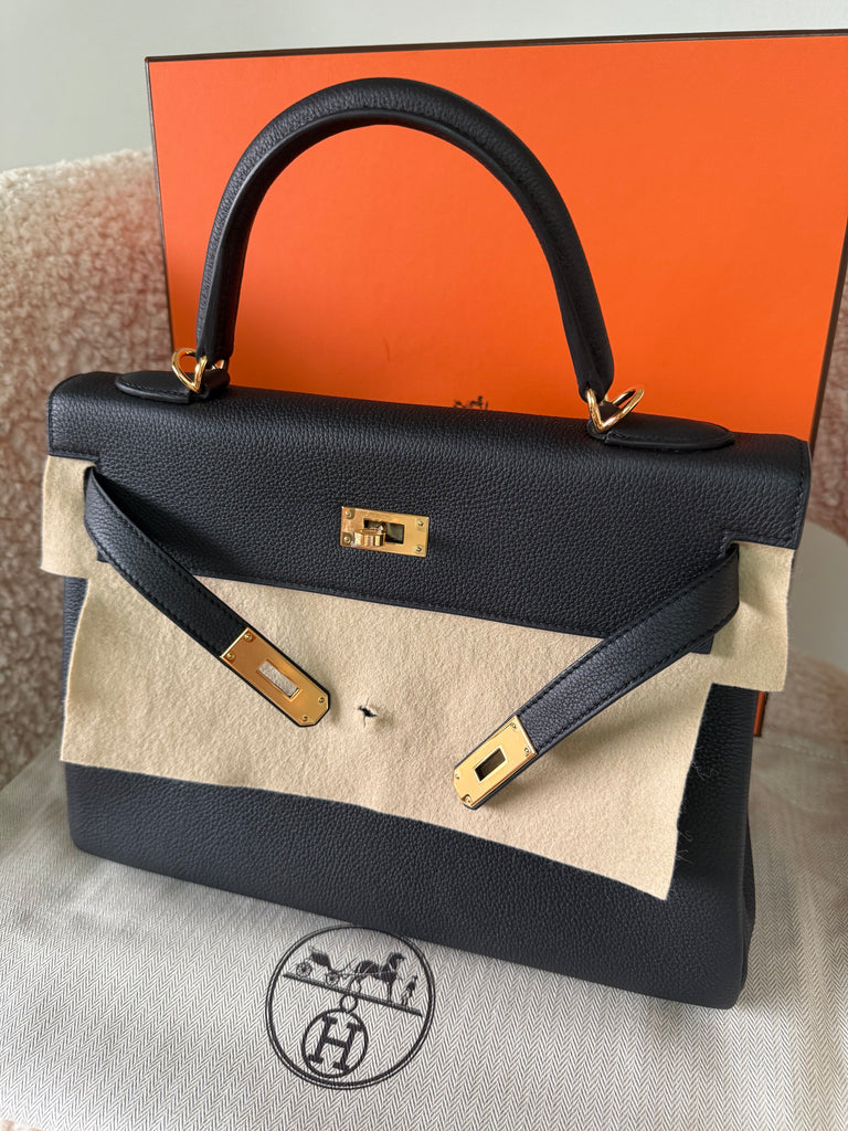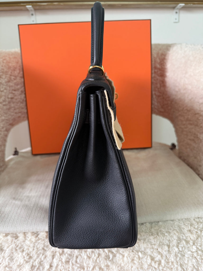 Borsa a mano con tracolla rimovibile Hermès modello Kelly 32 in pellame Togo color Nero e metalleria dorata. Anno 2025.