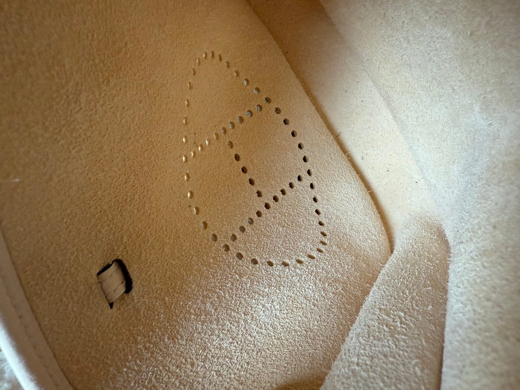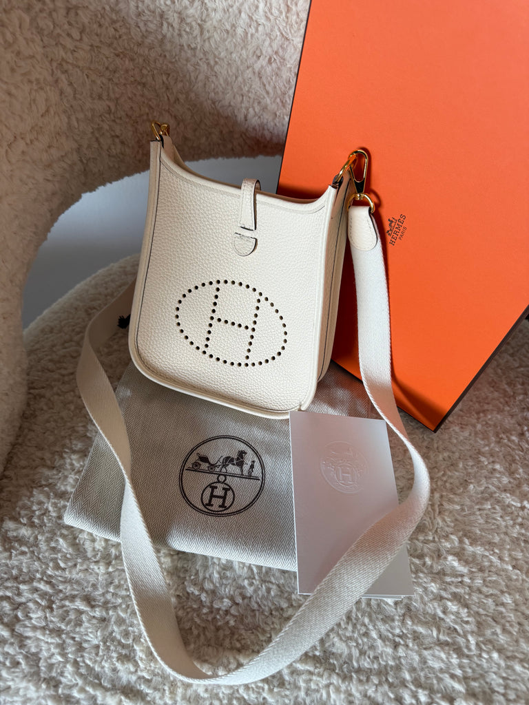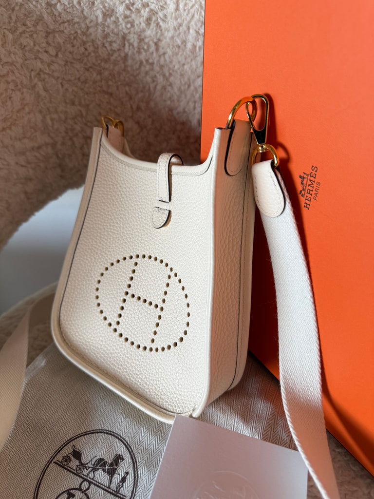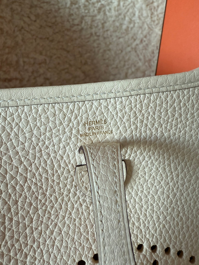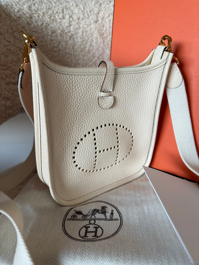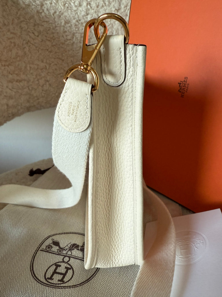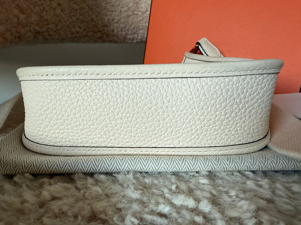 Borsa a tracolla Hermès modello Mini Evelyne in pellame Taurillon Clemence color Nata e hardware palladio. Anno 2022