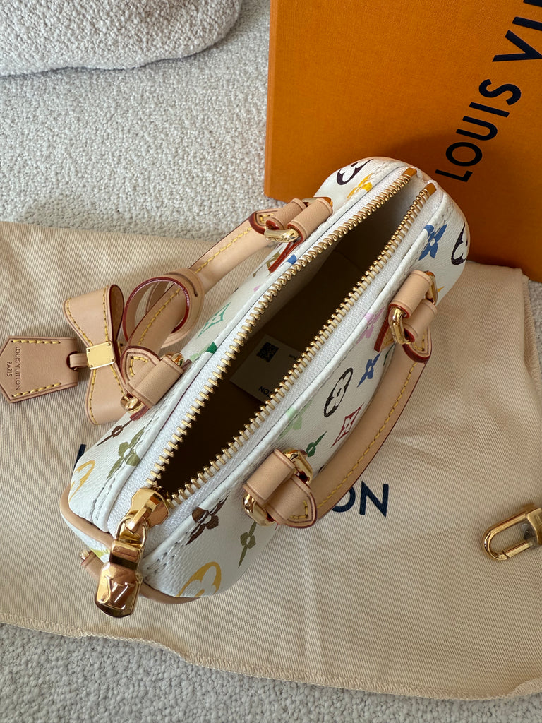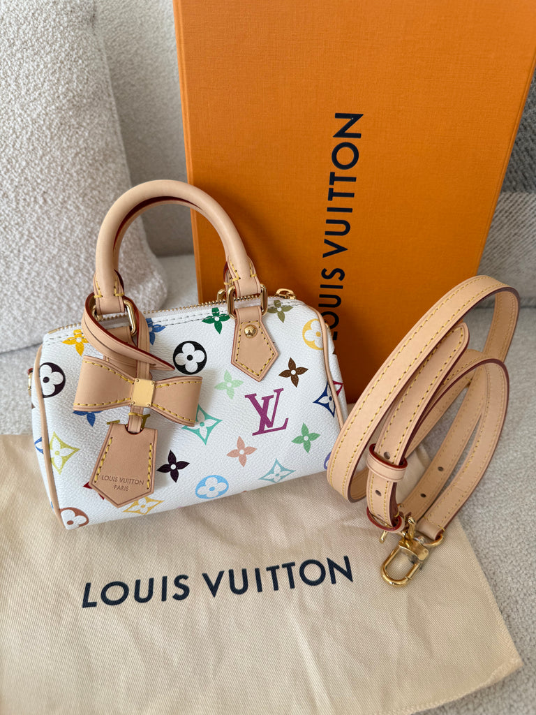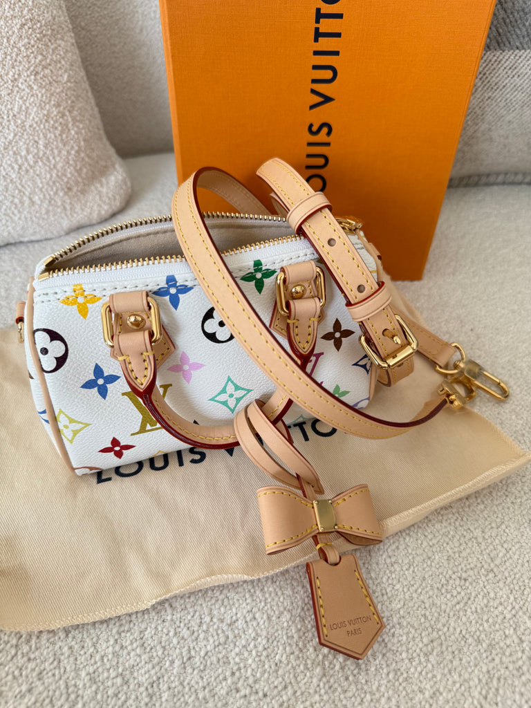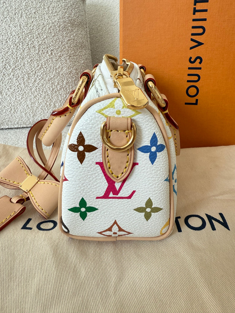 Borsetta a mano con tracolla Louis Vuitton modello Nano Speedy Limited Edition Multicolor by Takashi Murakami 2025 in canvas monogram multicolor e vacchetta naturale.