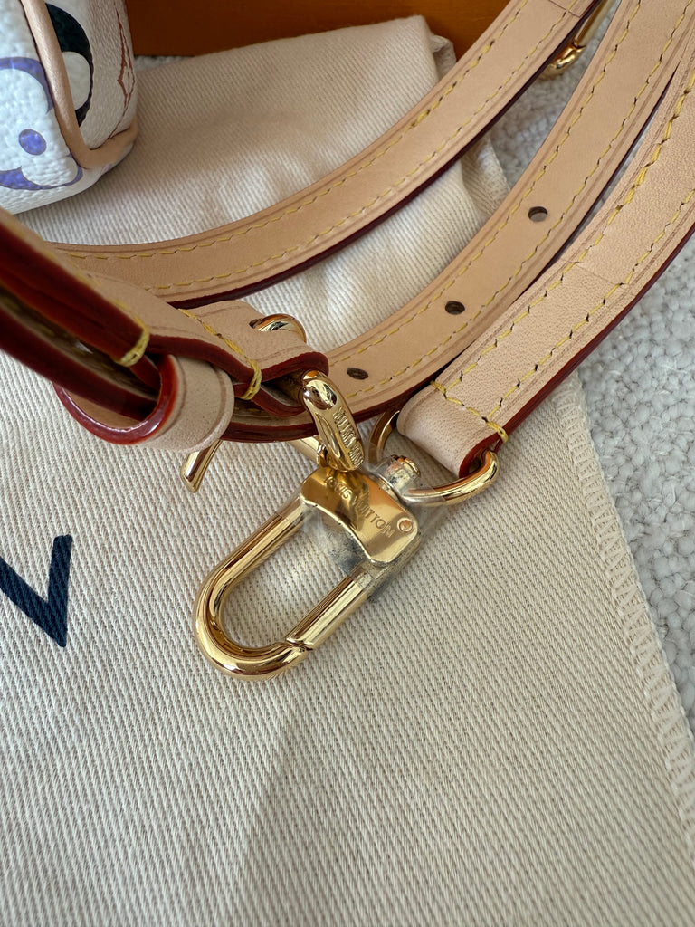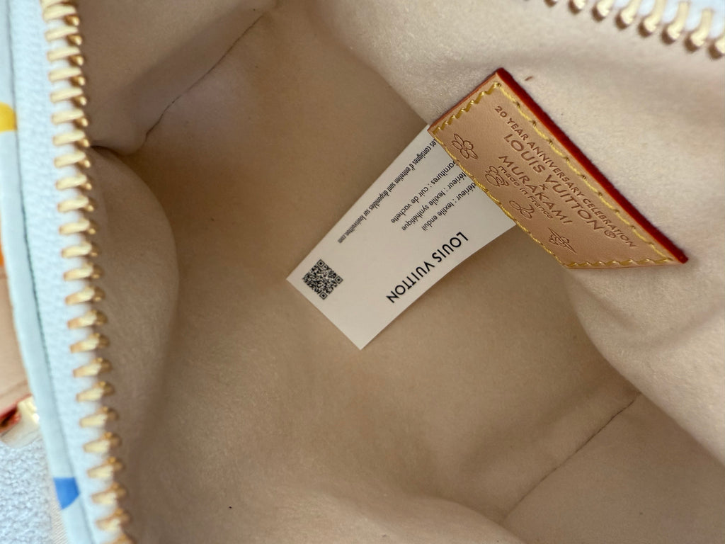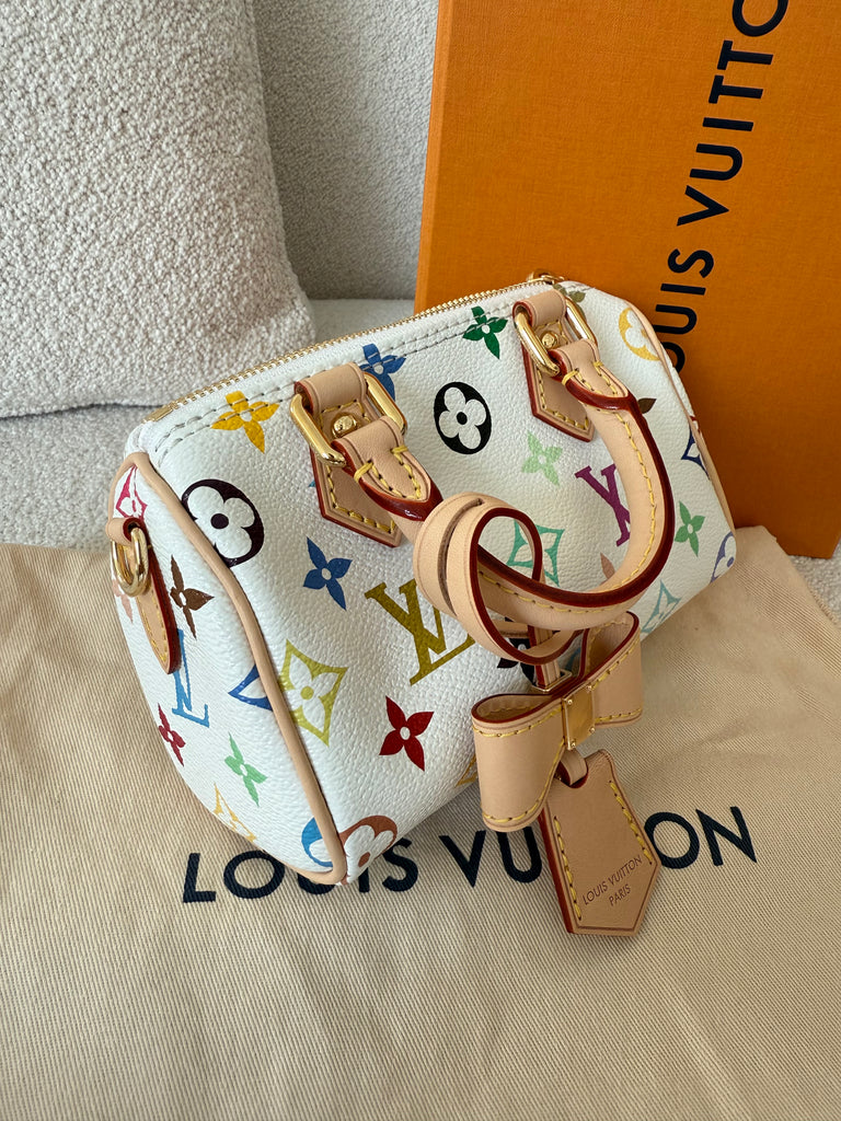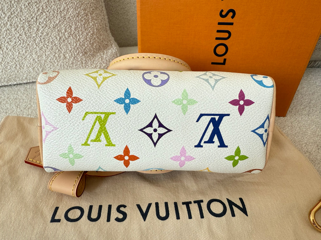 Borsetta a mano con tracolla Louis Vuitton modello Nano Speedy Limited Edition Multicolor by Takashi Murakami 2025 in canvas monogram multicolor e vacchetta naturale.