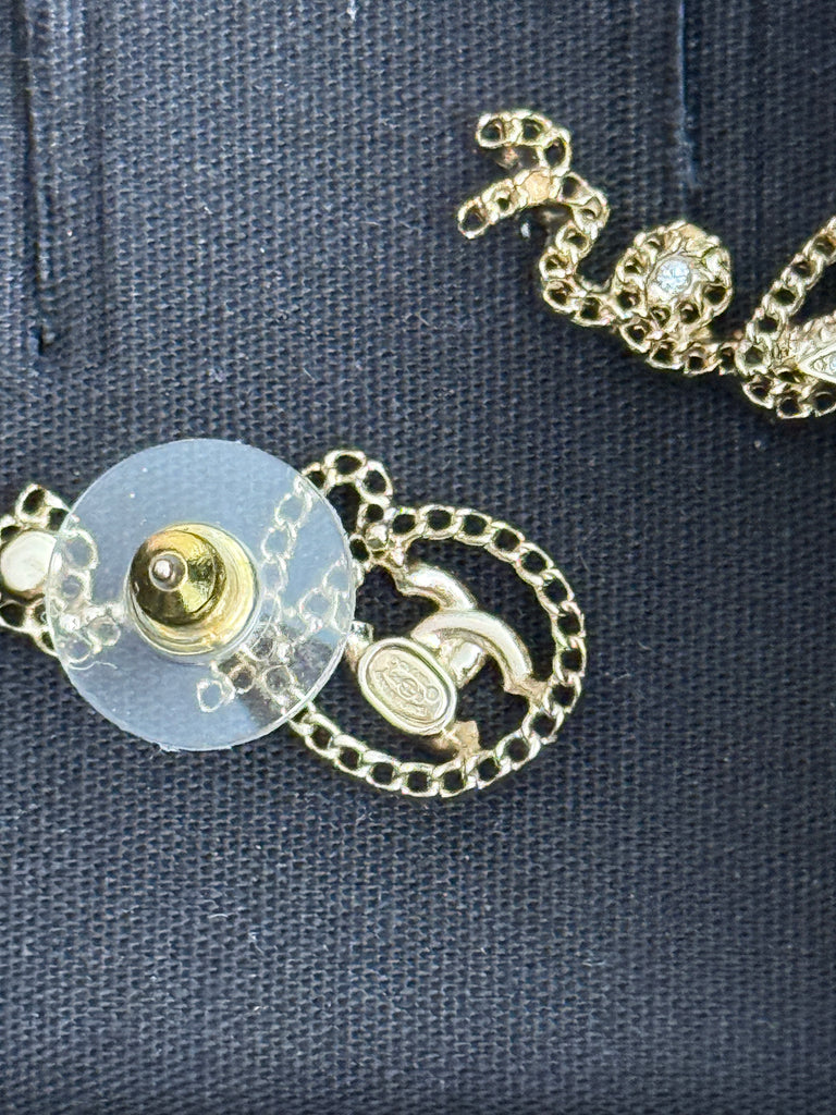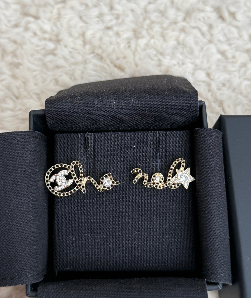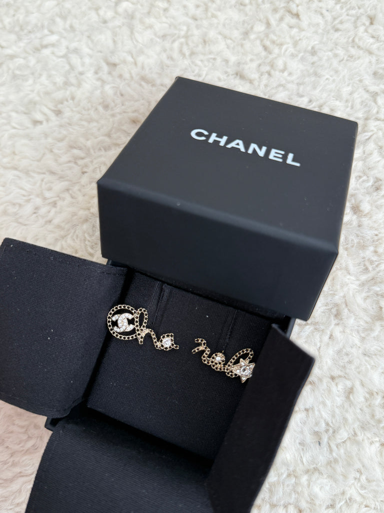 Orecchini Chanel modello 2025 scritta "Cha Nel" metalleria champagne con decorazioni swarovki.