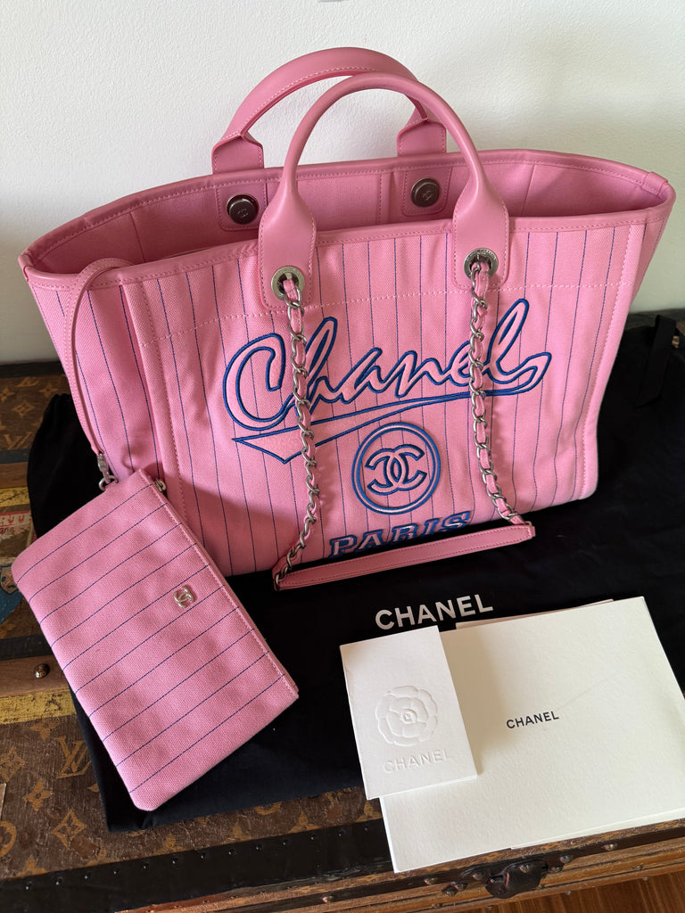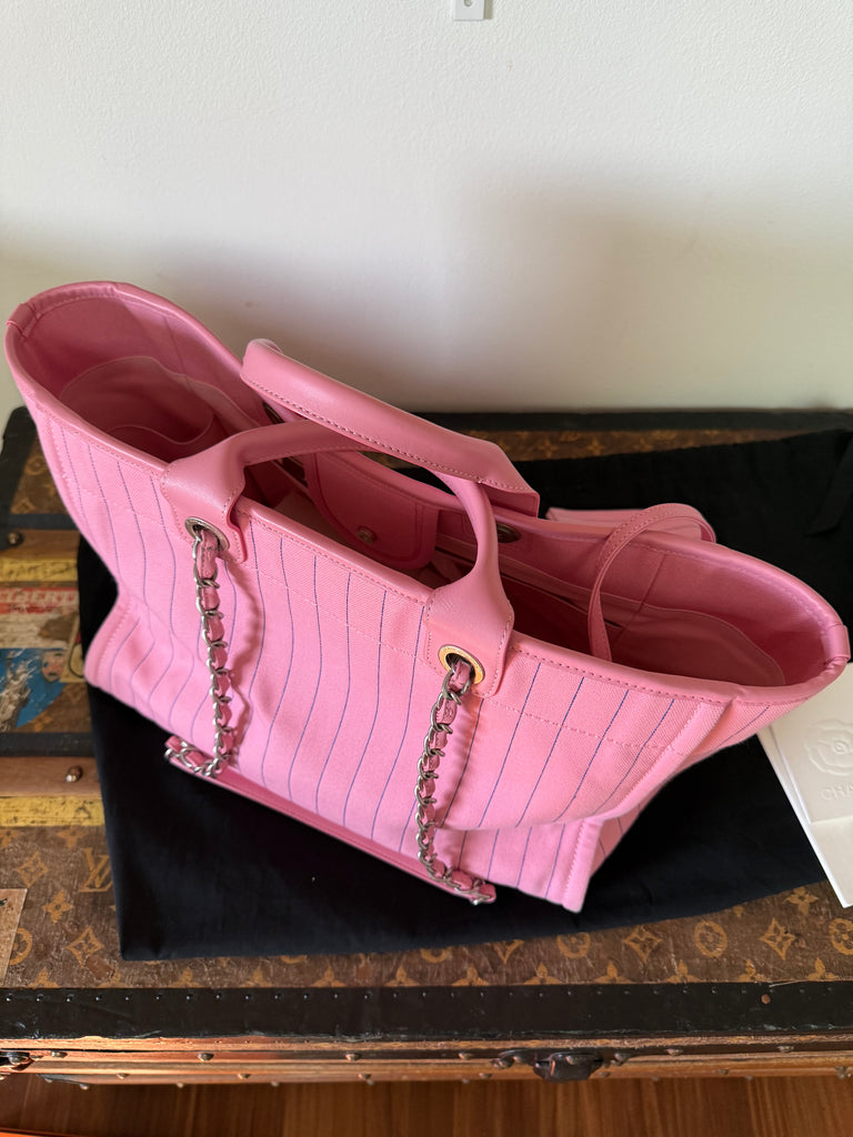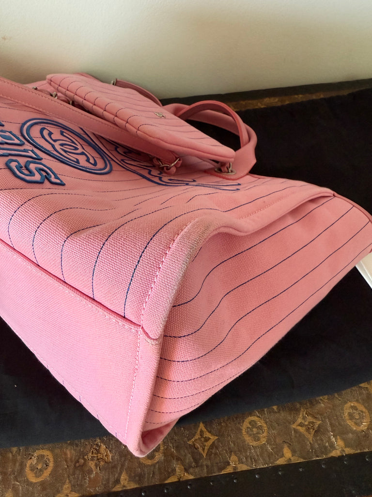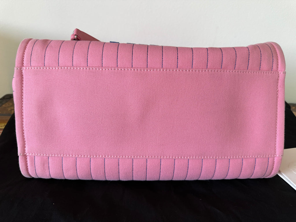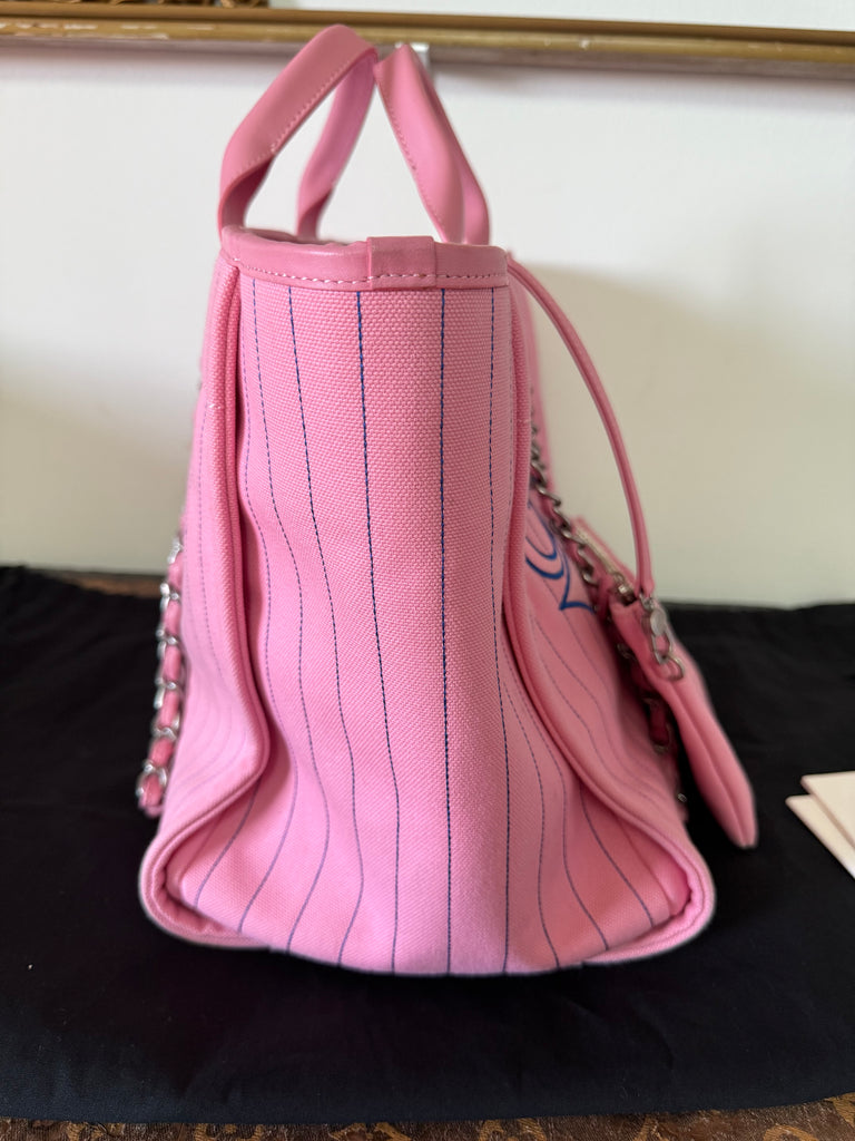 Borsa a mano e a spalla Chanel con manici e catena modello Deauville Medium, in tessuto color rosa con fasce verticali blu e dettagli in pelle rosa. Metalleria palladio. Anno 2023.