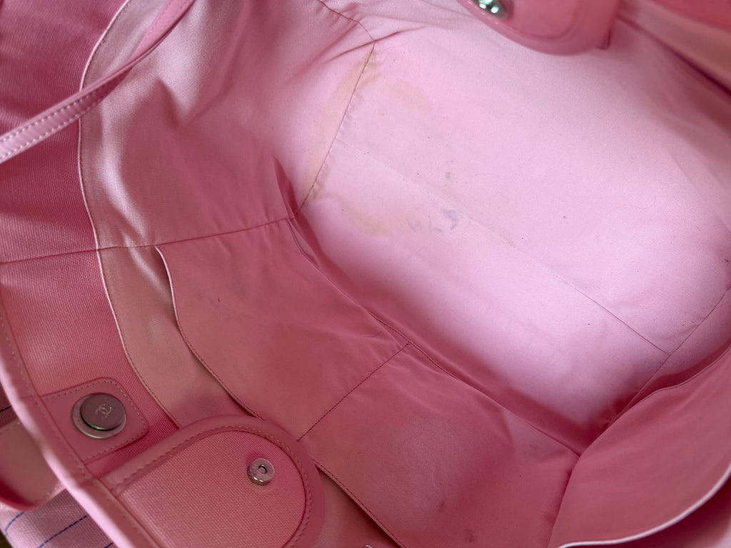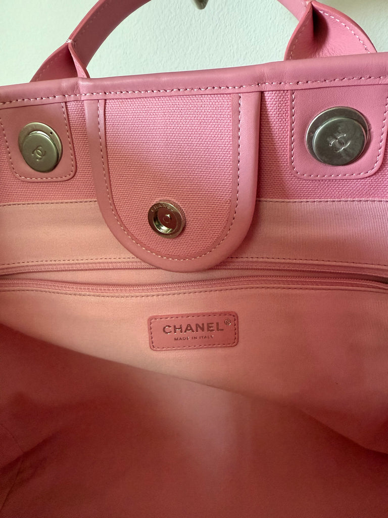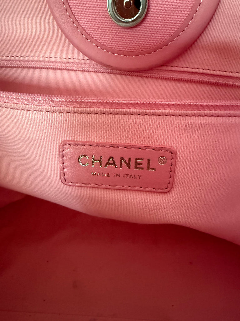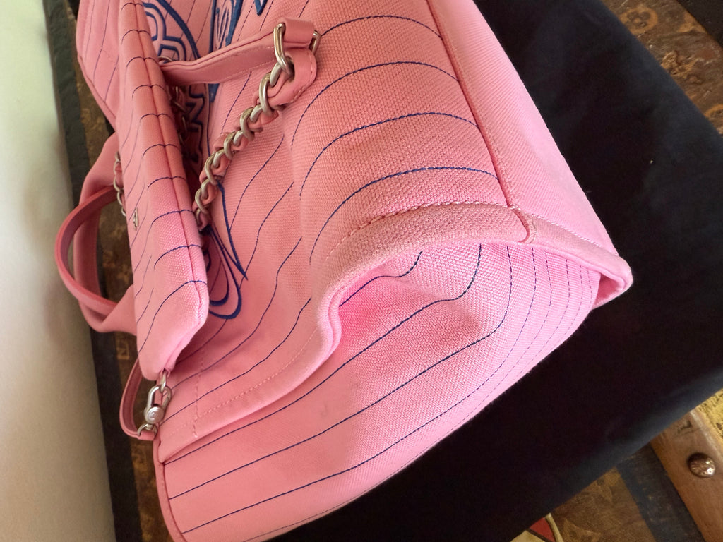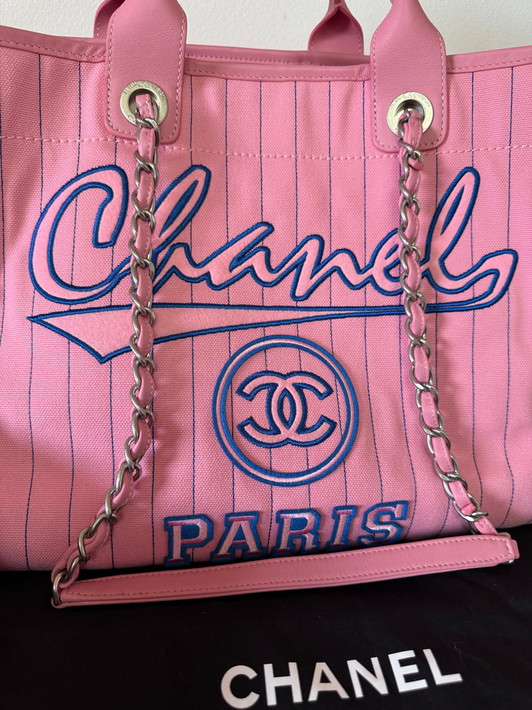 Borsa a mano e a spalla Chanel con manici e catena modello Deauville Medium, in tessuto color rosa con fasce verticali blu e dettagli in pelle rosa. Metalleria palladio. Anno 2023.