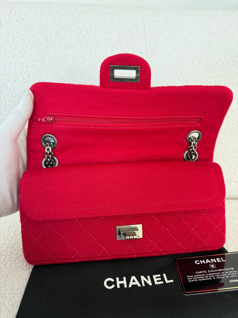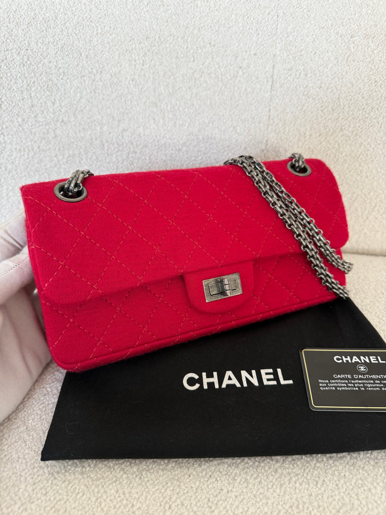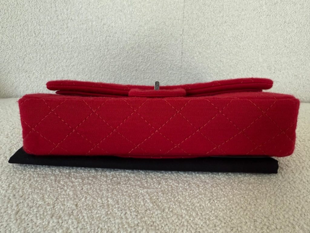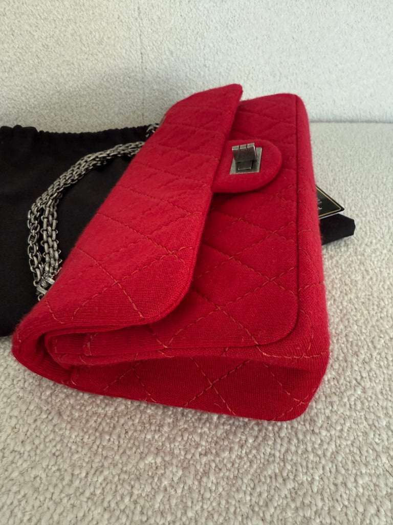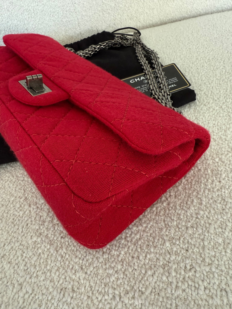 Borsa a spalla Chanel modello 2.55 Reissue in jersey color rosso e dettagli metallici rutenio.