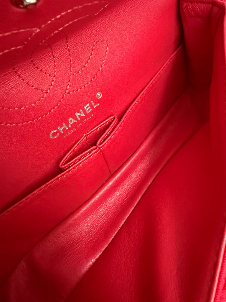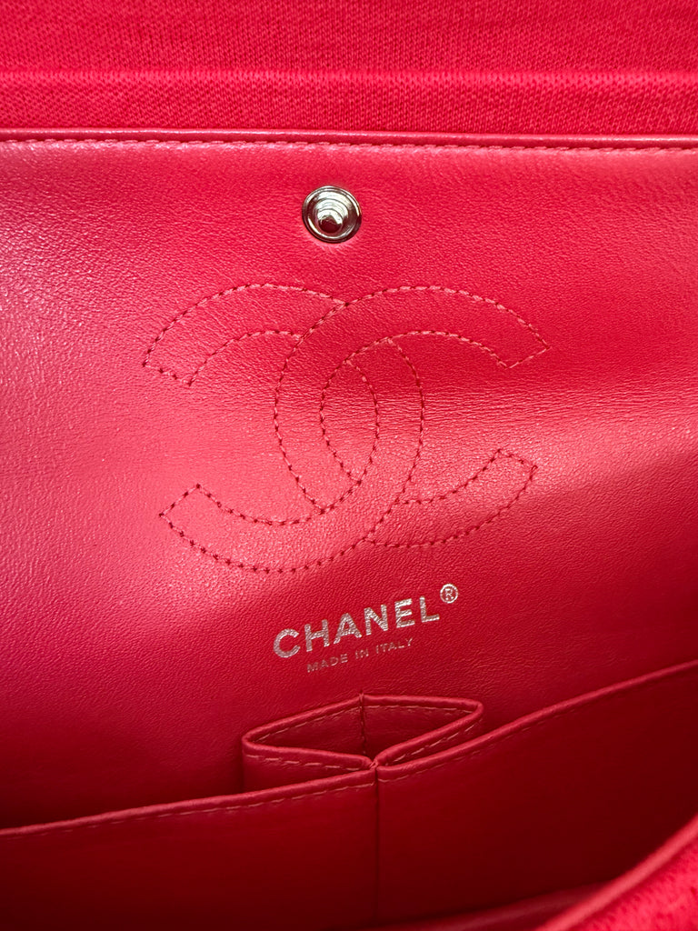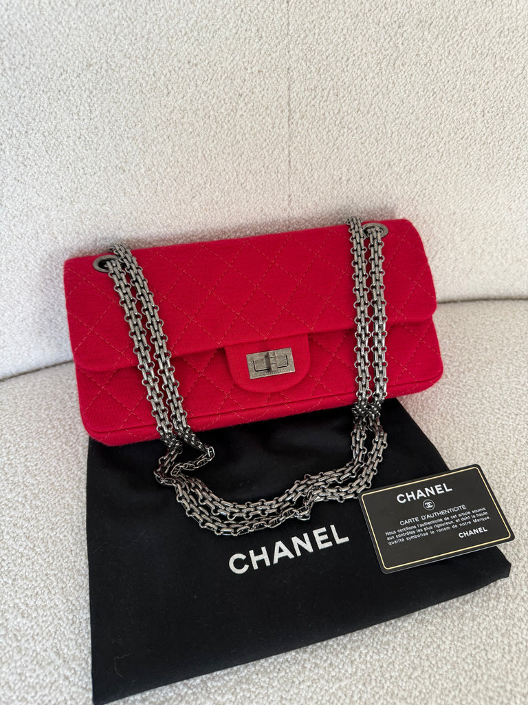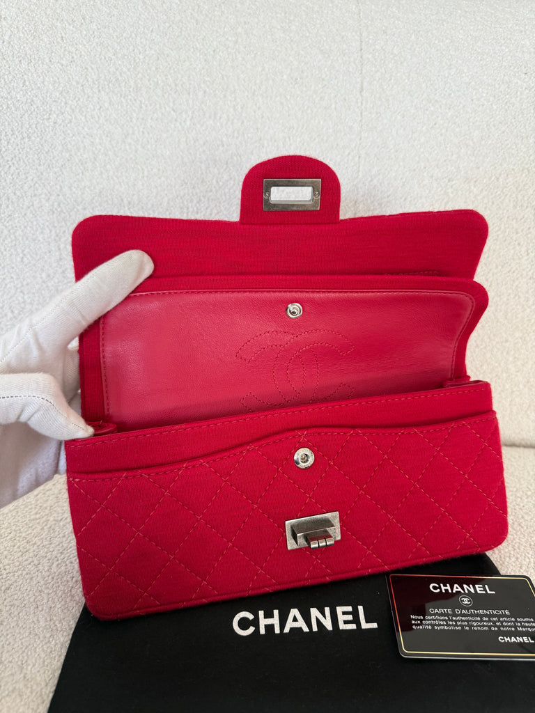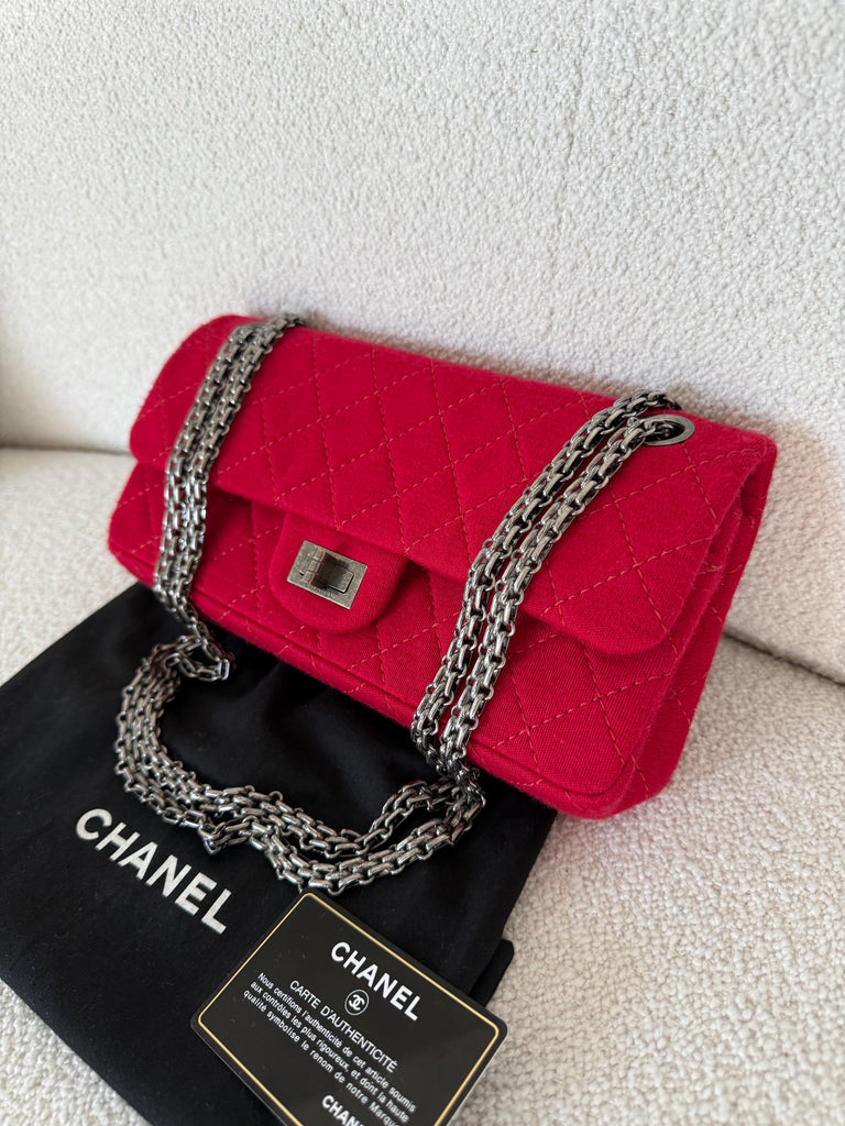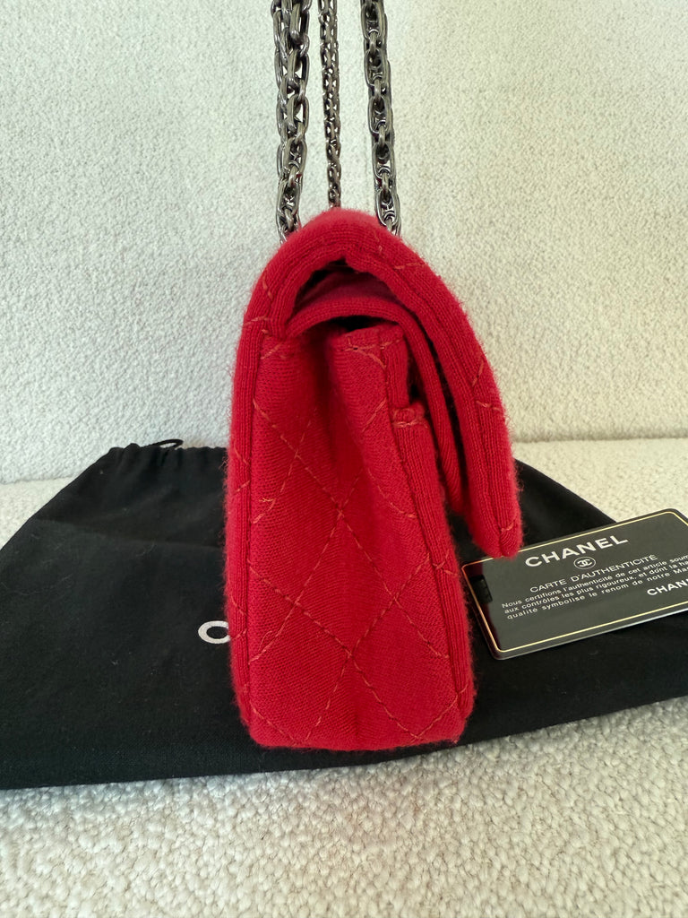 Borsa a spalla Chanel modello 2.55 Reissue in jersey color rosso e dettagli metallici rutenio.