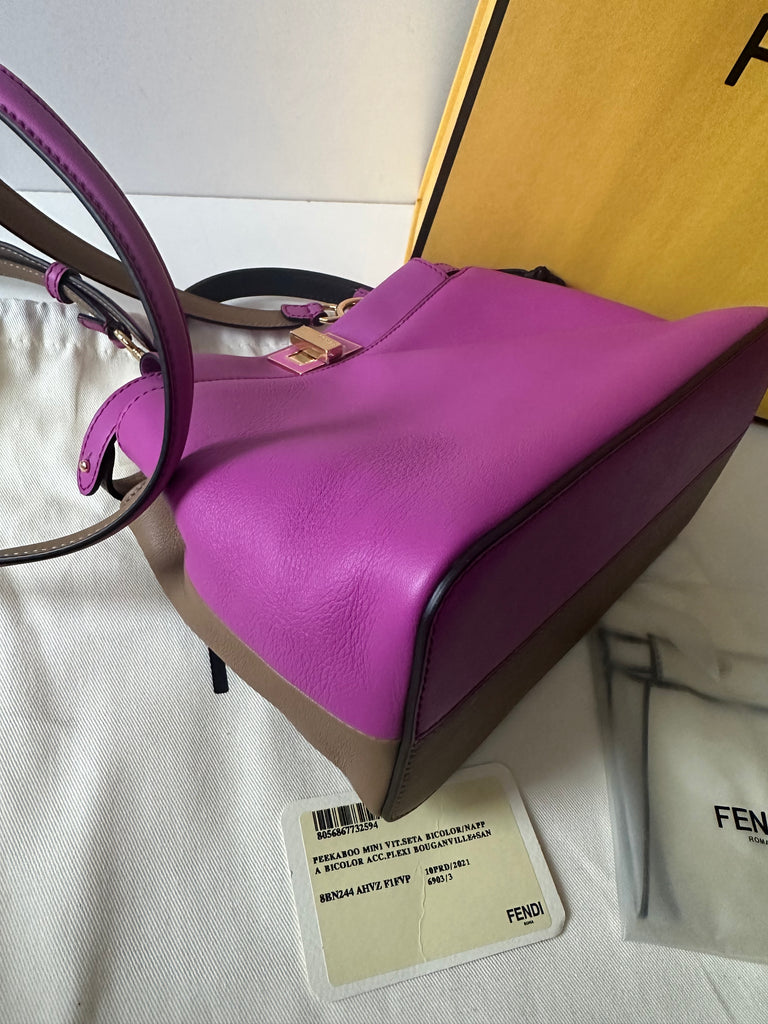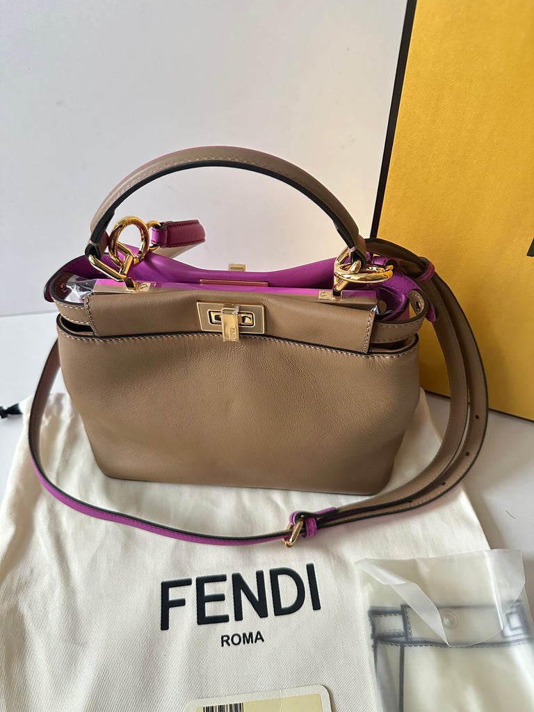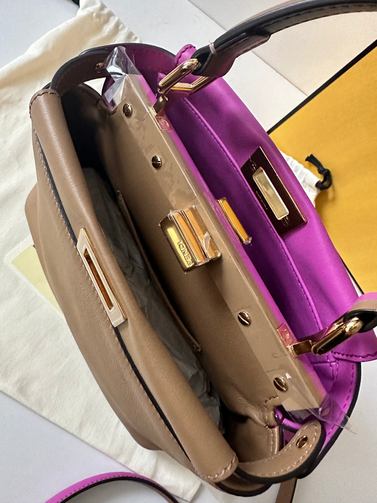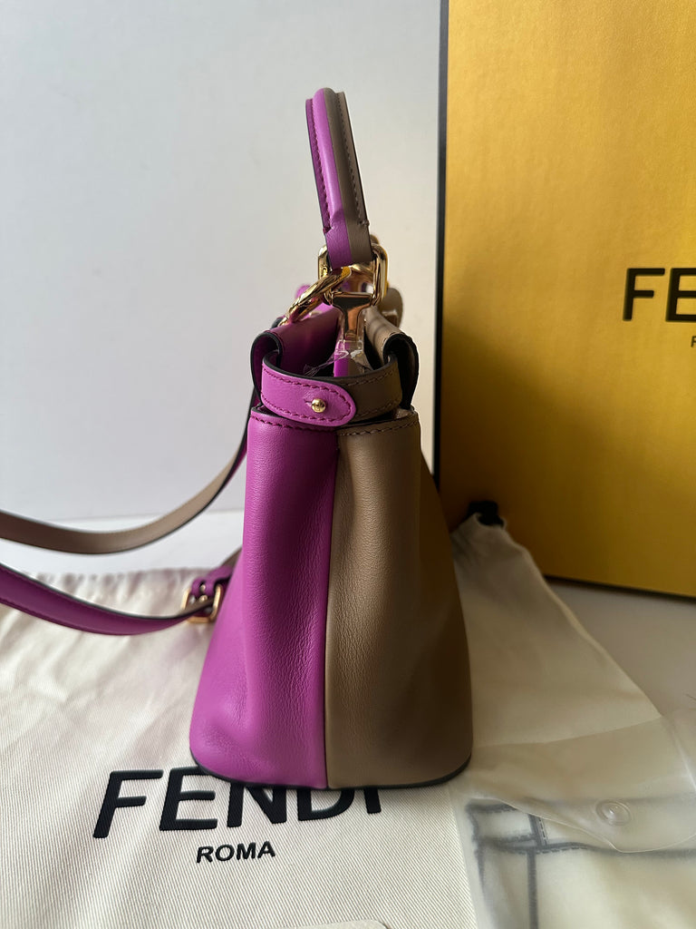 Borsa a mano con tracolla (regolabile e rimovibile) Fendi modello iconico Peekaboo Mini in pelle bicolor, da un lato color marrone cammello e dall'altro color rosa ciclamino. Dettagli metalleria dorata.