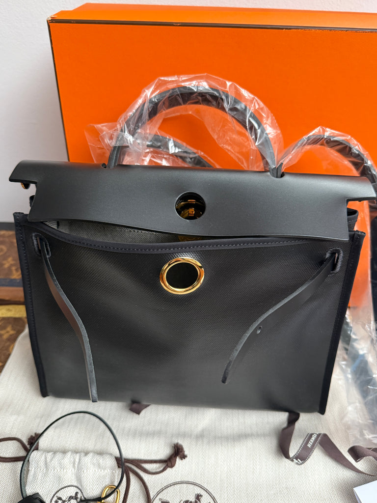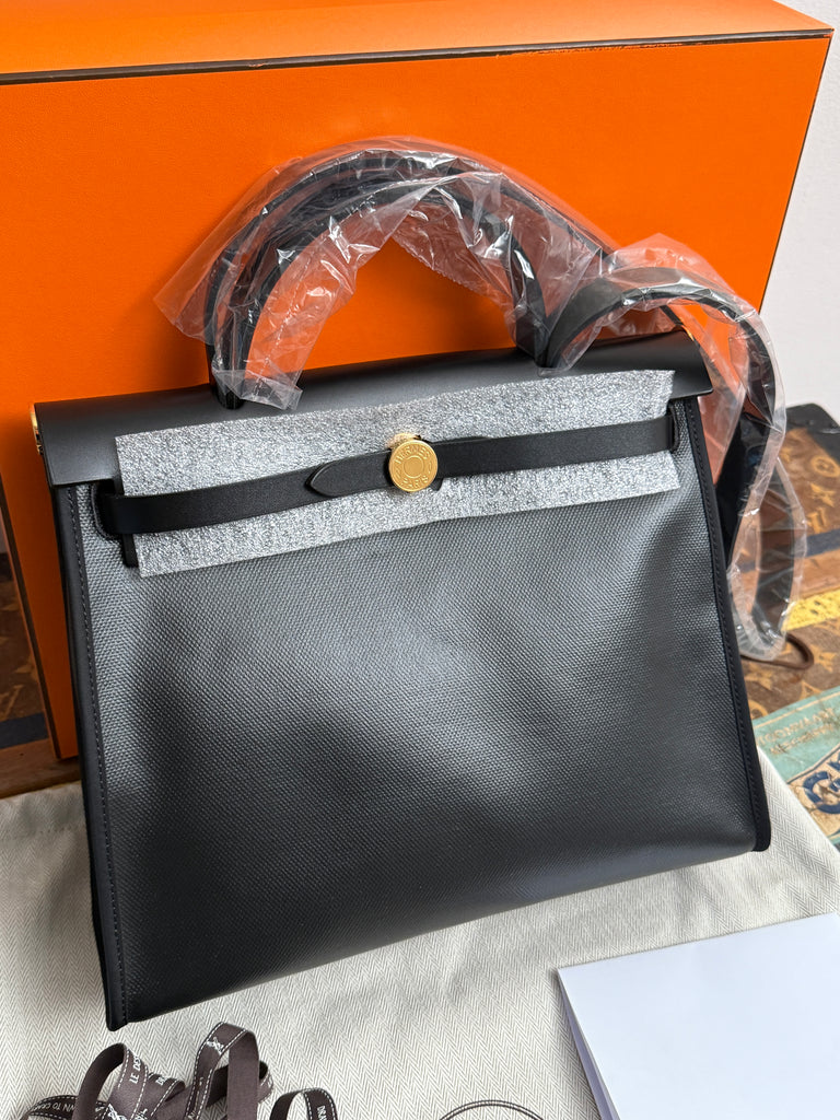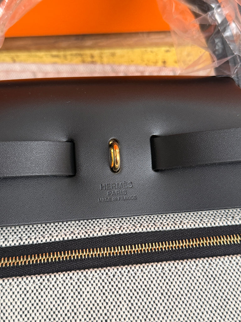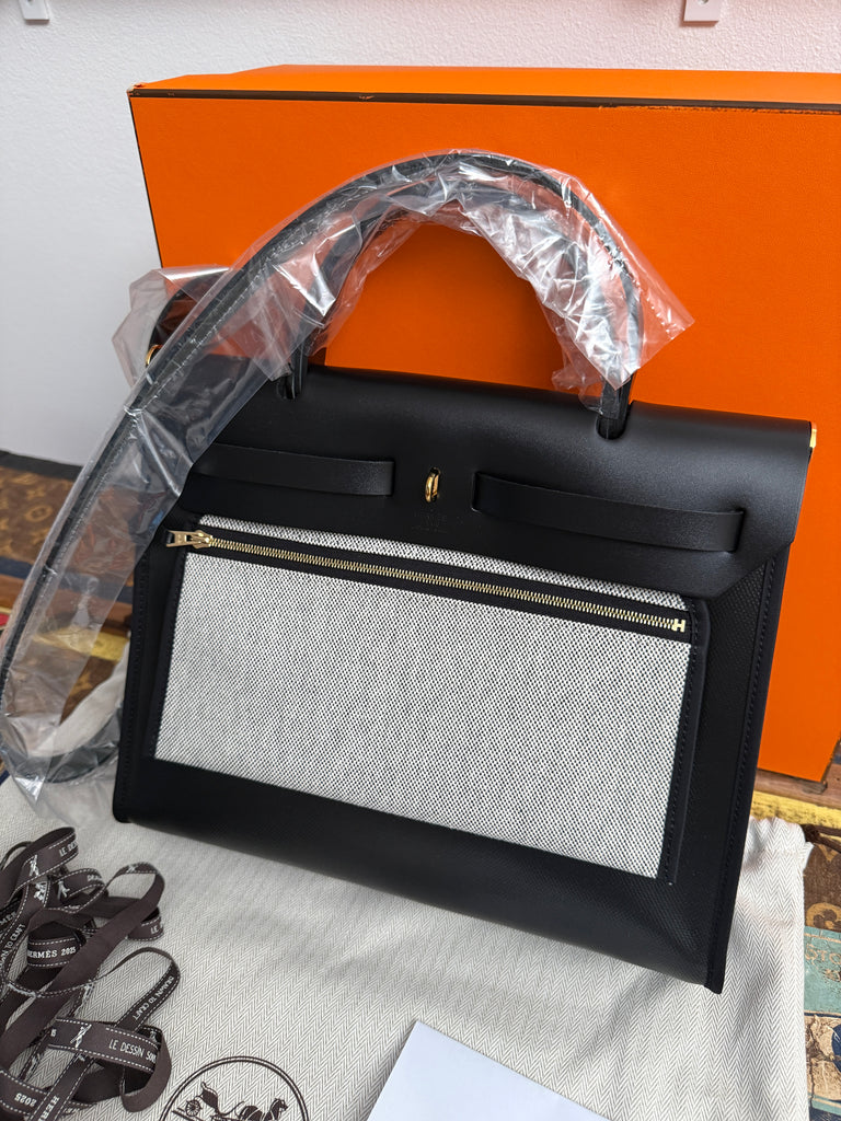 Borsa a mano e a spalla Hermès modello Herbag 31 realizzata in canvas cerato color nero, dettagli in pelle color Nero e parti metalliche dorate. Tasca sul retro in Ecrù grigio/nero. Anno 2025