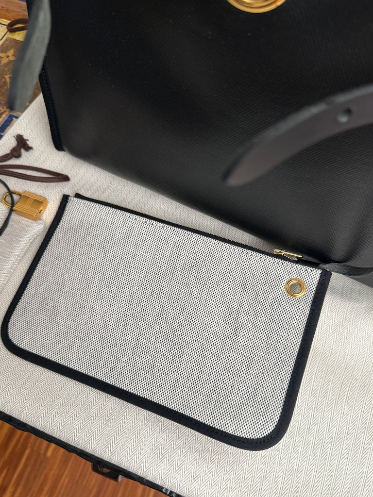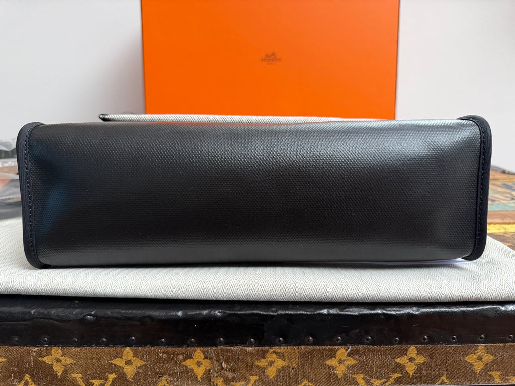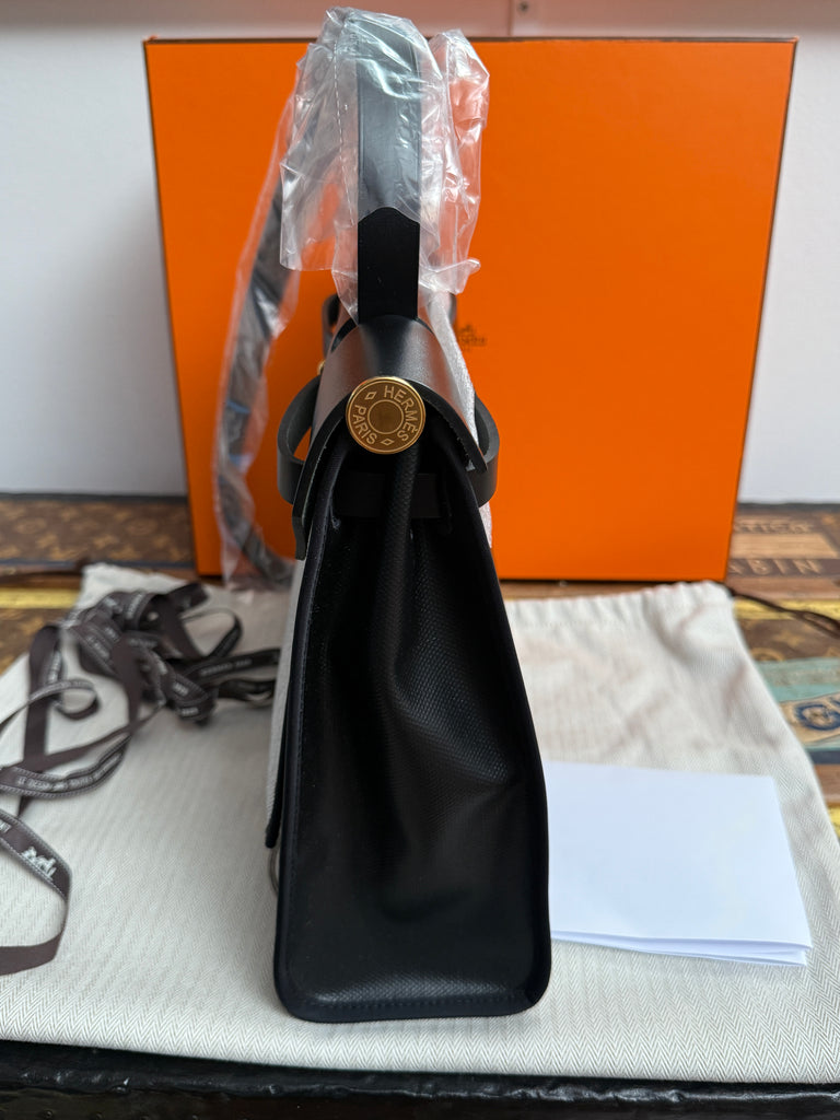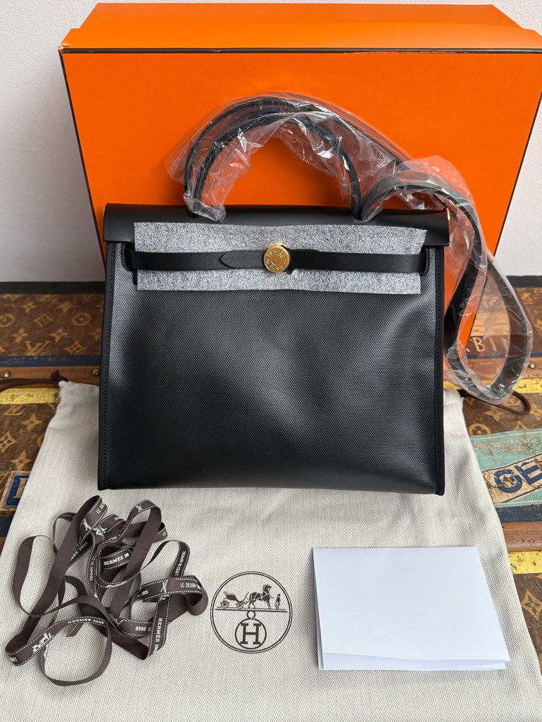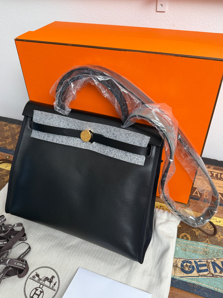 Borsa a mano e a spalla Hermès modello Herbag 31 realizzata in canvas cerato color nero, dettagli in pelle color Nero e parti metalliche dorate. Tasca sul retro in Ecrù grigio/nero. Anno 2025