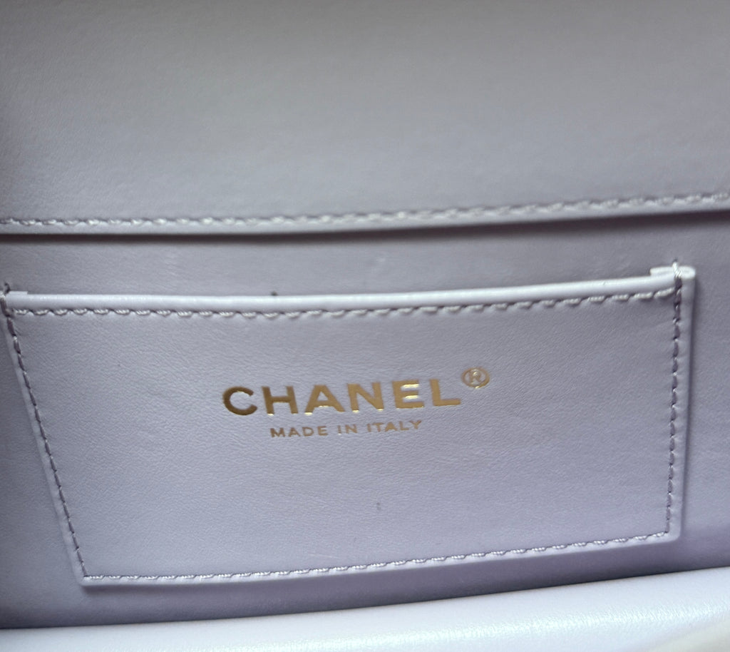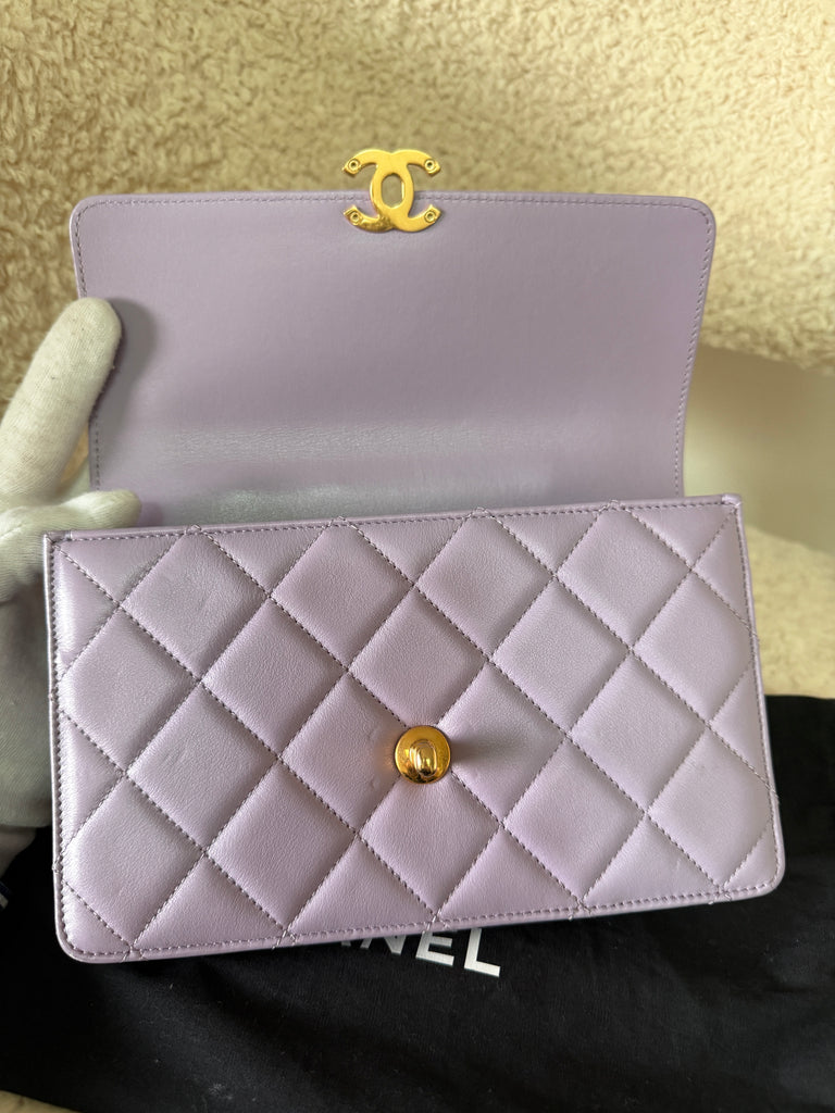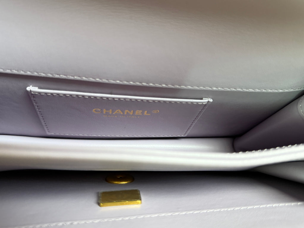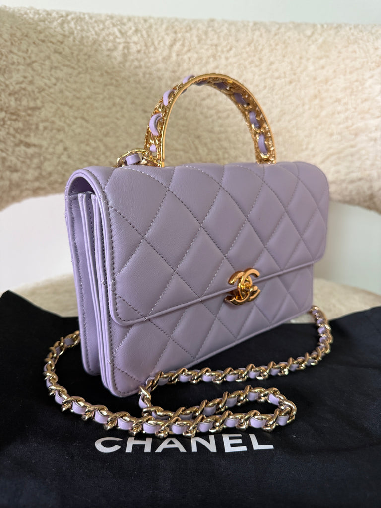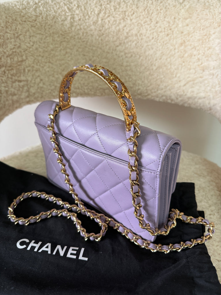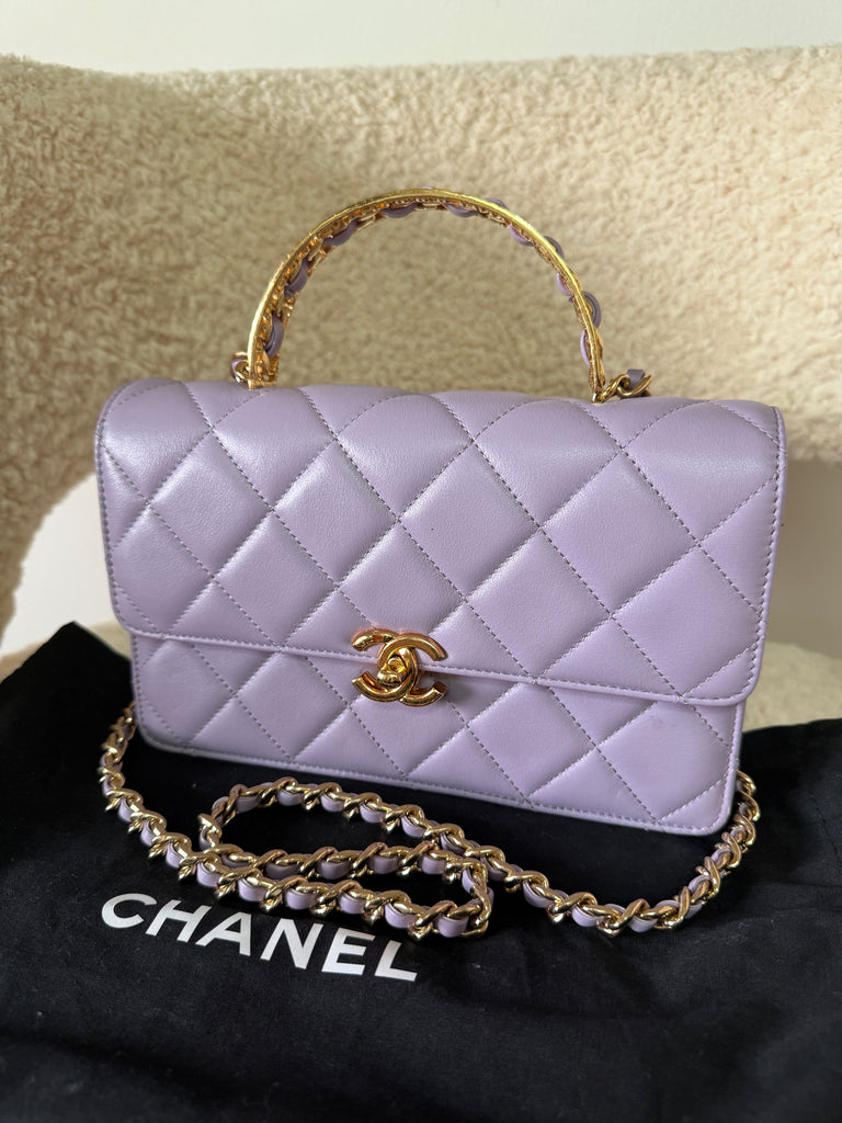 Borsa a mano e a spalla Chanel modello Handle Small in pelle di agnello lilla e metalleria dorata.