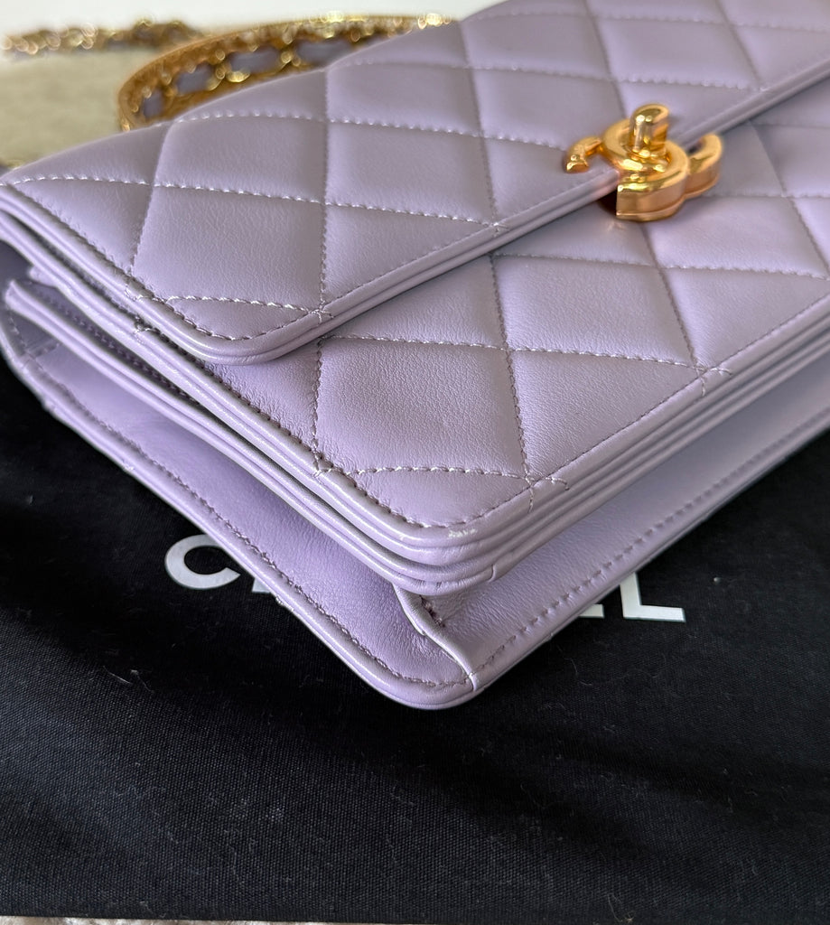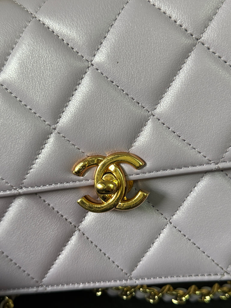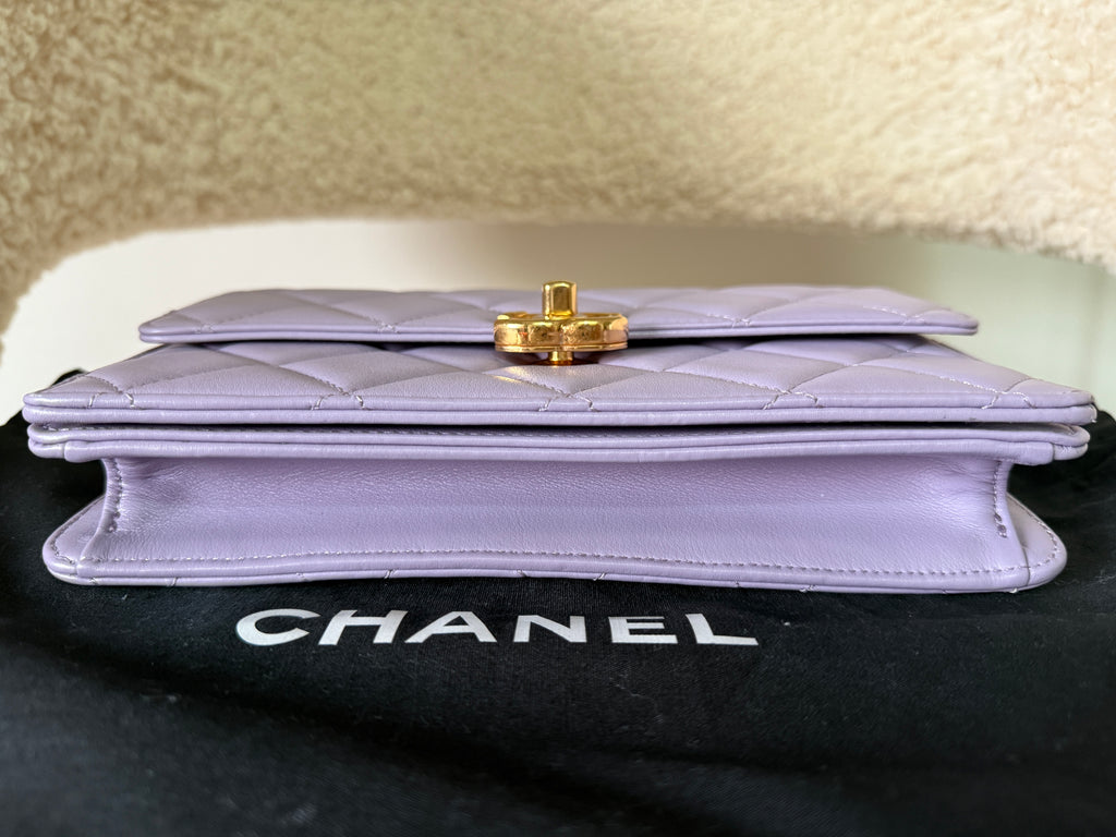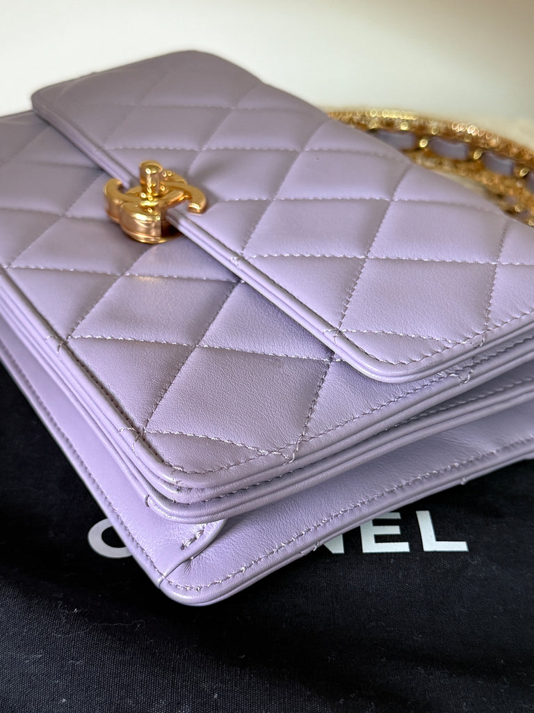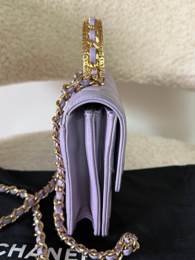 Borsa a mano e a spalla Chanel modello Handle Small in pelle di agnello lilla e metalleria dorata.