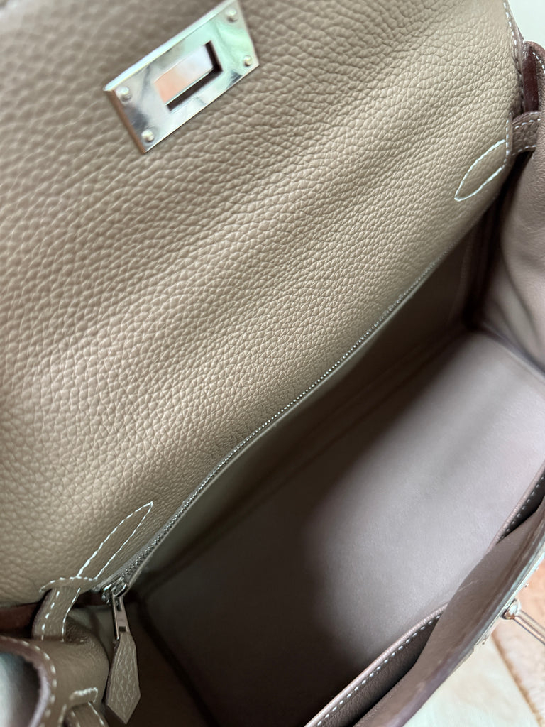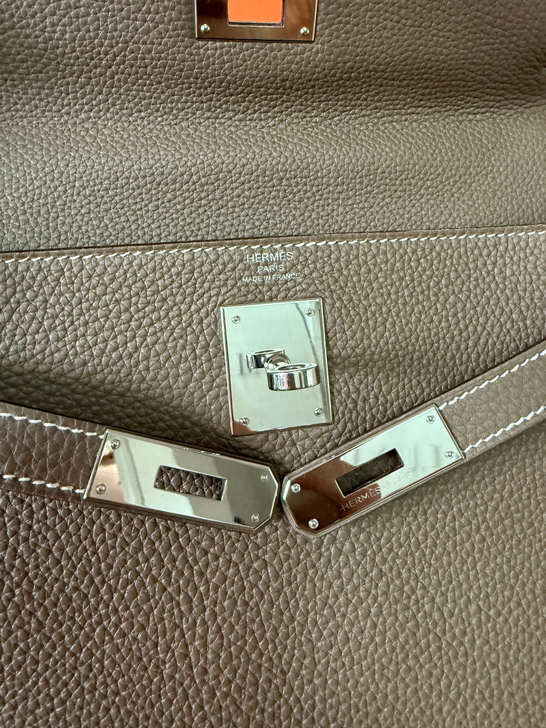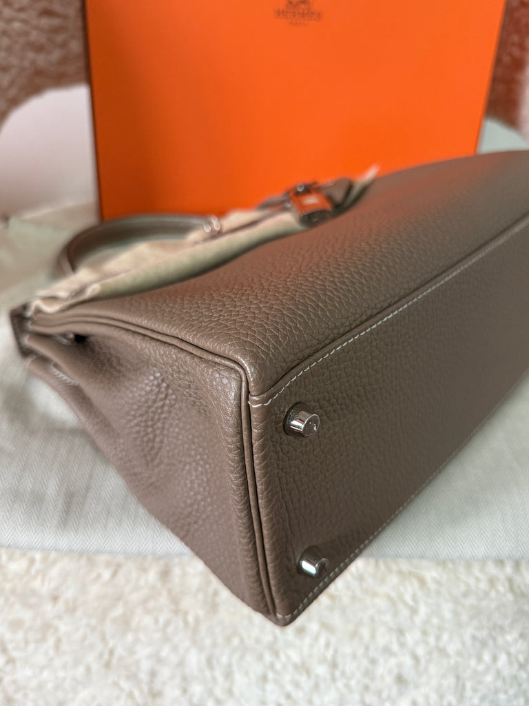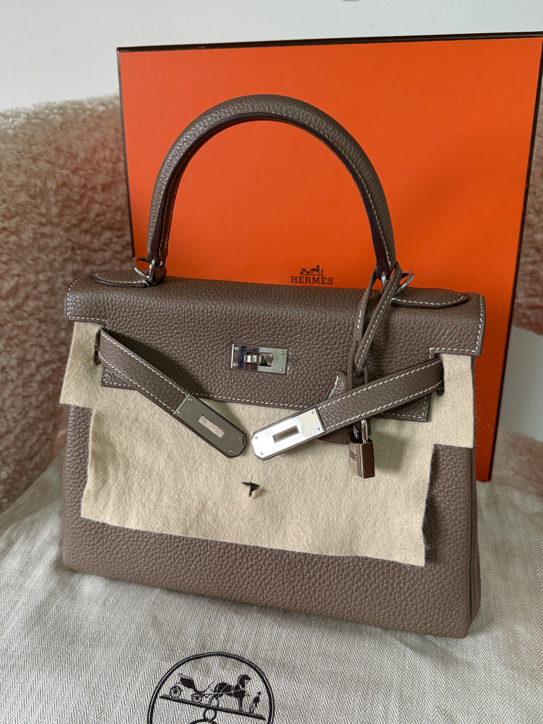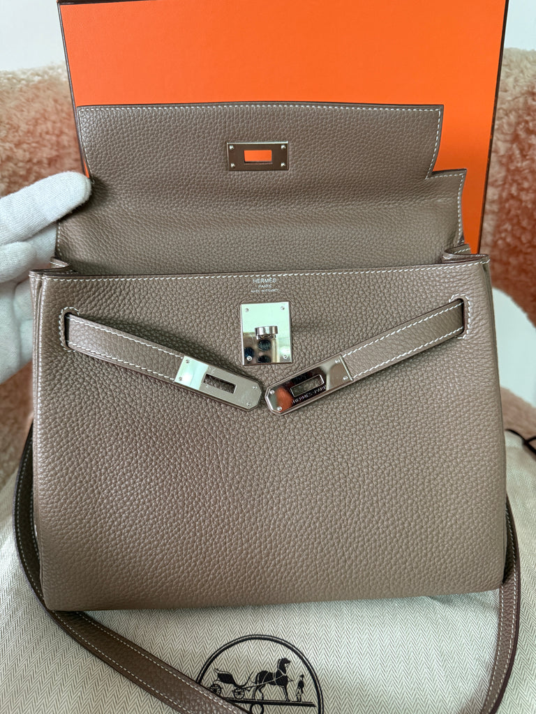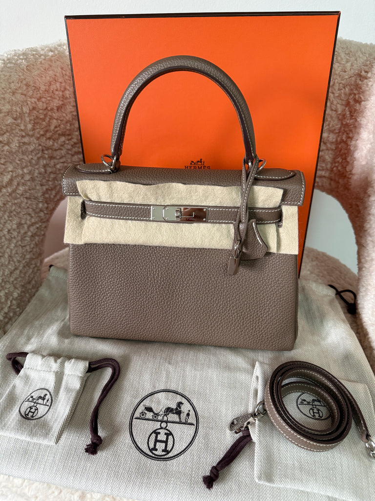 Borsa a mano Hermès con tracolla amovibile modello iconico Kelly misura 28 in pellame Clemence colore Etoupe e metalleria palladio. Anno 2022