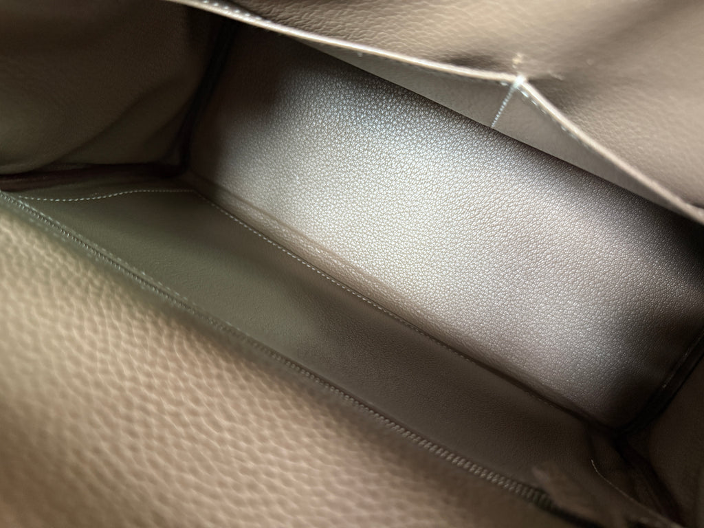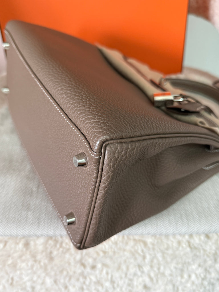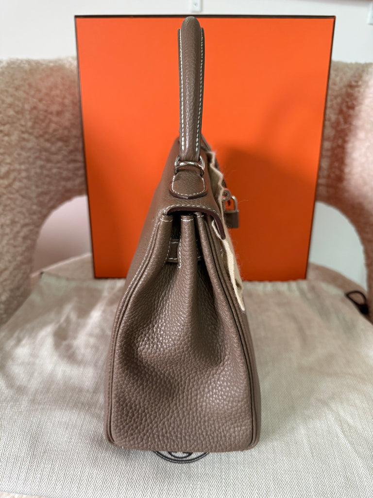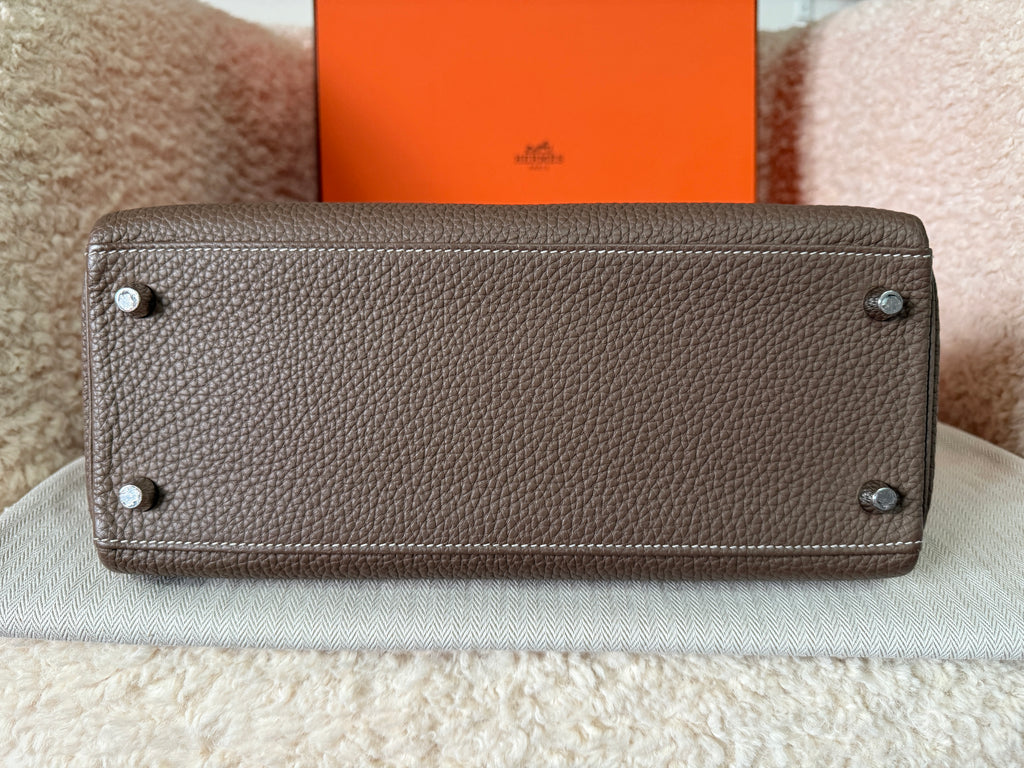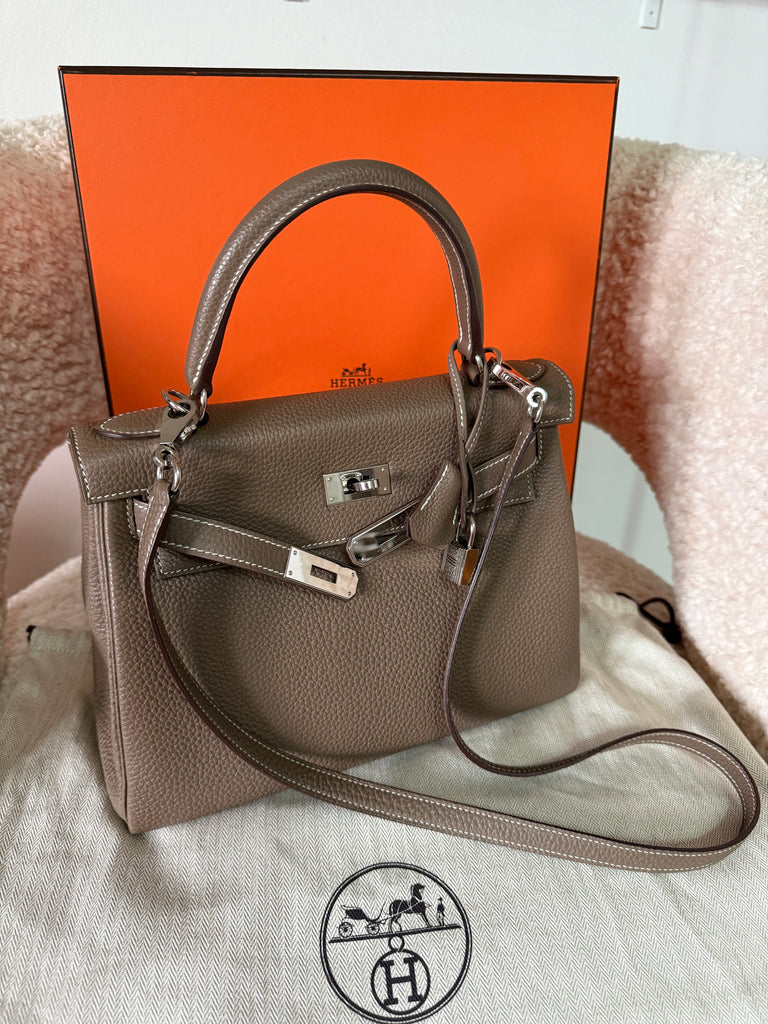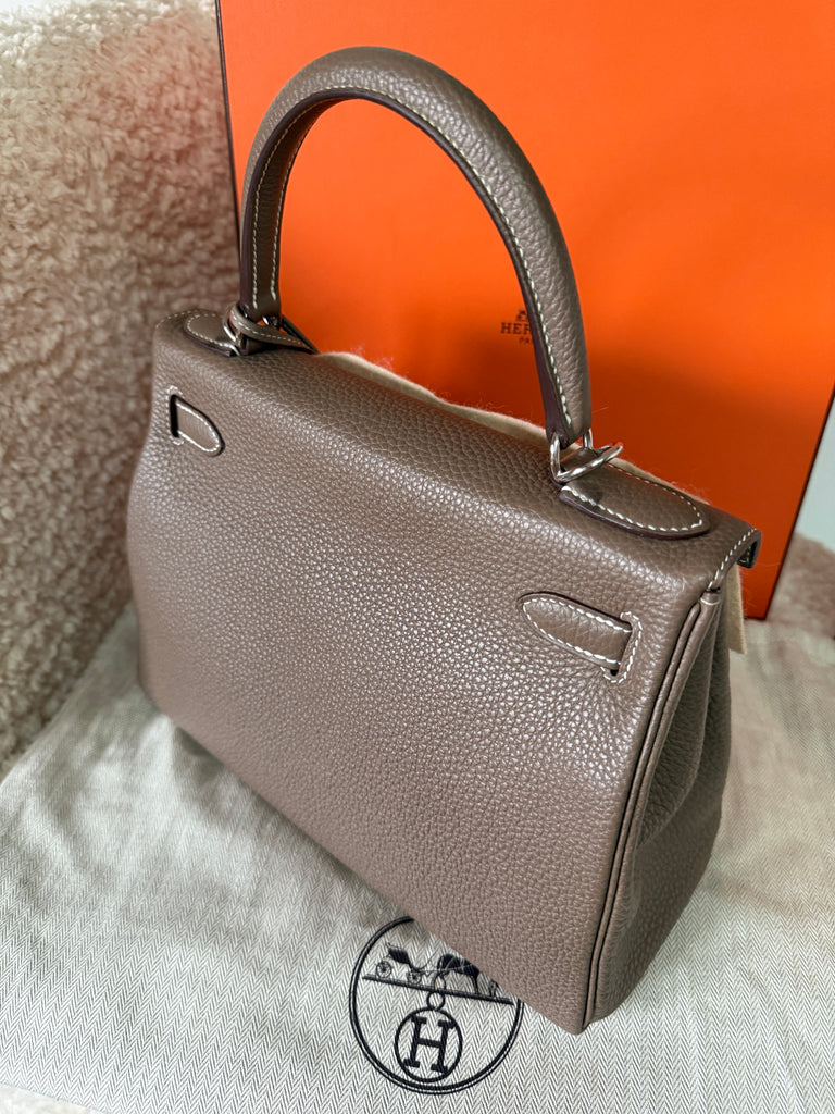Borsa a mano Hermès con tracolla amovibile modello iconico Kelly misura 28 in pellame Clemence colore Etoupe e metalleria palladio. Anno 2022