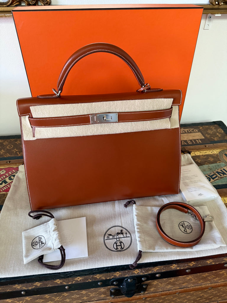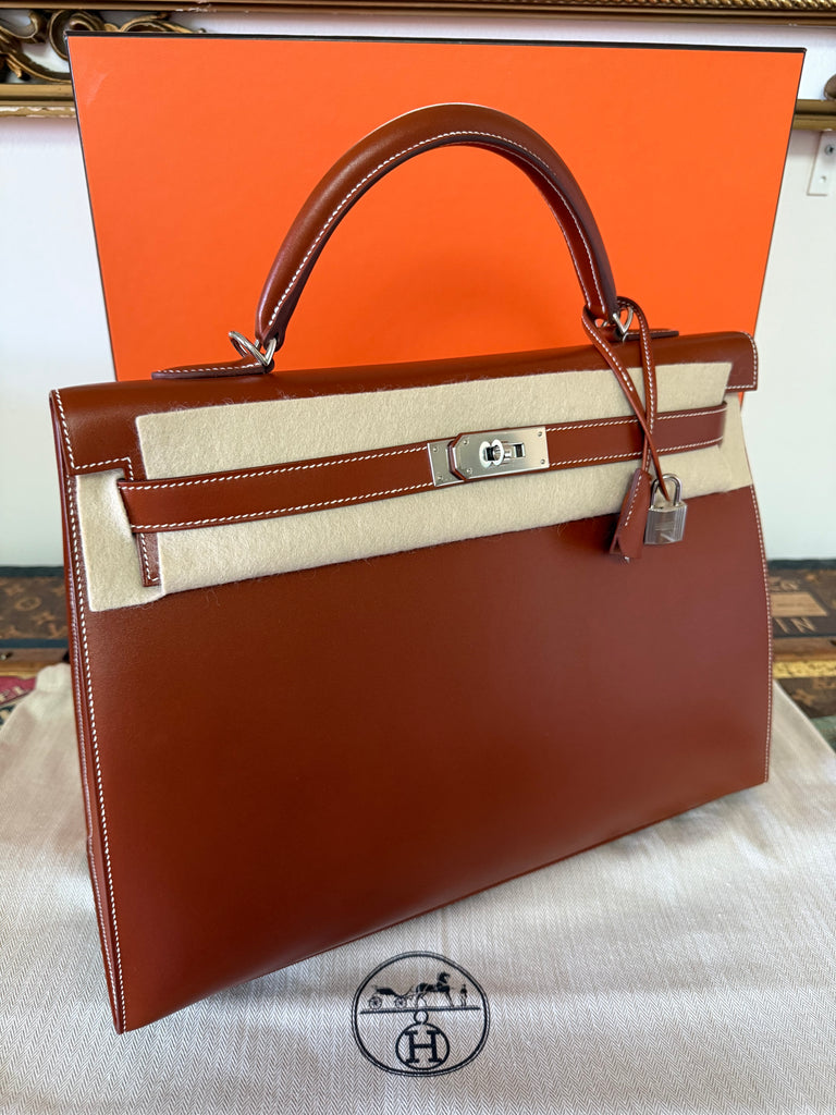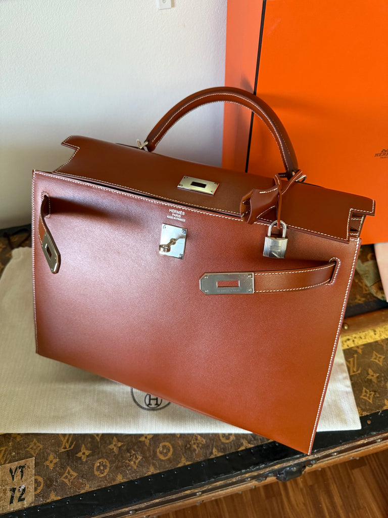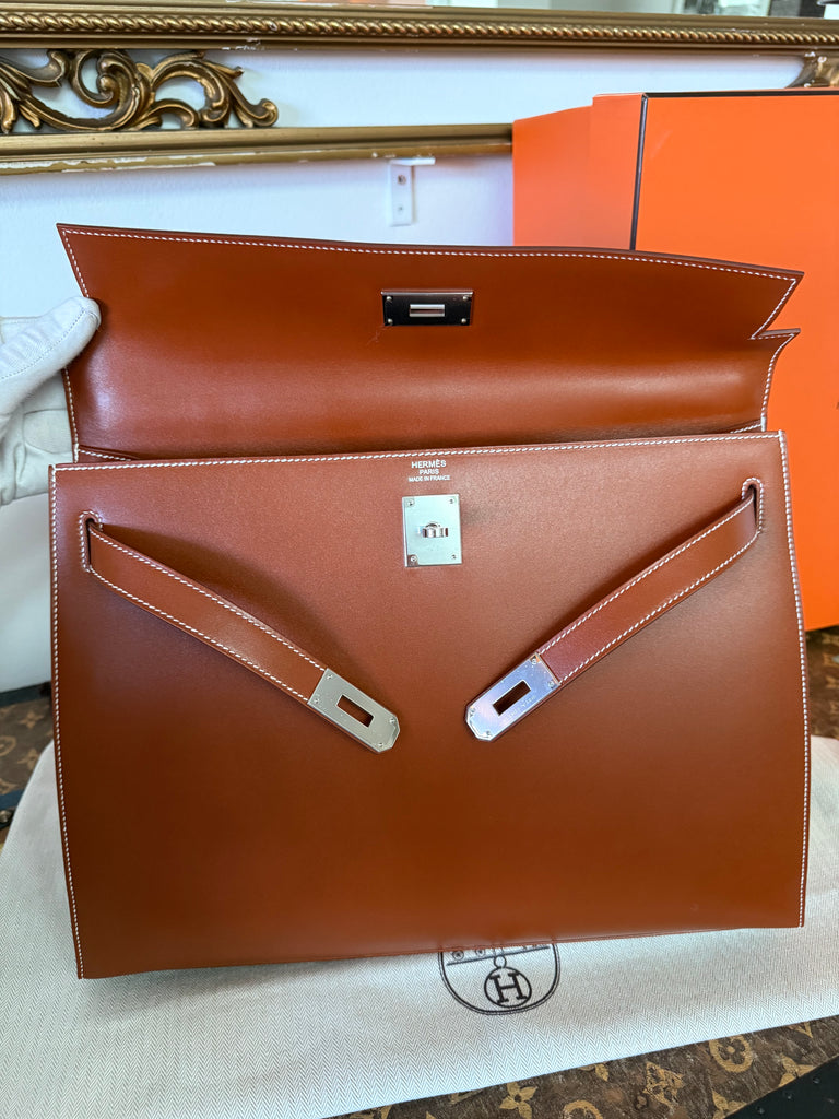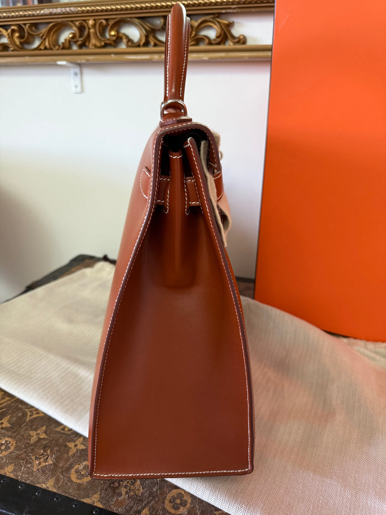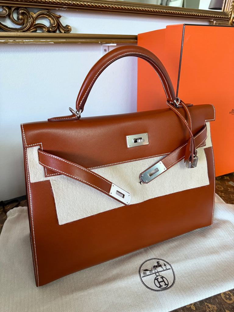 Borsa a mano con tracolla Hermès modello Kelly 40 in pellame tadelakt colore fauve, interno color gold. Anno 2021