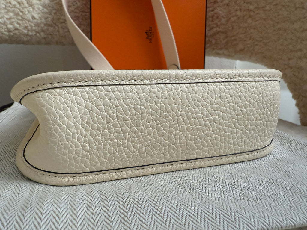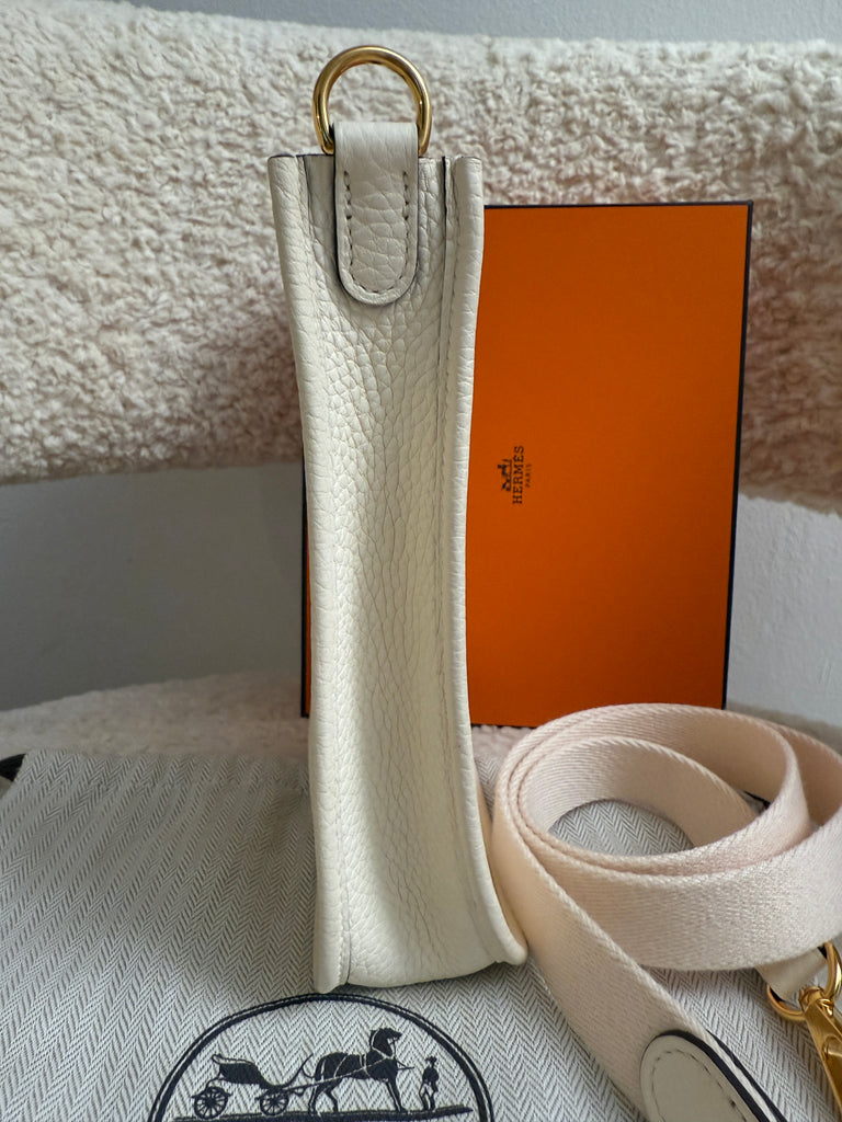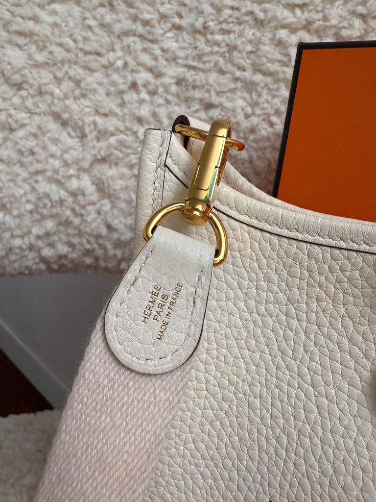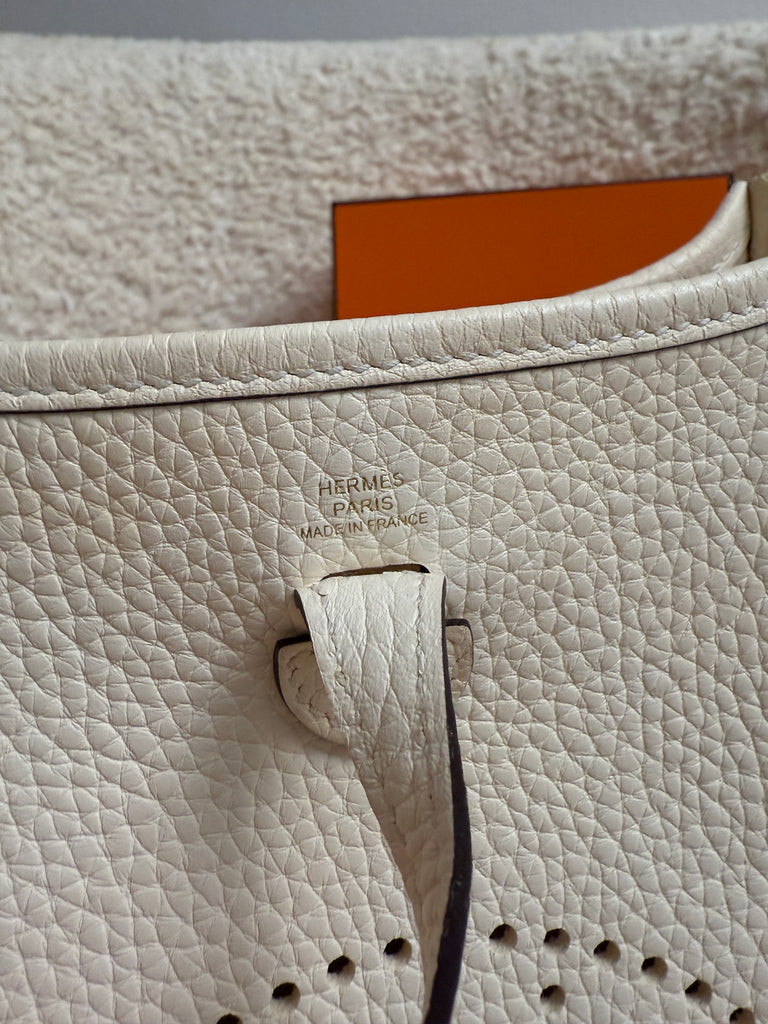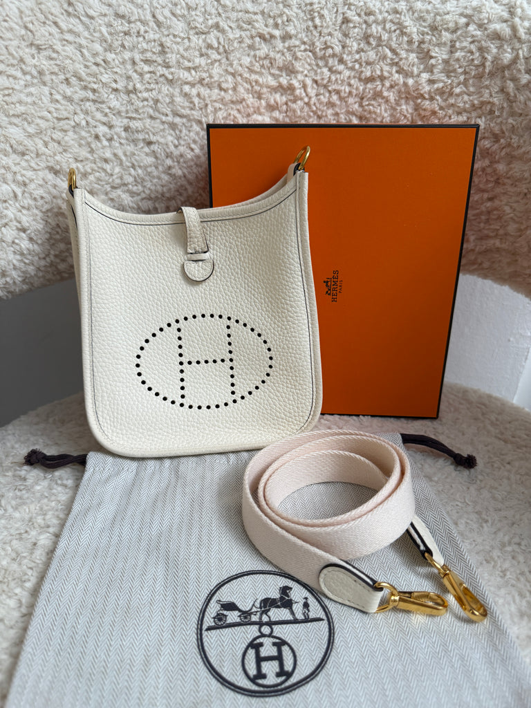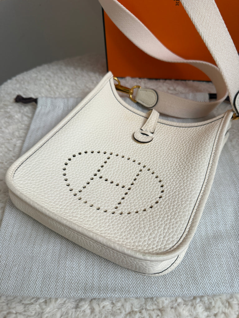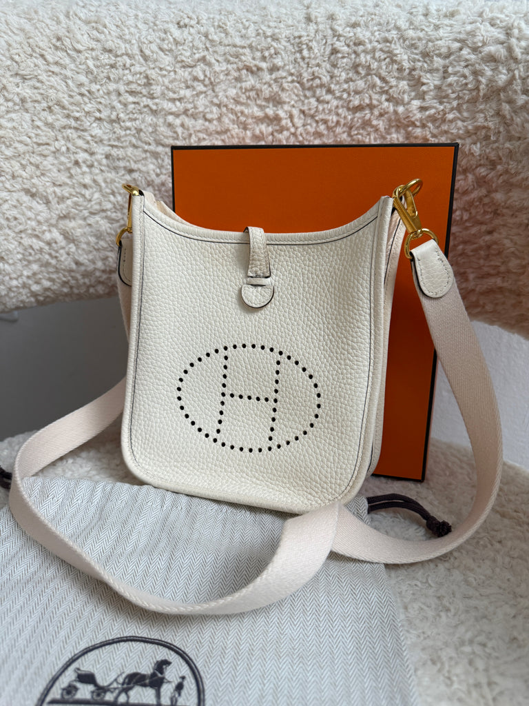 Borsa a tracolla Hermès modello Mini Evelyne in pellame Taurillon Clemence color Nata e hardware dorato. Anno 2022. Si segnala che la tracolla è stata accorciata Hermès su richiesta della cliente.