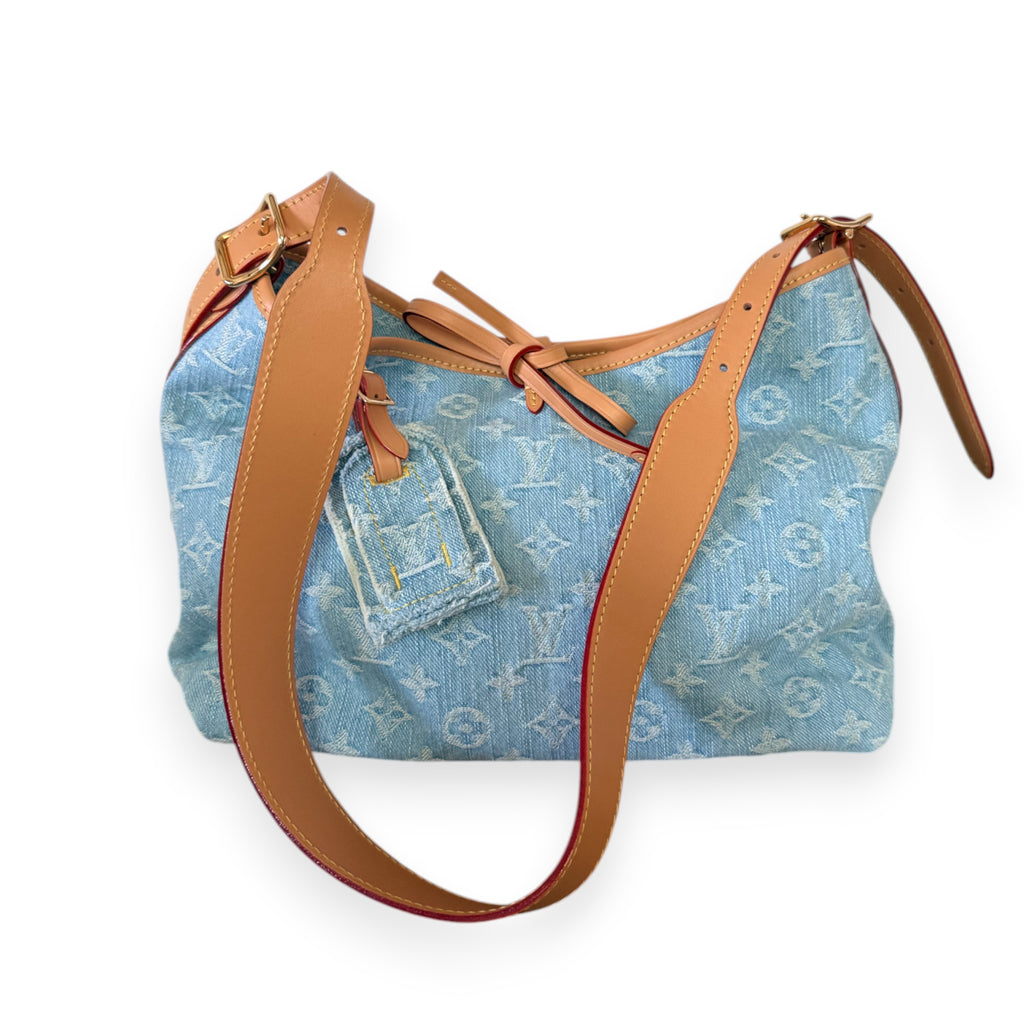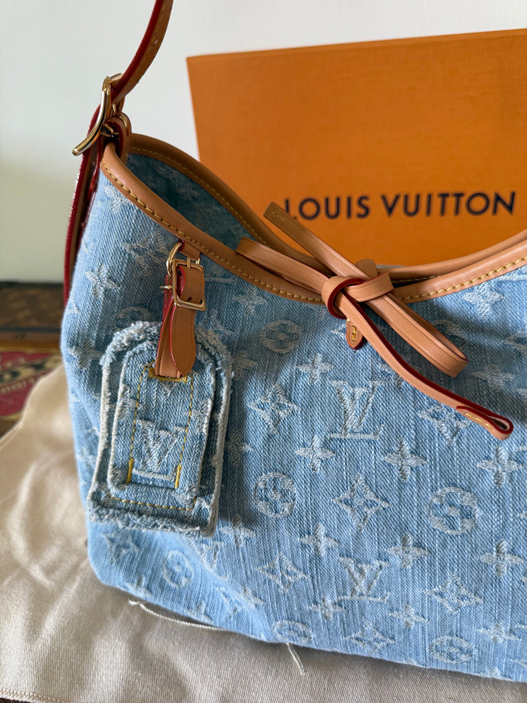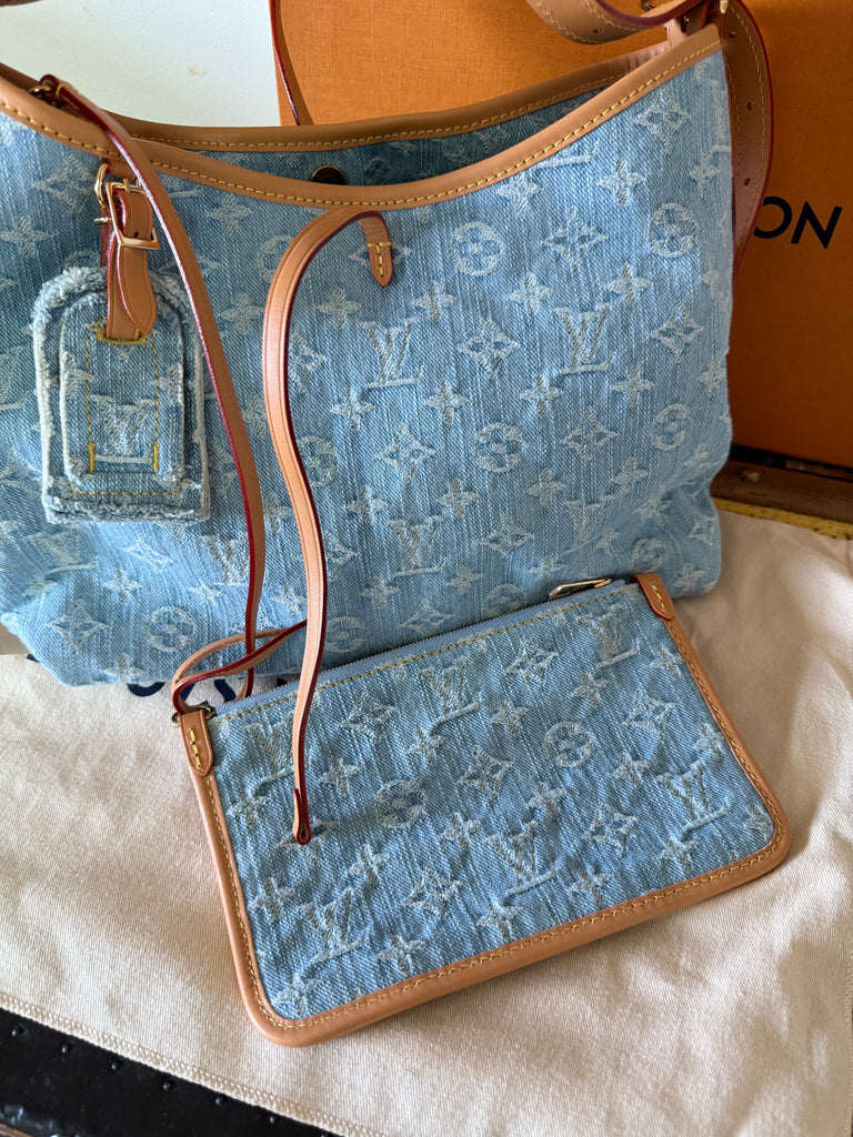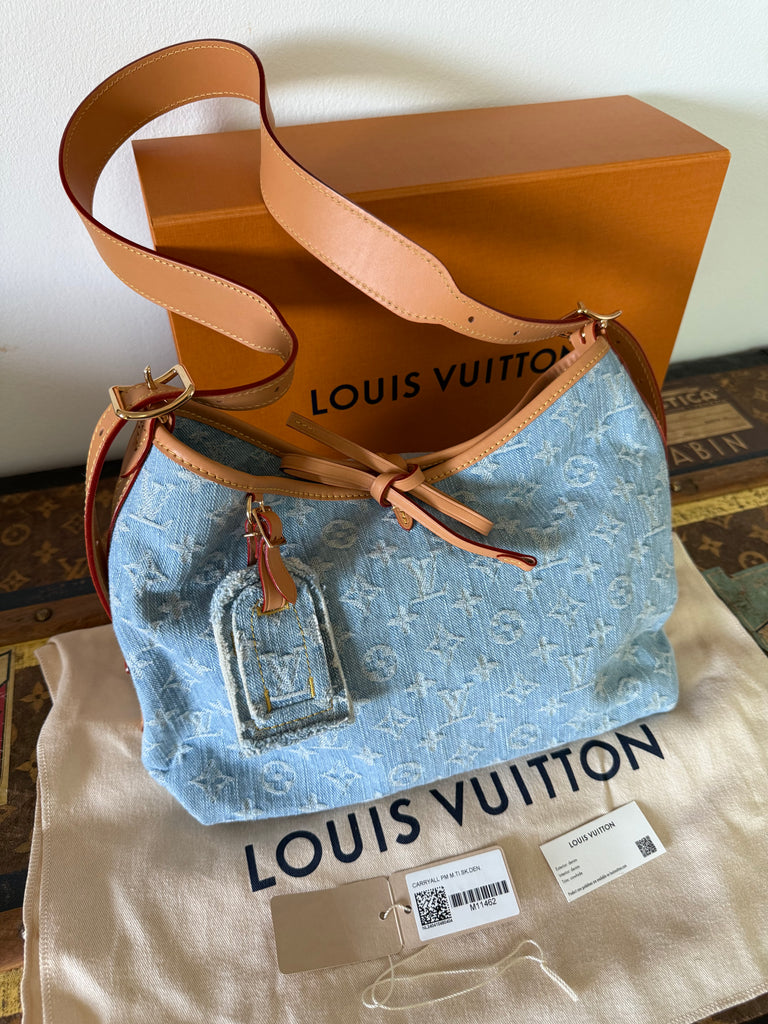 Borsa a spalla con tracolla regolabile Louis Vuitton modello CarryAll PM in Blu Denim Cielo e finiture in vacchetta naturale anticata.