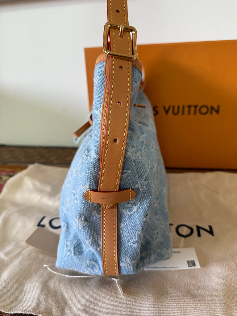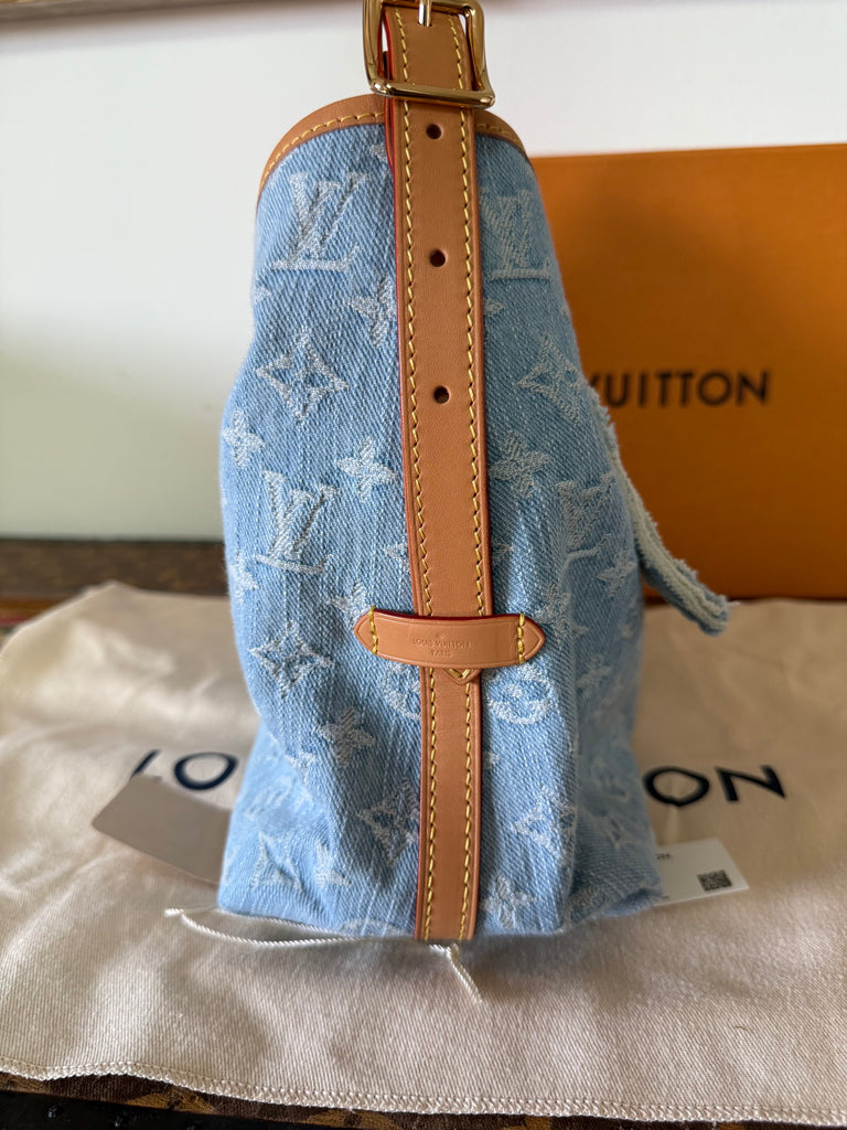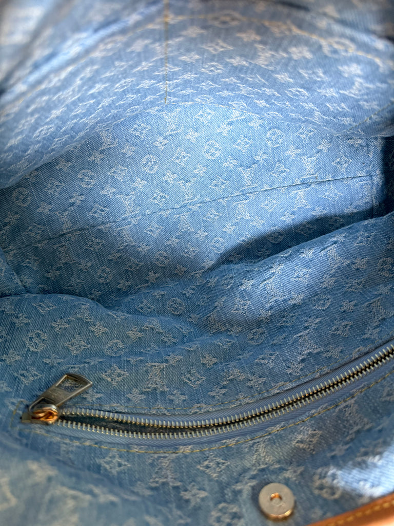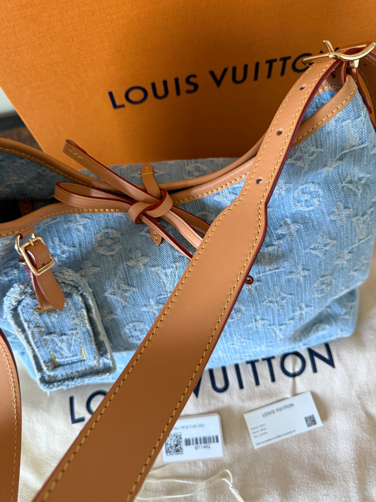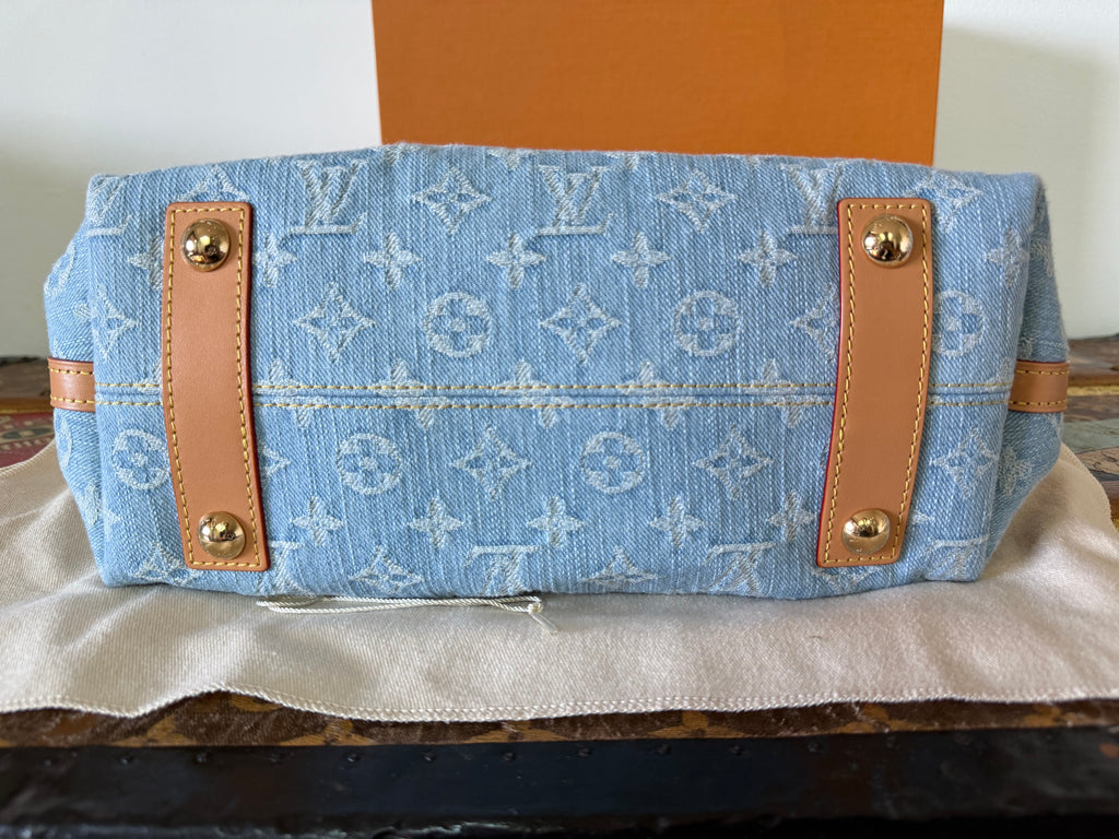 Borsa a spalla con tracolla regolabile Louis Vuitton modello CarryAll PM in Blu Denim Cielo e finiture in vacchetta naturale anticata.