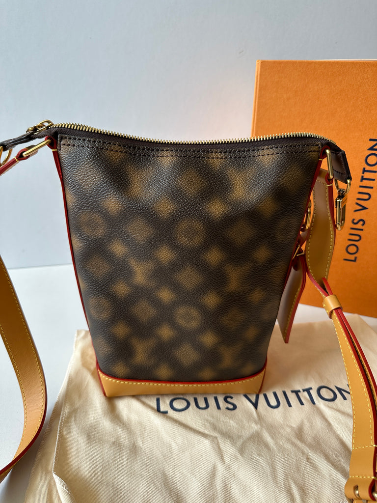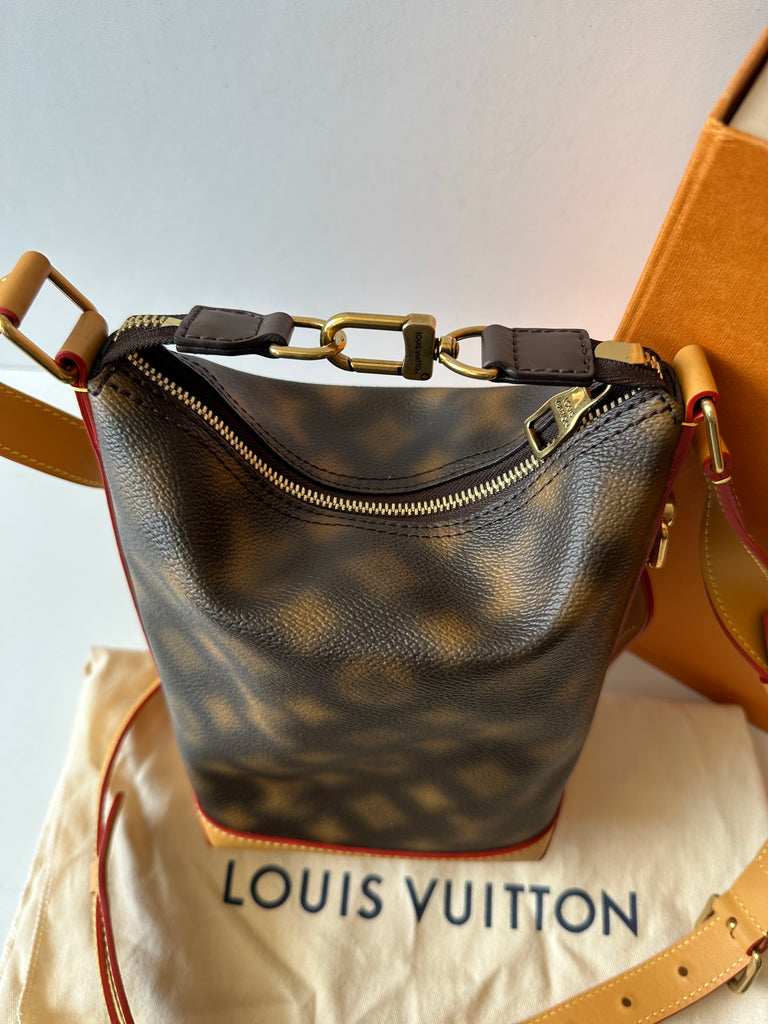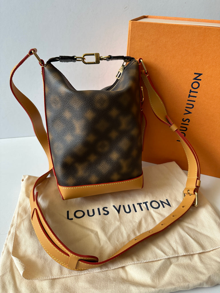 Borsa a tracolla Louis Vuitton modello Hobo Cruiser PM caratterizzata dalla trama Monogram Blurry , metalleria dorata effetto anticato e vacchetta naturale. Anno 2022