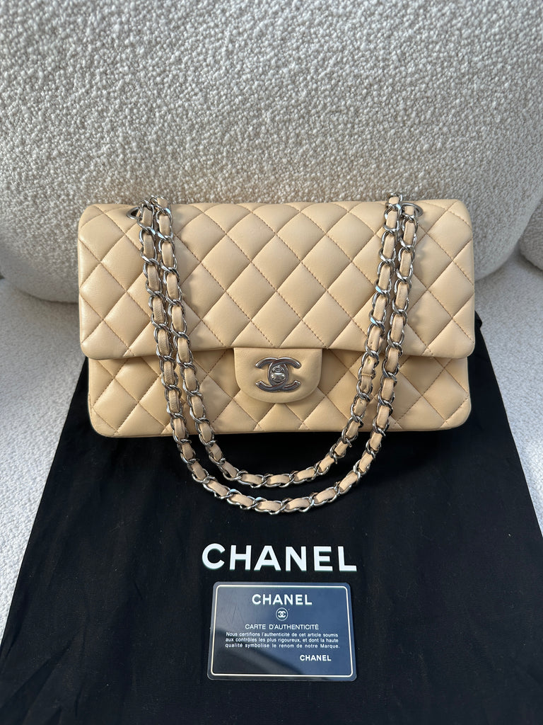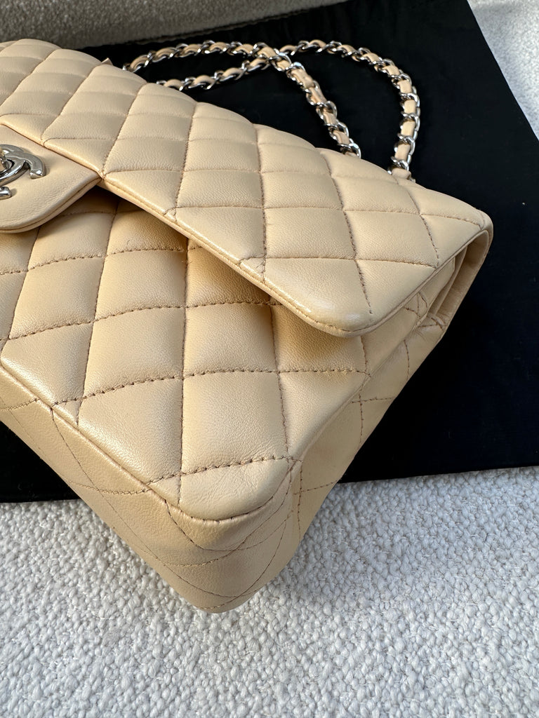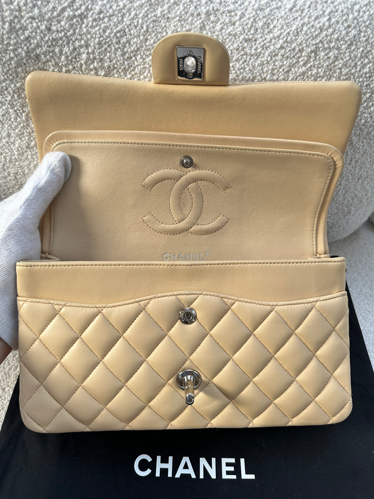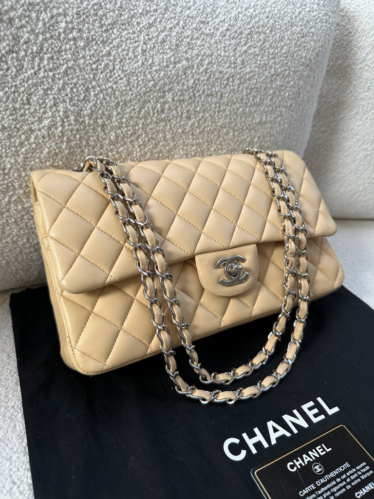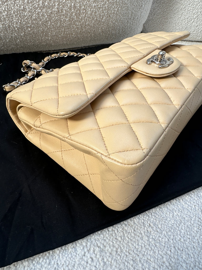 Borsa a spalla Chanel modello Timeless misura Media 25 cm in pelle d'agnello beige, metalleria palladio. Anni 2012.