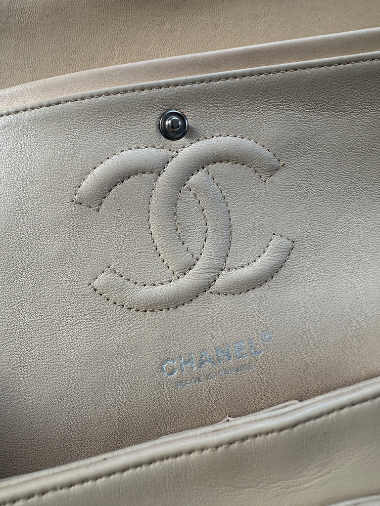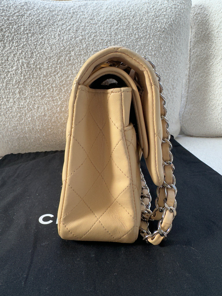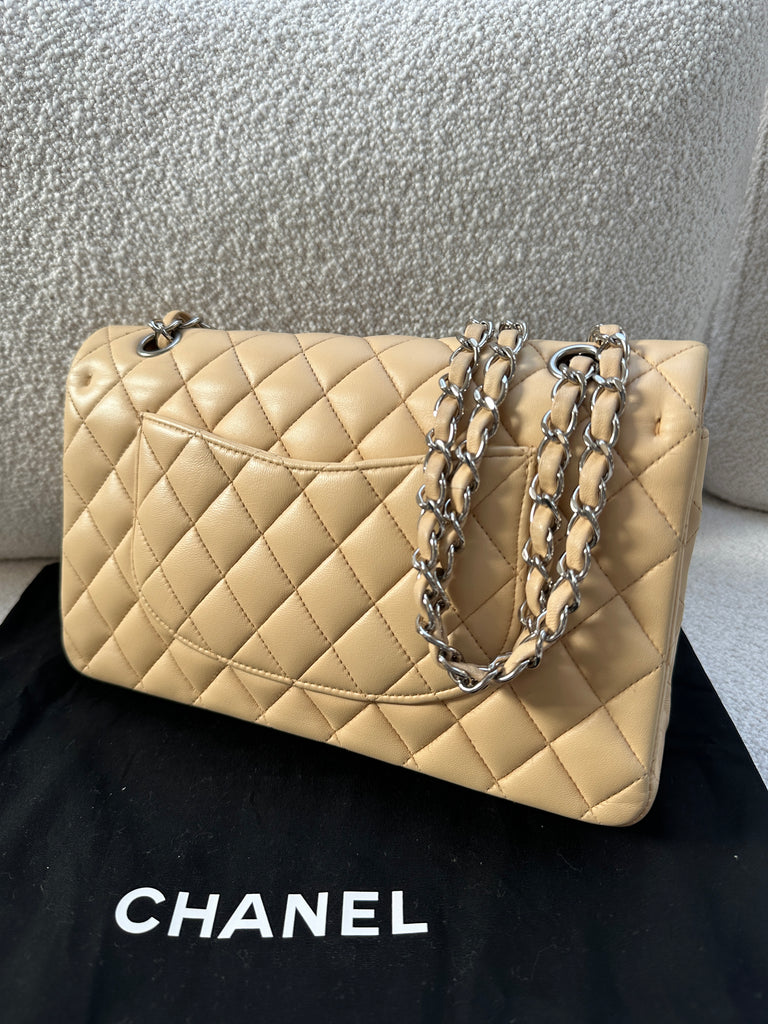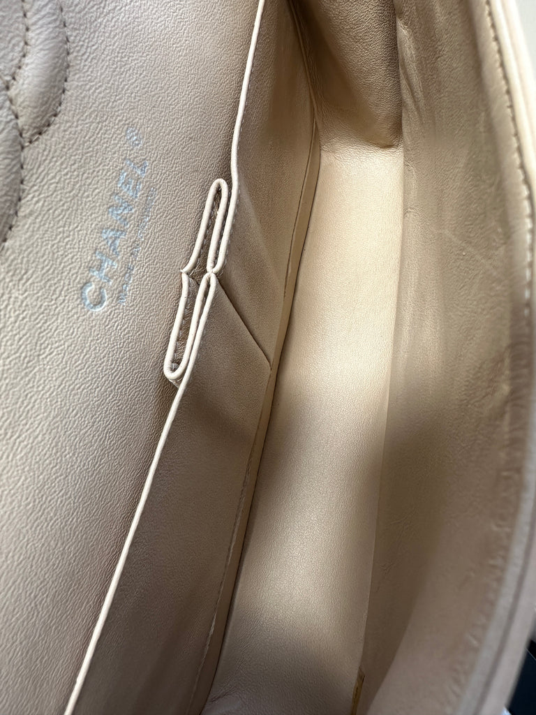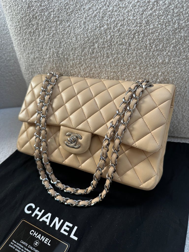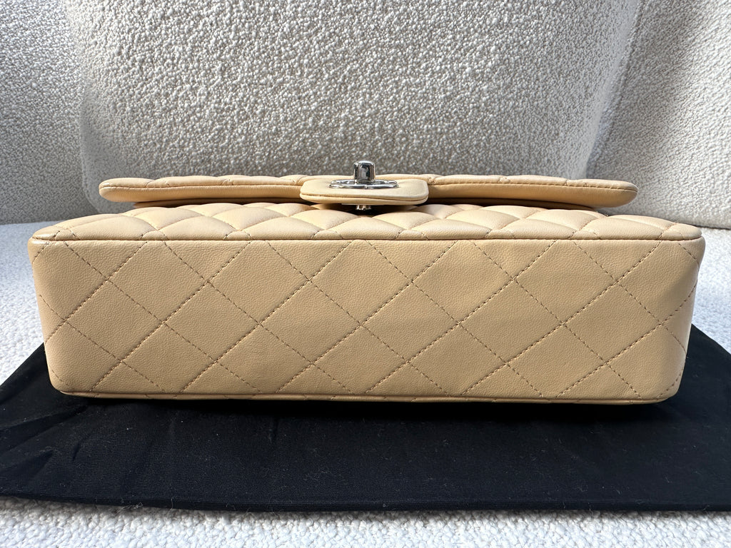 Borsa a spalla Chanel modello Timeless misura Media 25 cm in pelle d'agnello beige, metalleria palladio. Anni 2012.