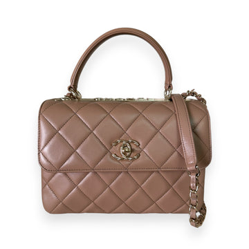 Borsa a spalla con manico Chanel modello iconico Trendy misura Media in pelle d'agnello color beige e metalleria champagne. Anno 2023.