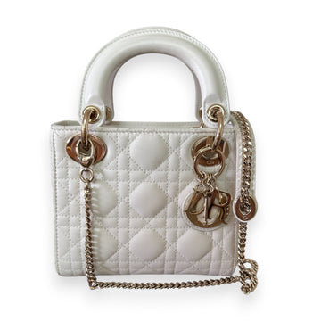 Borsa a mano con tracolla modello Lady Dior misura mini in pelle color panna e metalleria champagne