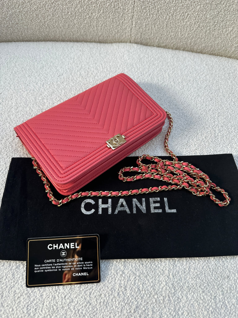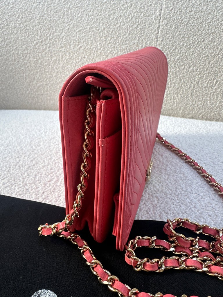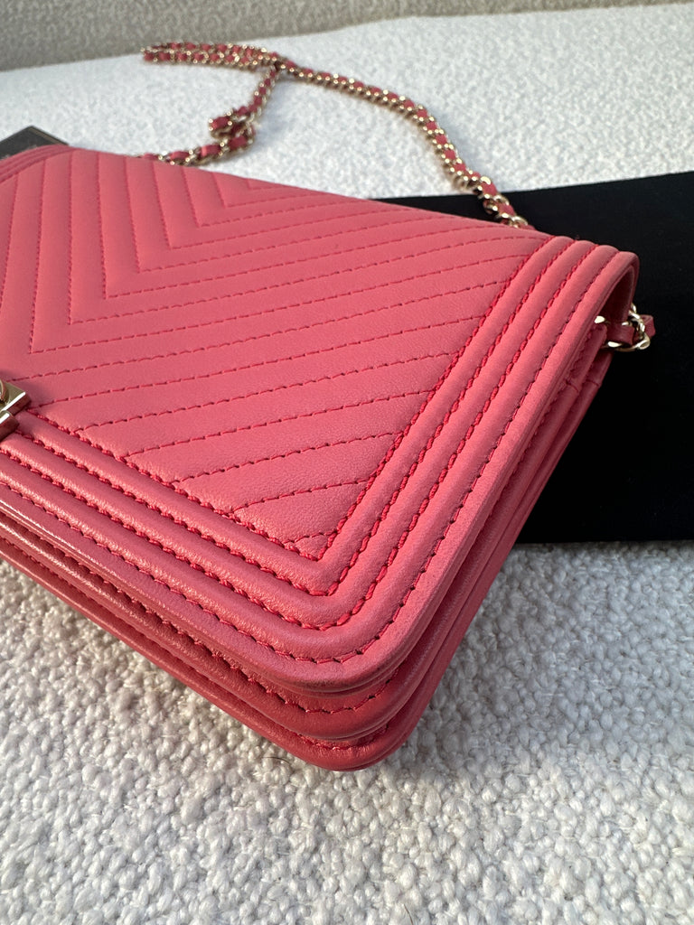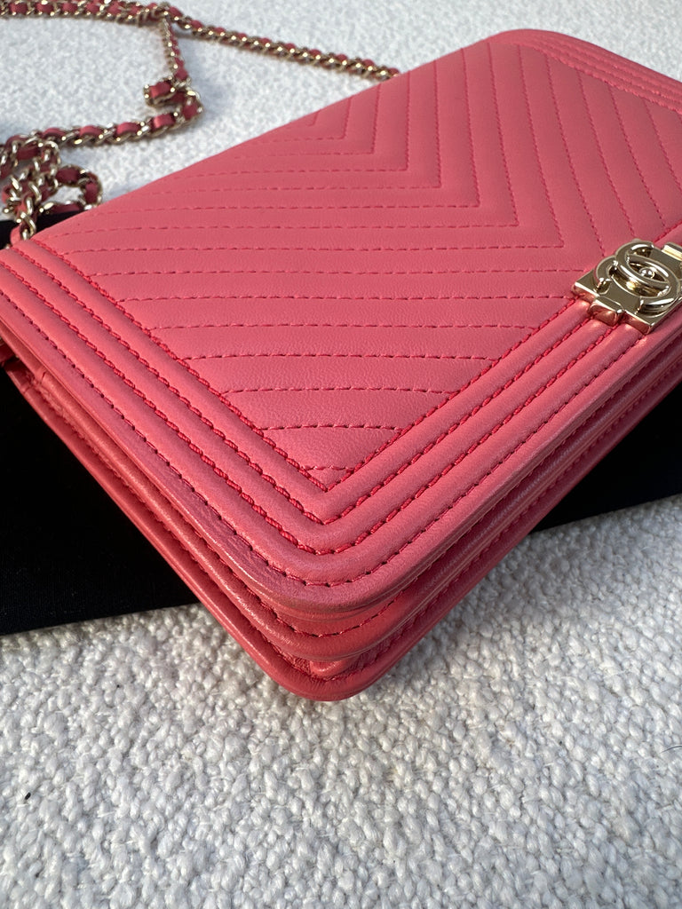 Portafoglio con catena Chanel modello Woc Boy motivo Chevron in pelle d'agnello color rosa e metalleria champagne.