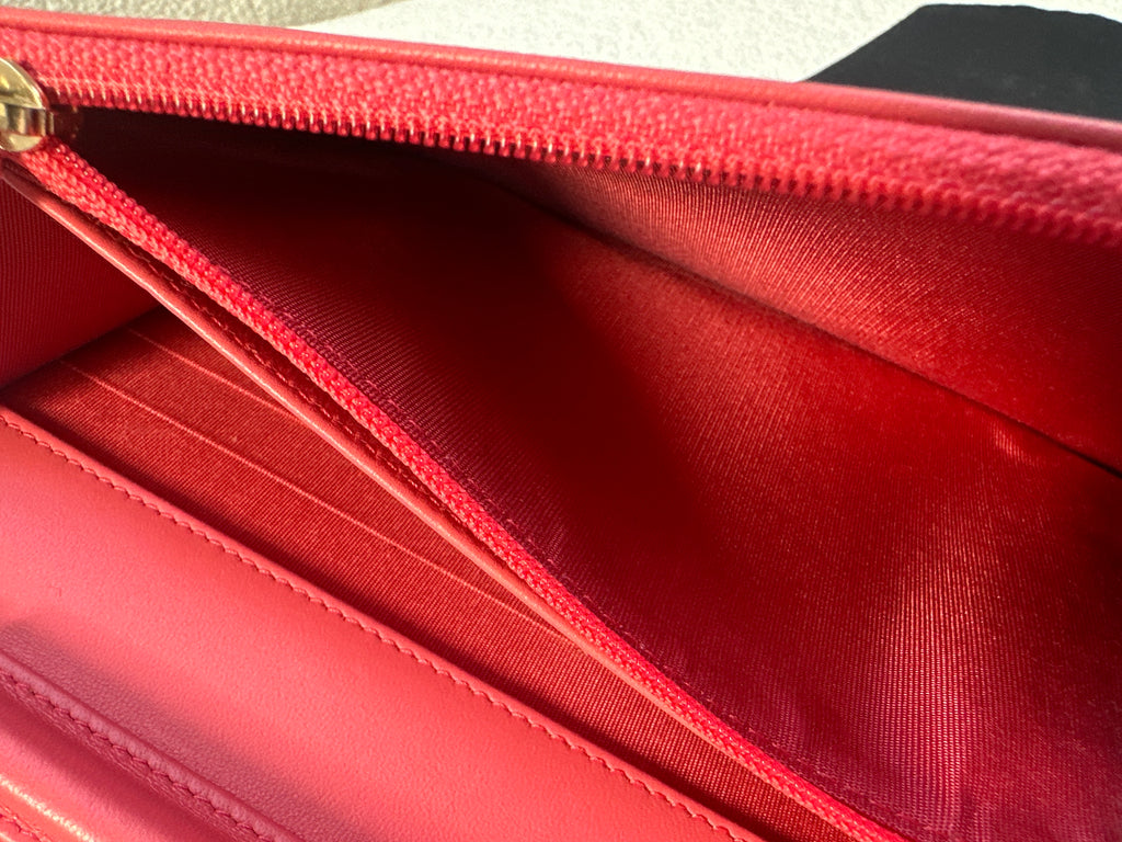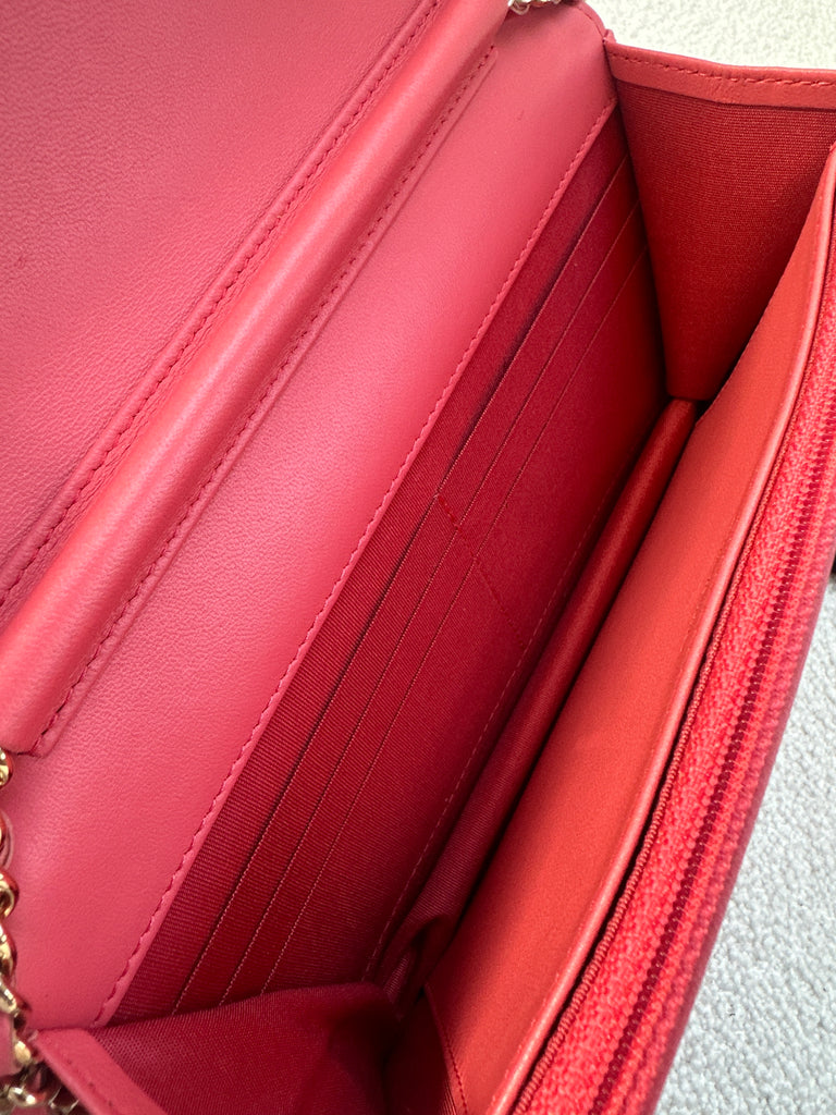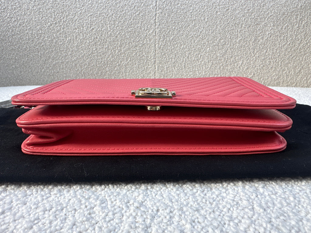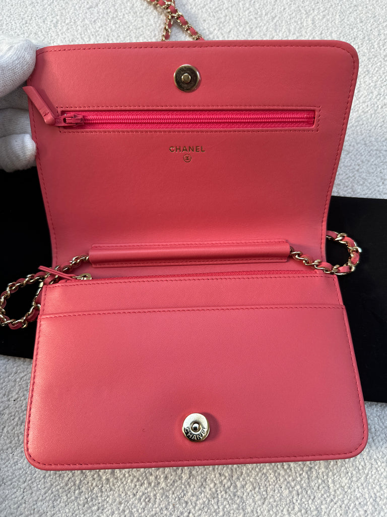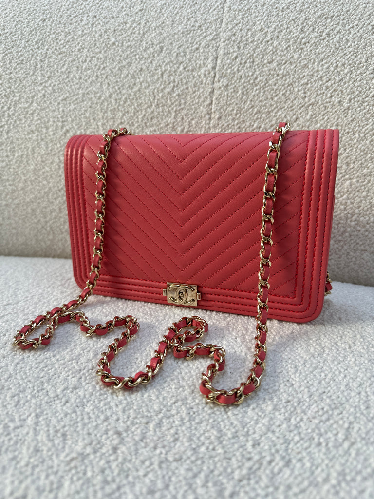 Portafoglio con catena Chanel modello Woc Boy motivo Chevron in pelle d'agnello color rosa e metalleria champagne.