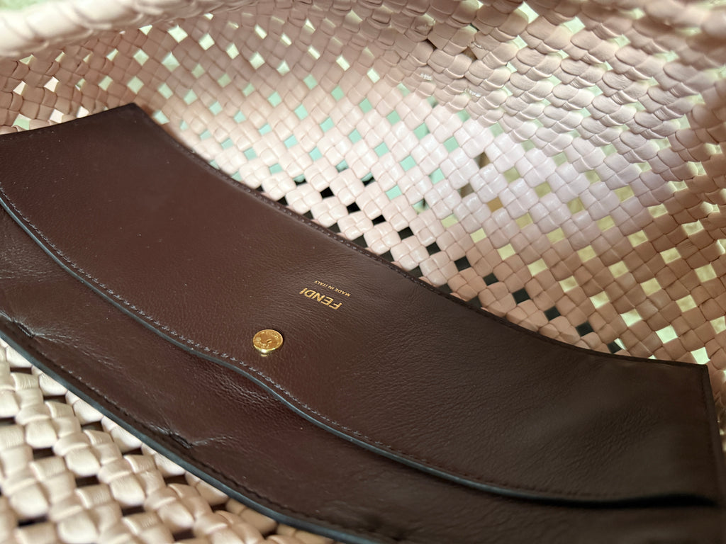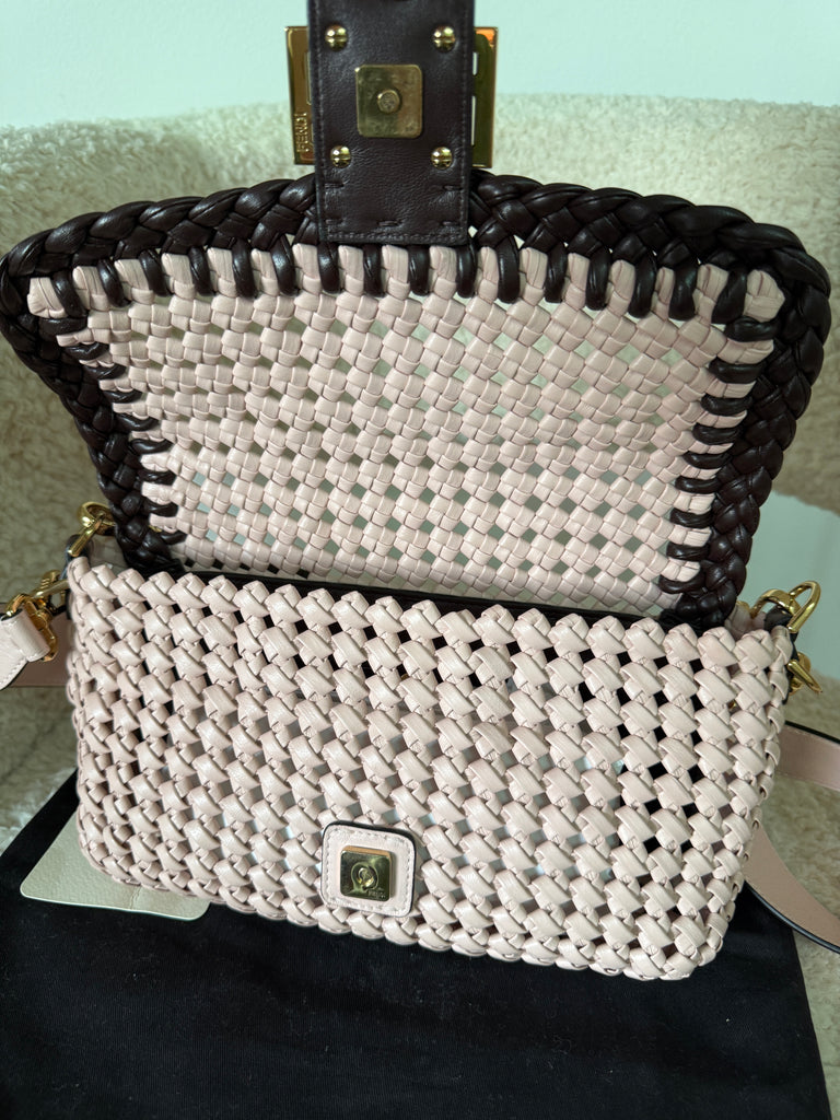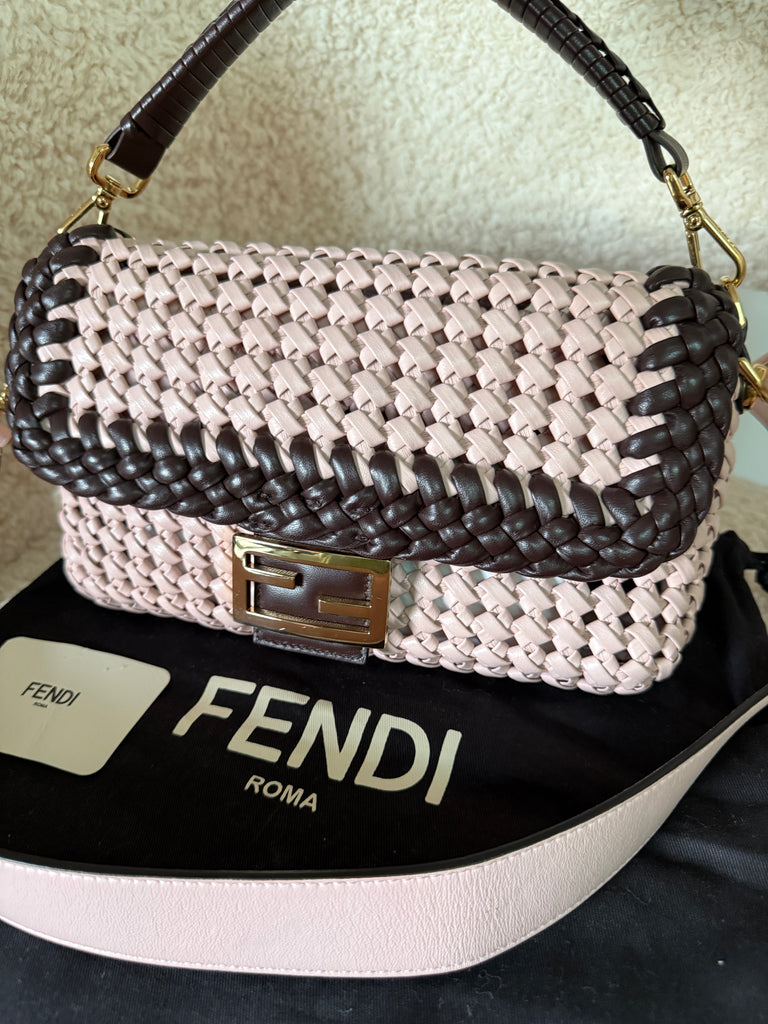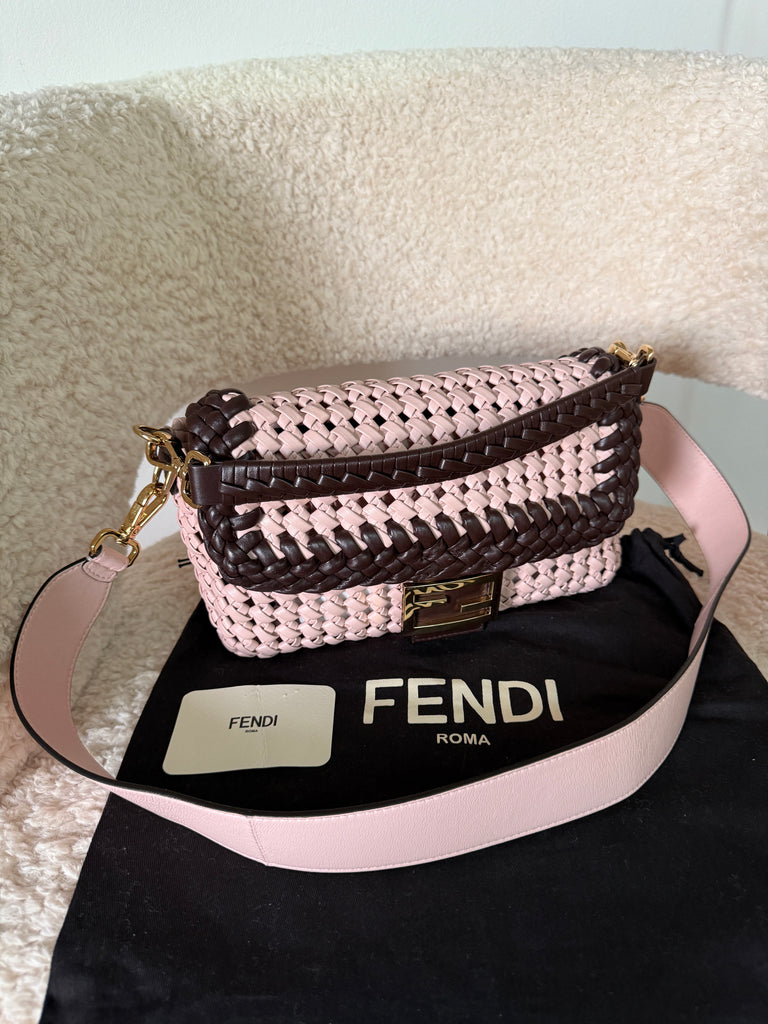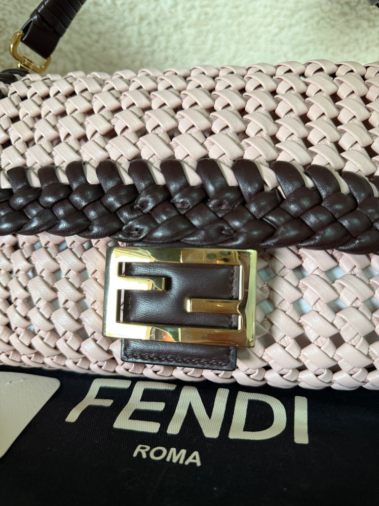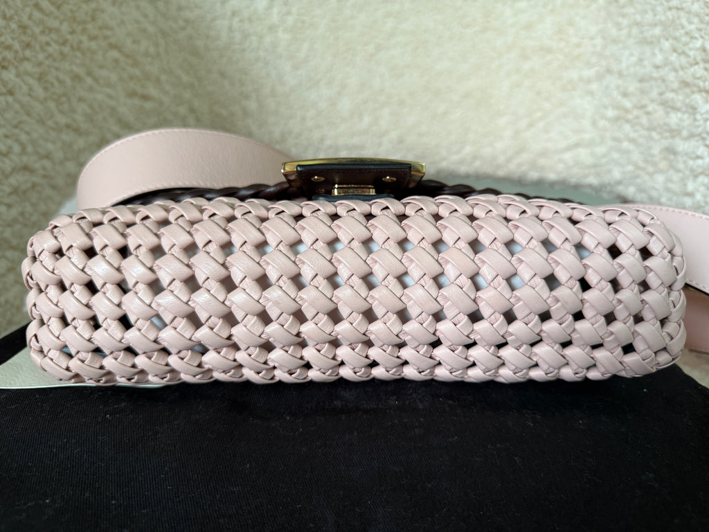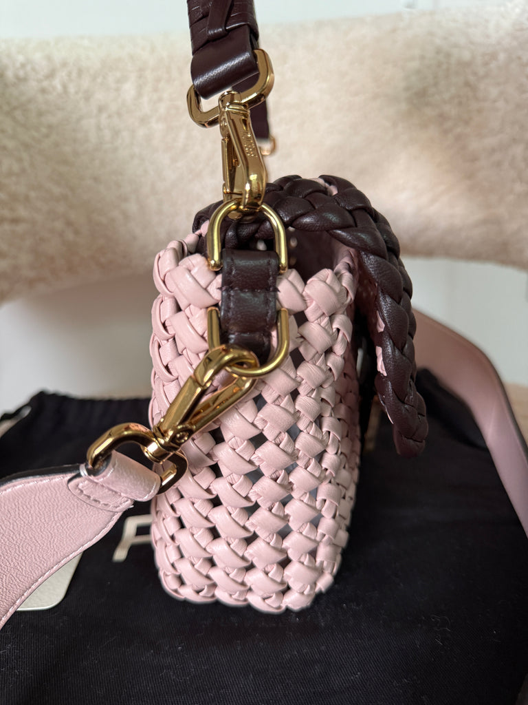 Borsa a mano con tracolla Fendi modello Baguette in pelle intrecciata bicolor rosa e marrone, metalleria dorata.