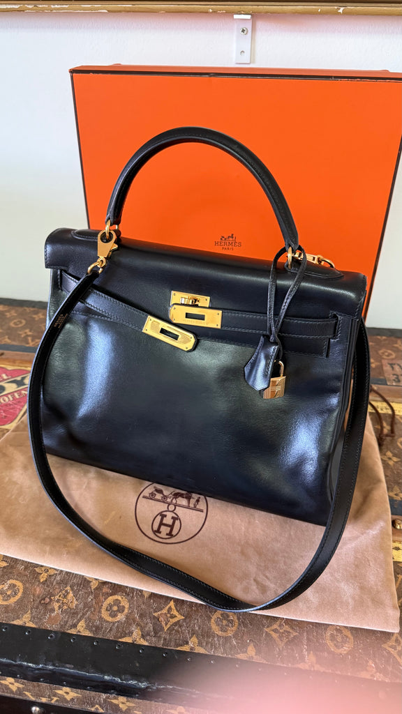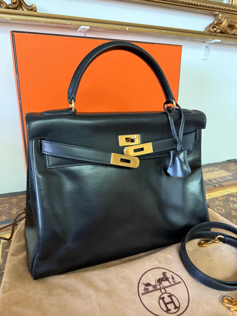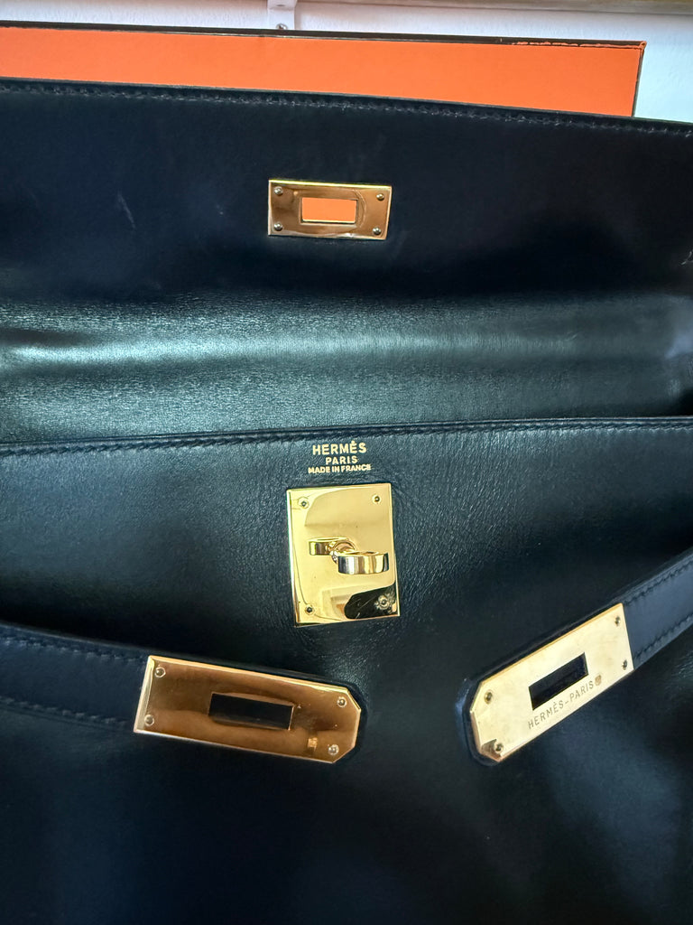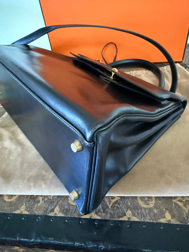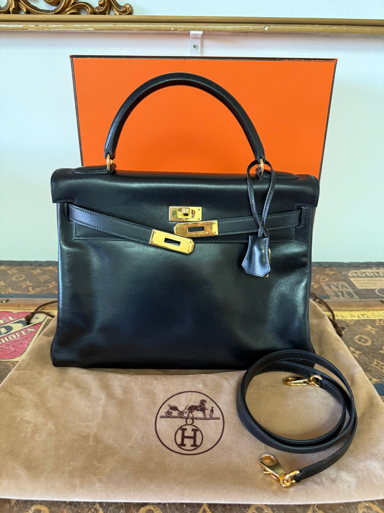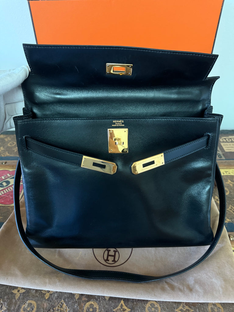 Borsa a mano e tracolla Hermès modello Kelly 32 in pellame Box colore nero, metalleria dorata. Vintage anno 1995, rara!
