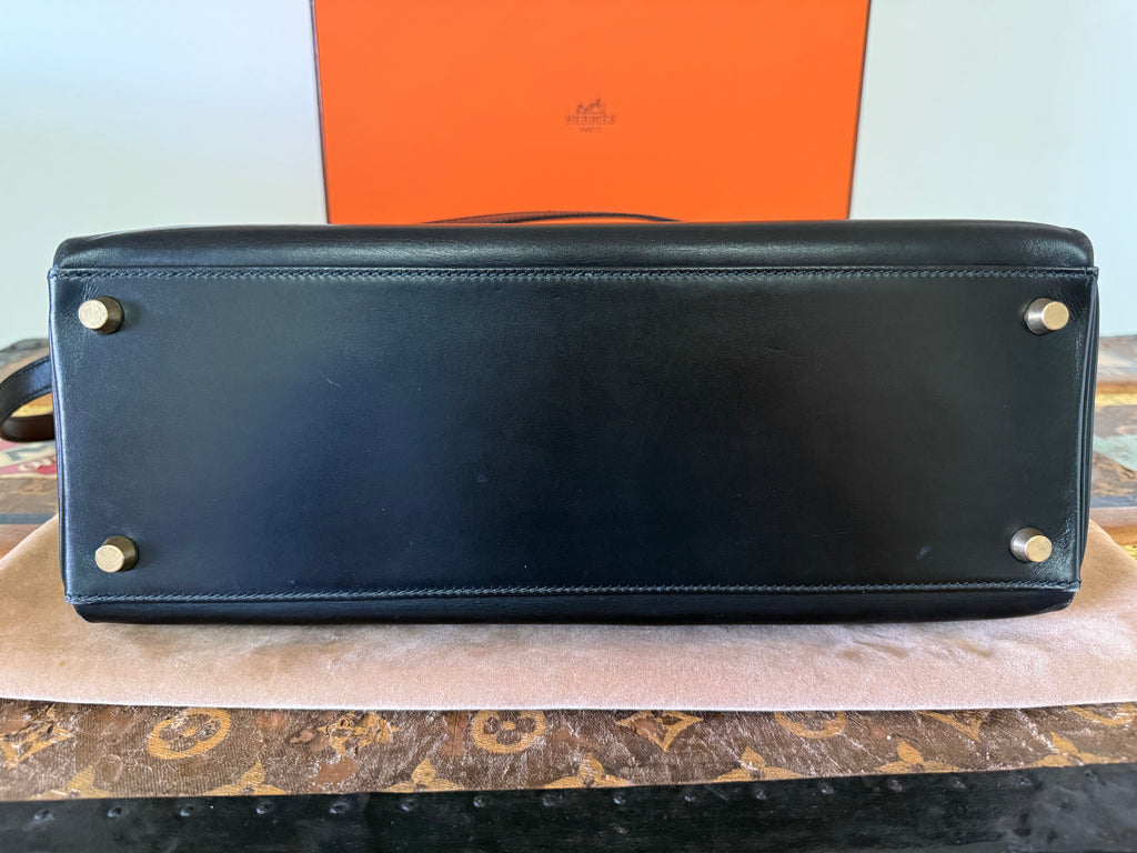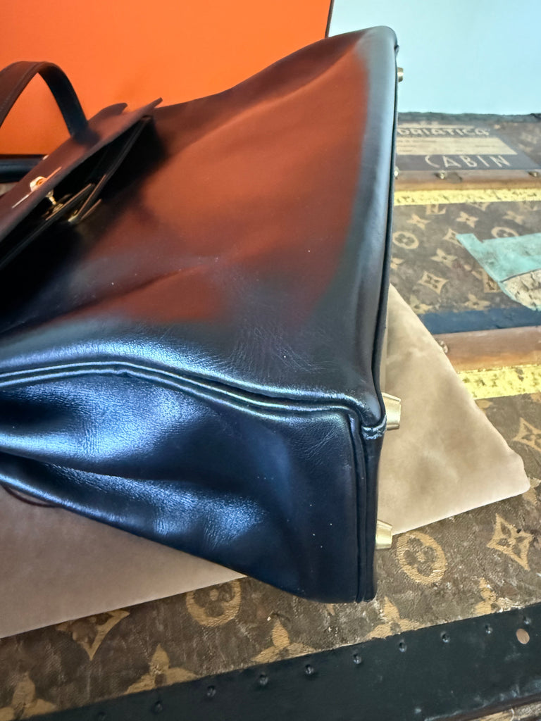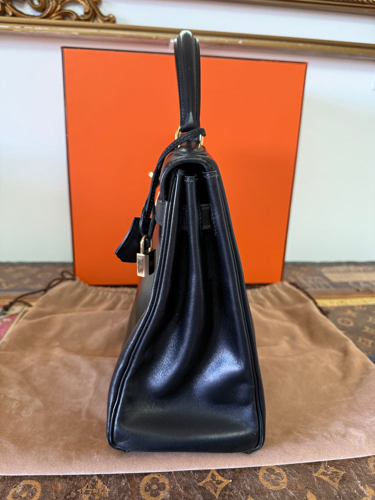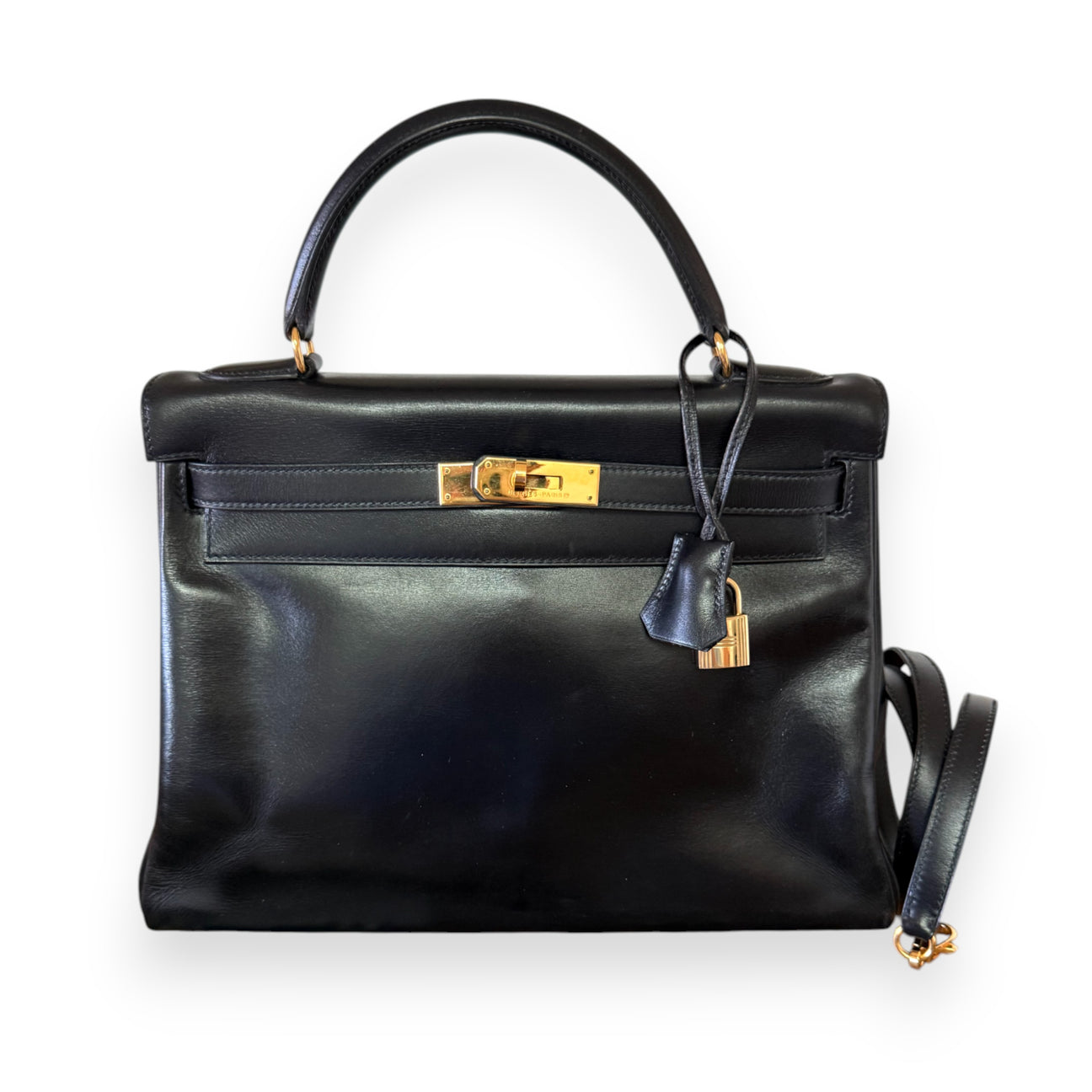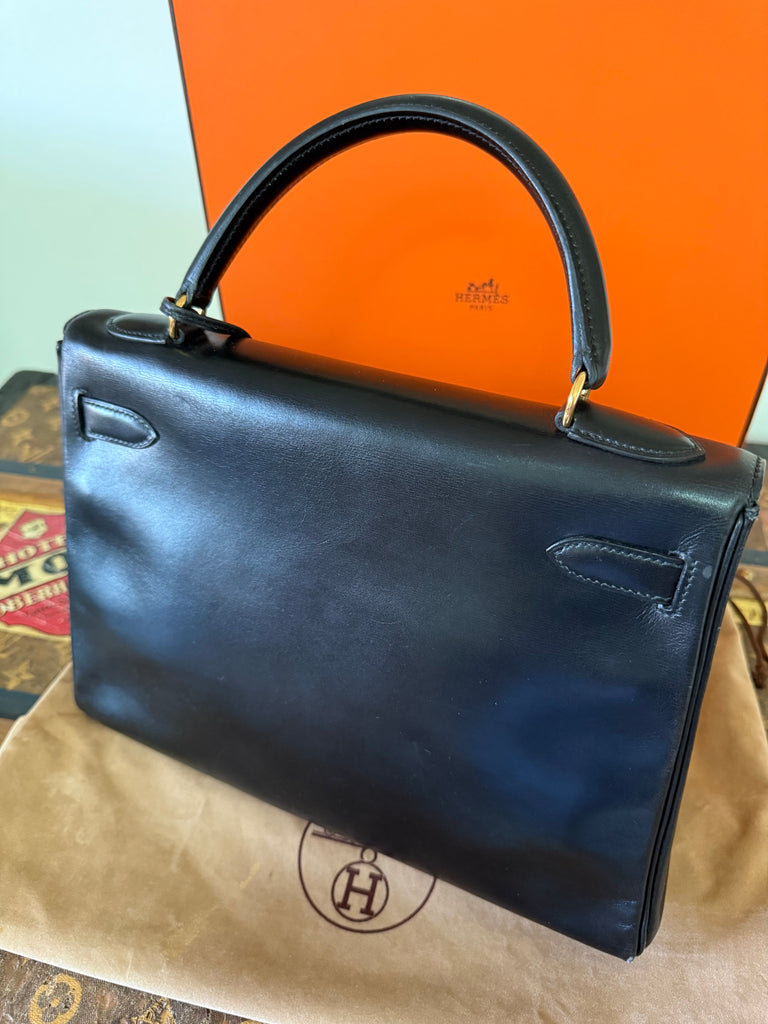 Borsa a mano e tracolla Hermès modello Kelly 32 in pellame Box colore nero, metalleria dorata. Vintage anno 1995, rara!