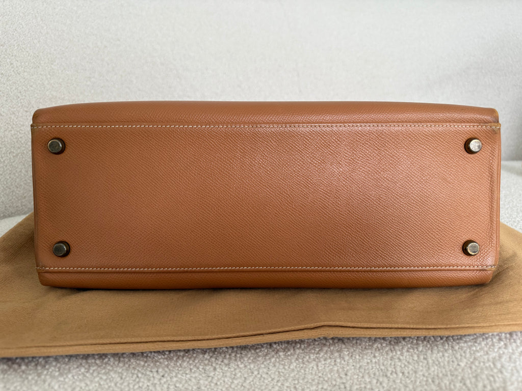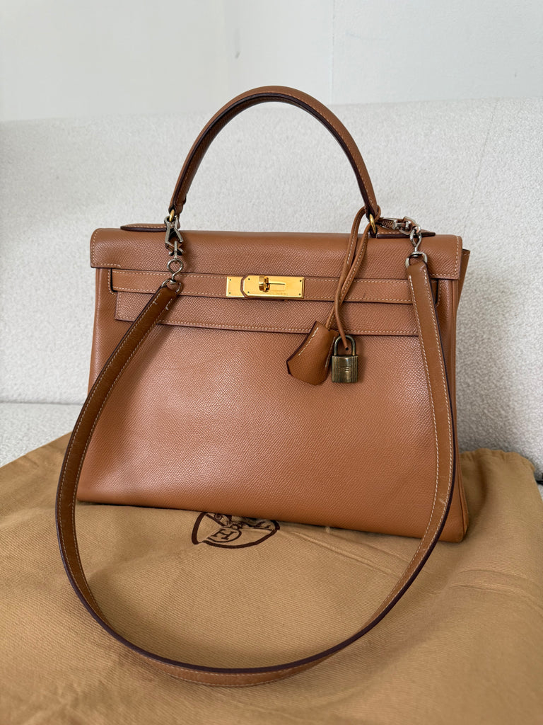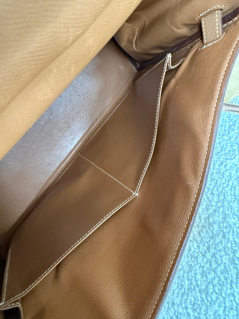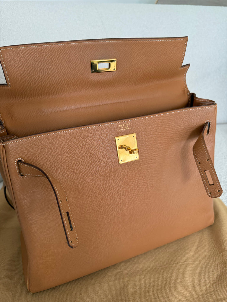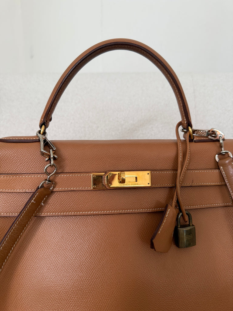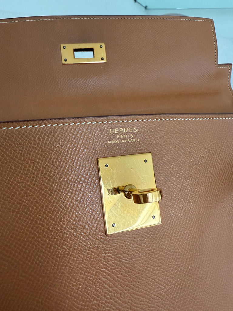 Borsa a mano con tracolla amovibile Hermès modello Kelly 32 in pellame Courchevel colore Naturelle. Dettagli metalleria color oro. Vintage anno 1986.