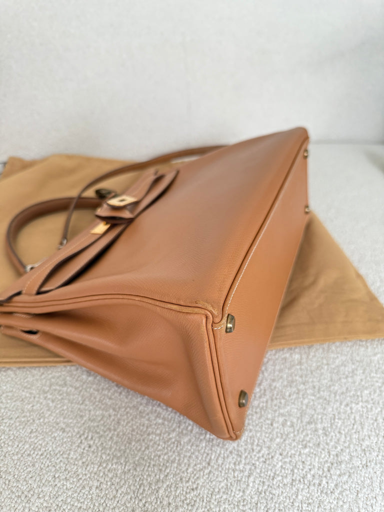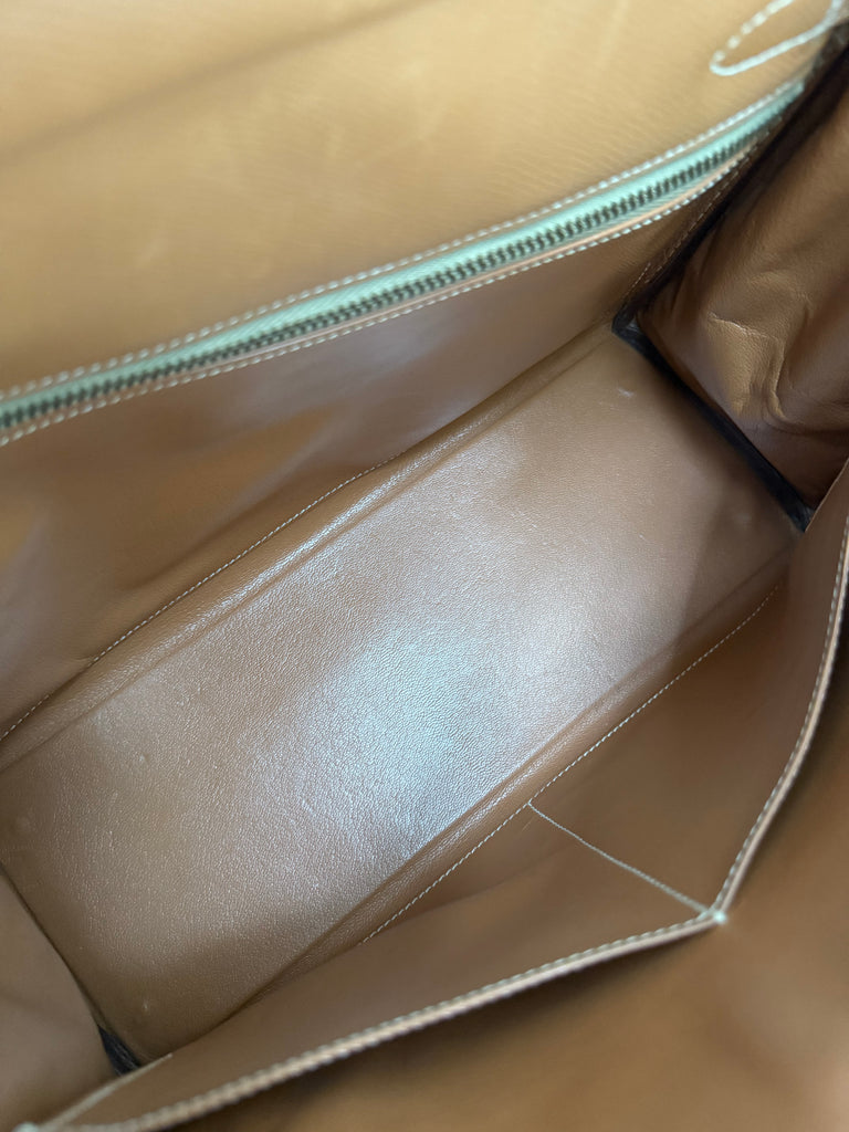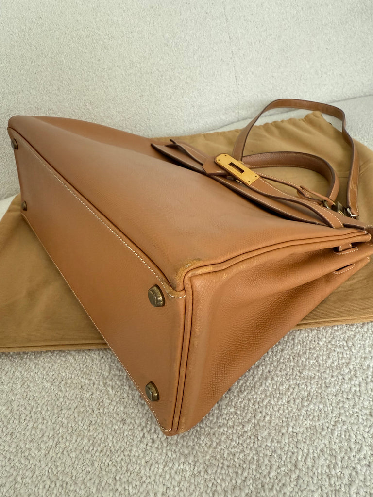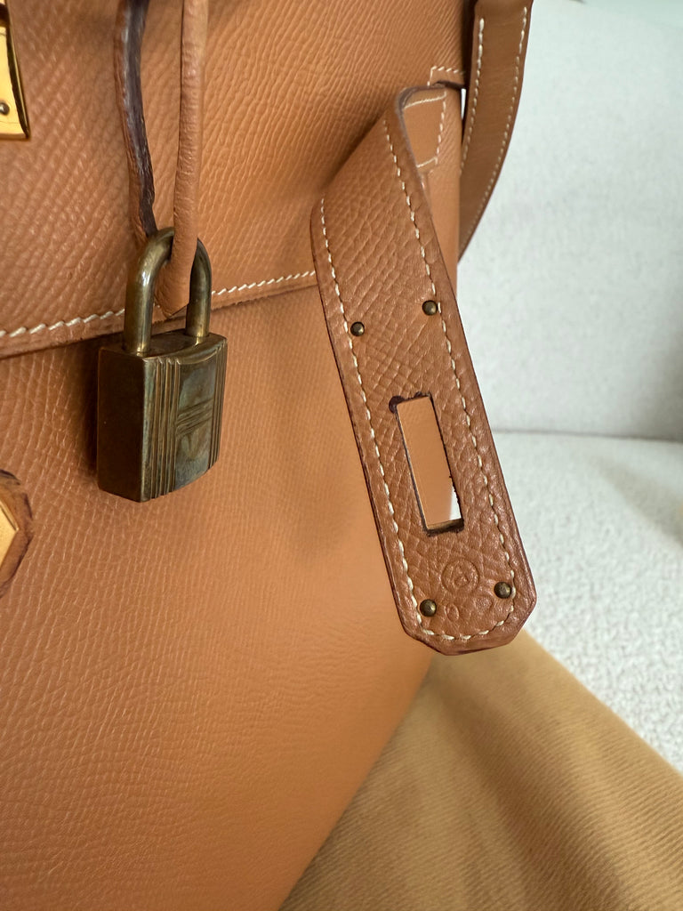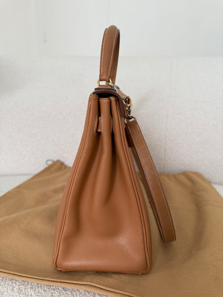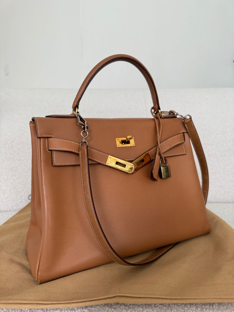Borsa a mano con tracolla amovibile Hermès modello Kelly 32 in pellame Courchevel colore Naturelle. Dettagli metalleria color oro. Vintage anno 1986.