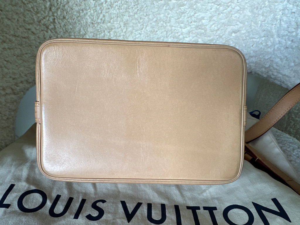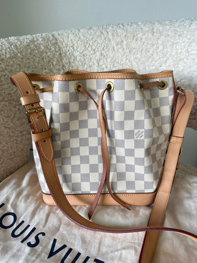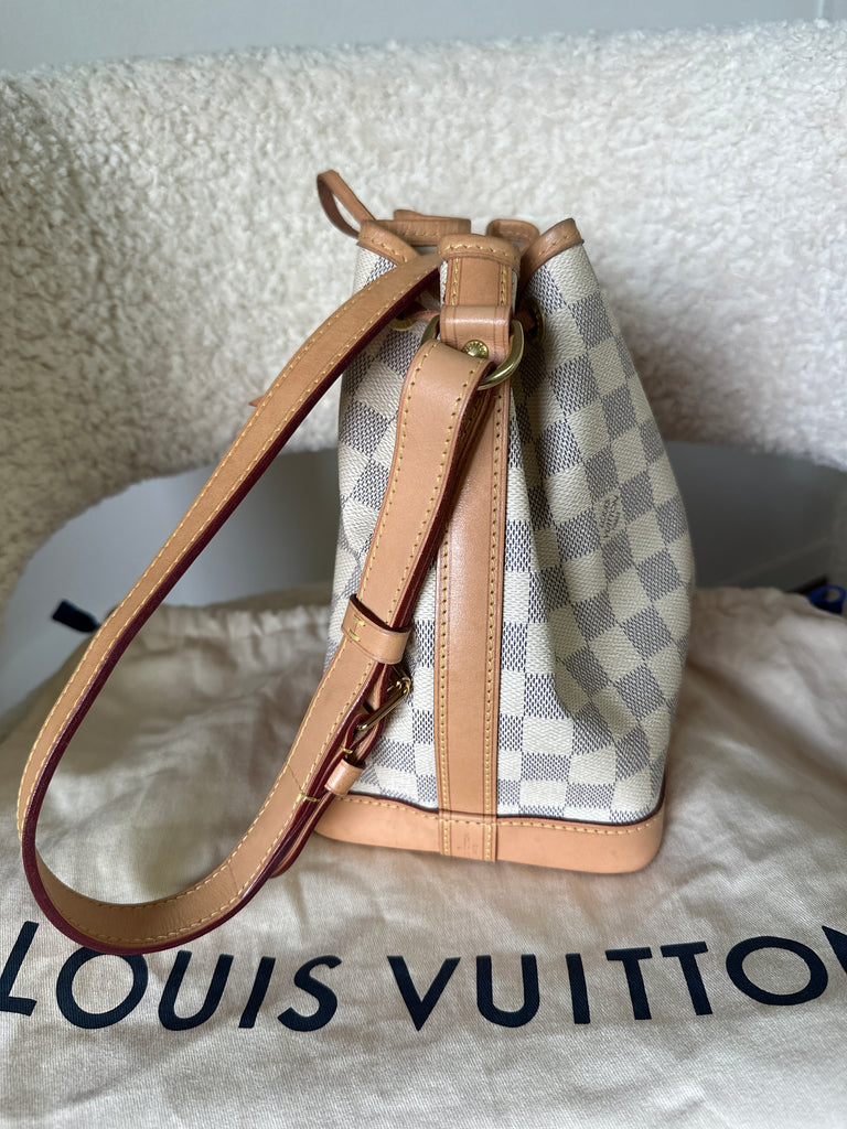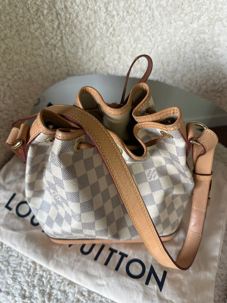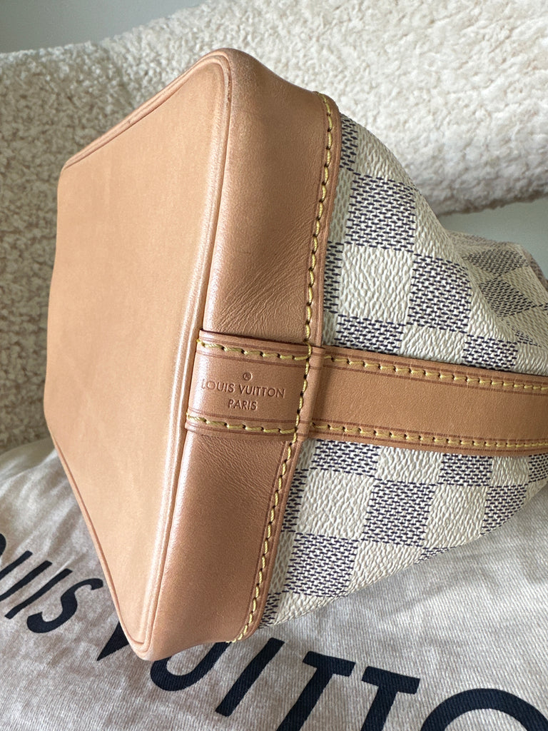 Borsa a secchiello Louis Vuitton modello Noè BB in tela Damier Azur e dotato di tracolla regolabile, dettagli in vacchetta naturale.